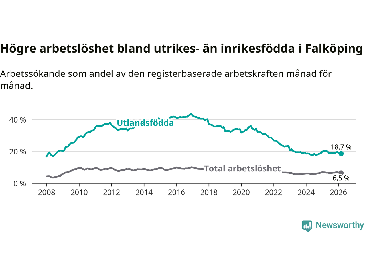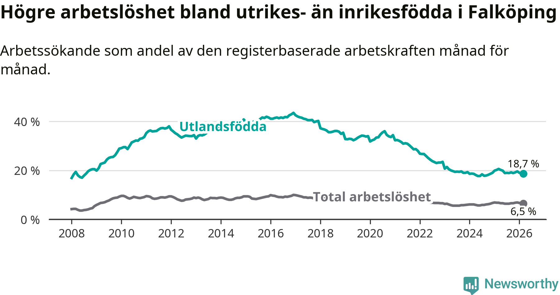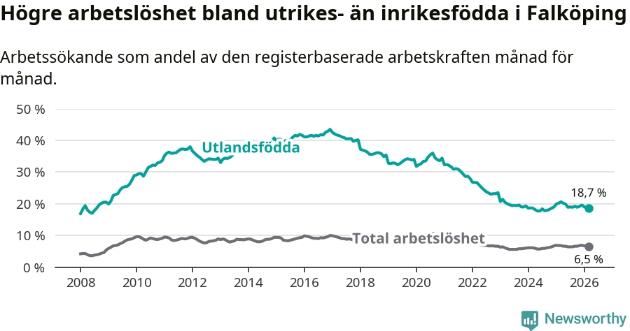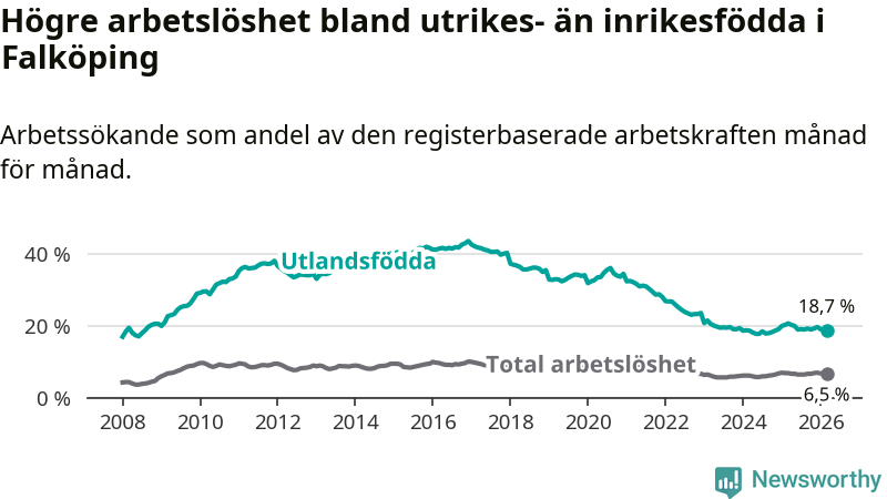 Skillnaden i arbetslöshet mellan utrikesfödda och hela befolkningen är 12,2 procentenheter i Falköping. Det är en betydligt mindre skillnad än för ett år sedan (−1,6 procentenheter).