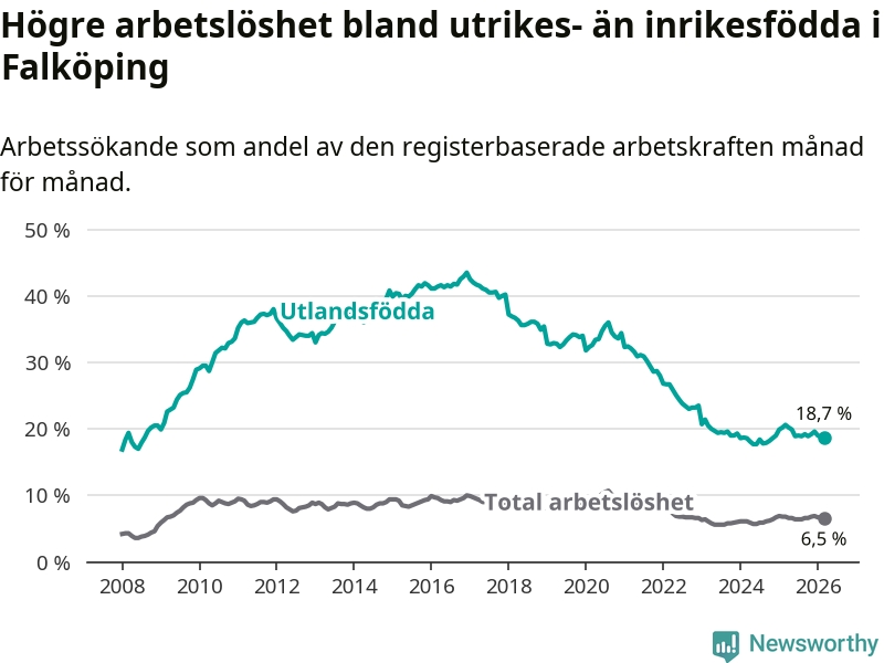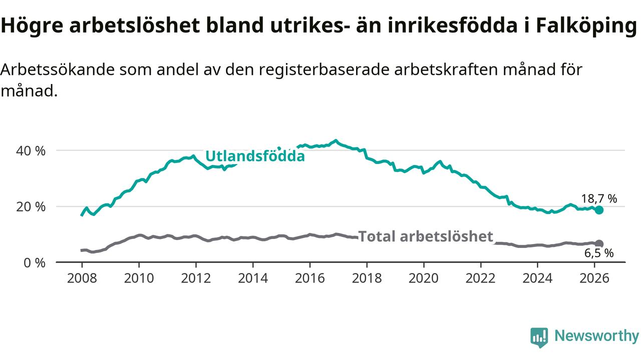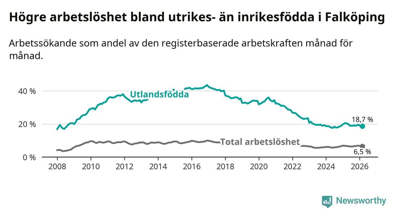 Arbetslösheten bland utlandsfödda var 18,7 procent i Falköping under mars månad, motsvarande 567 av 3 032 personer. Det är 1,9 procentenheter färre än vid samma tidpunkt i fjol (−53 om man räknar personer).