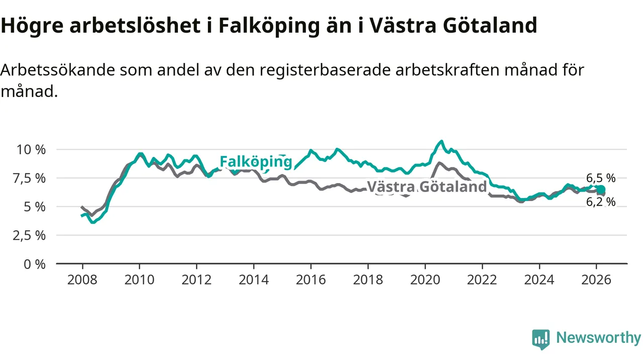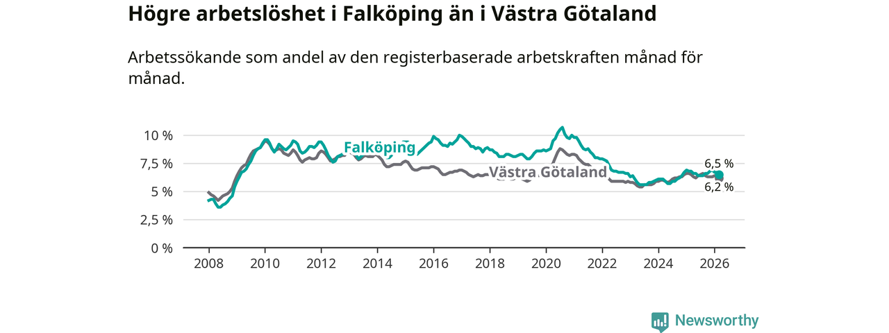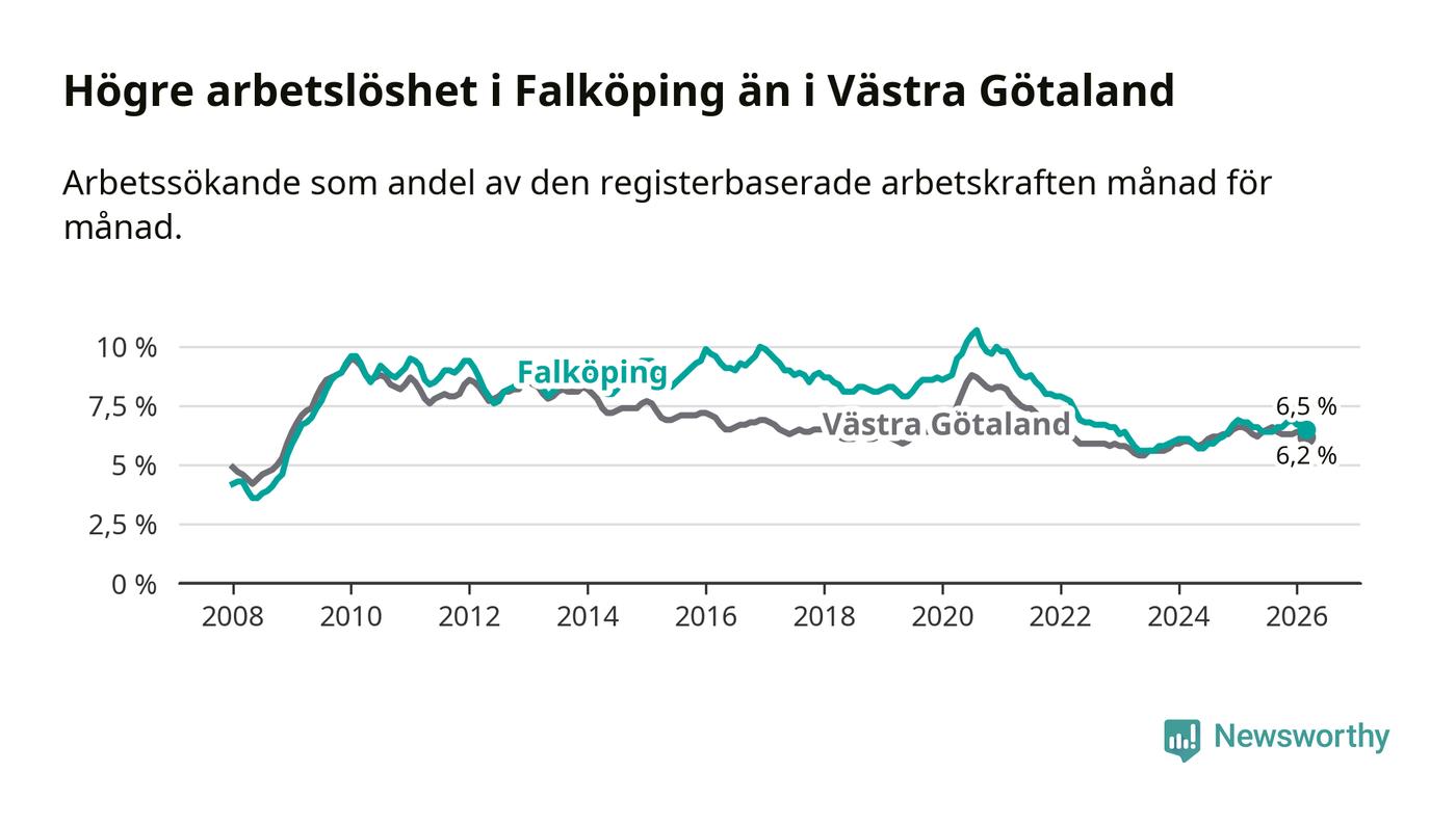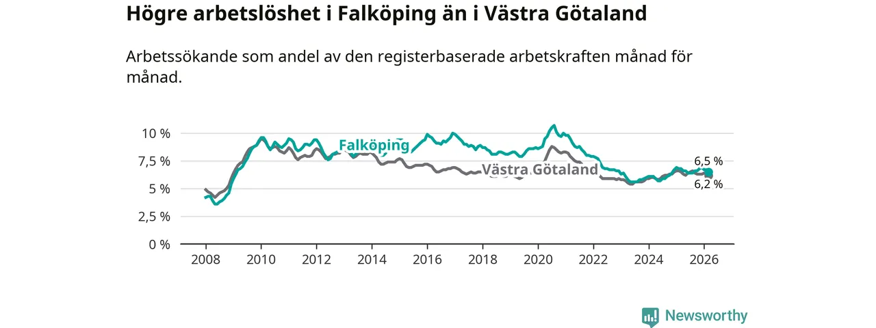 Under mars månad rapporterade Falköpings kommun en total arbetslöshet på 6,5 procent. Det är en minskning jämfört med samma tidpunkt i fjol (−0,3 procentenheter). Även i Västra Götalands län sjunker arbetslösheten .