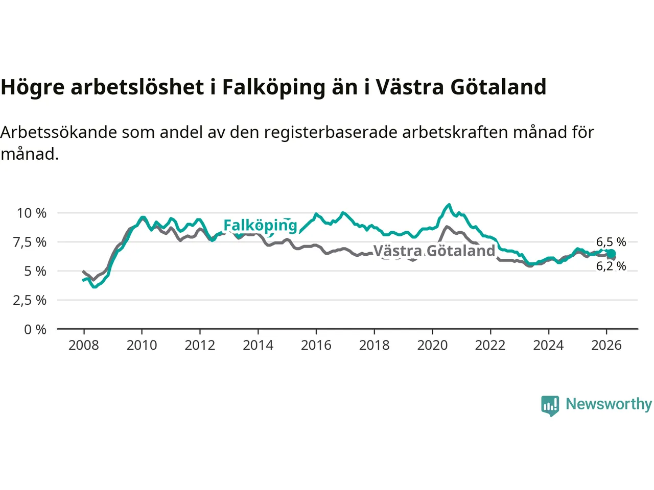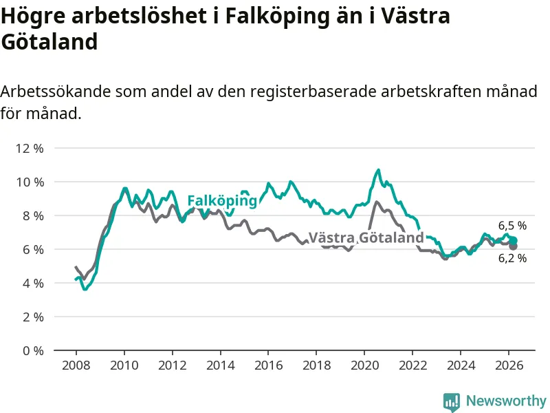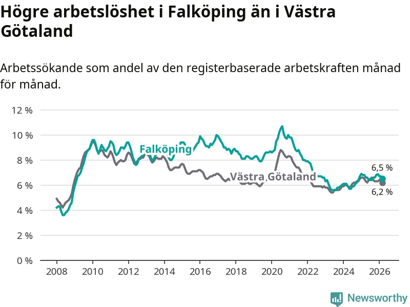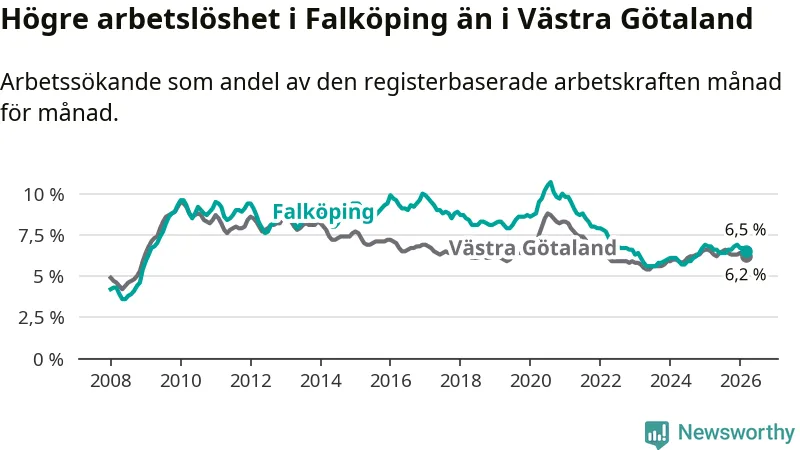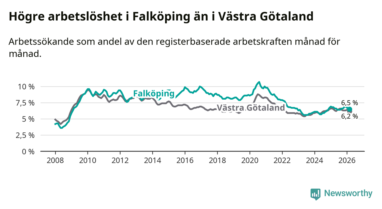 Under mars månad rapporterade Falköpings kommun en total arbetslöshet på 6,5 procent. Det är en minskning jämfört med samma tidpunkt i fjol (−0,3 procentenheter). Även i Västra Götalands län sjunker arbetslösheten .
