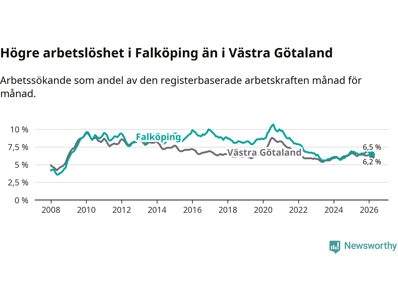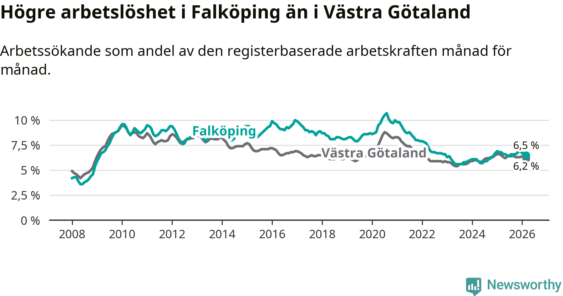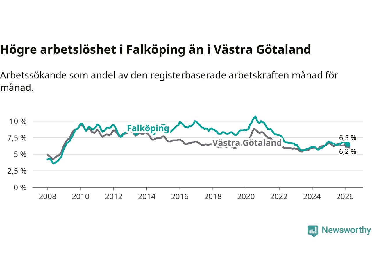 Graf: Arbetslöshet i Falköpings kommun och Västra Götalands län