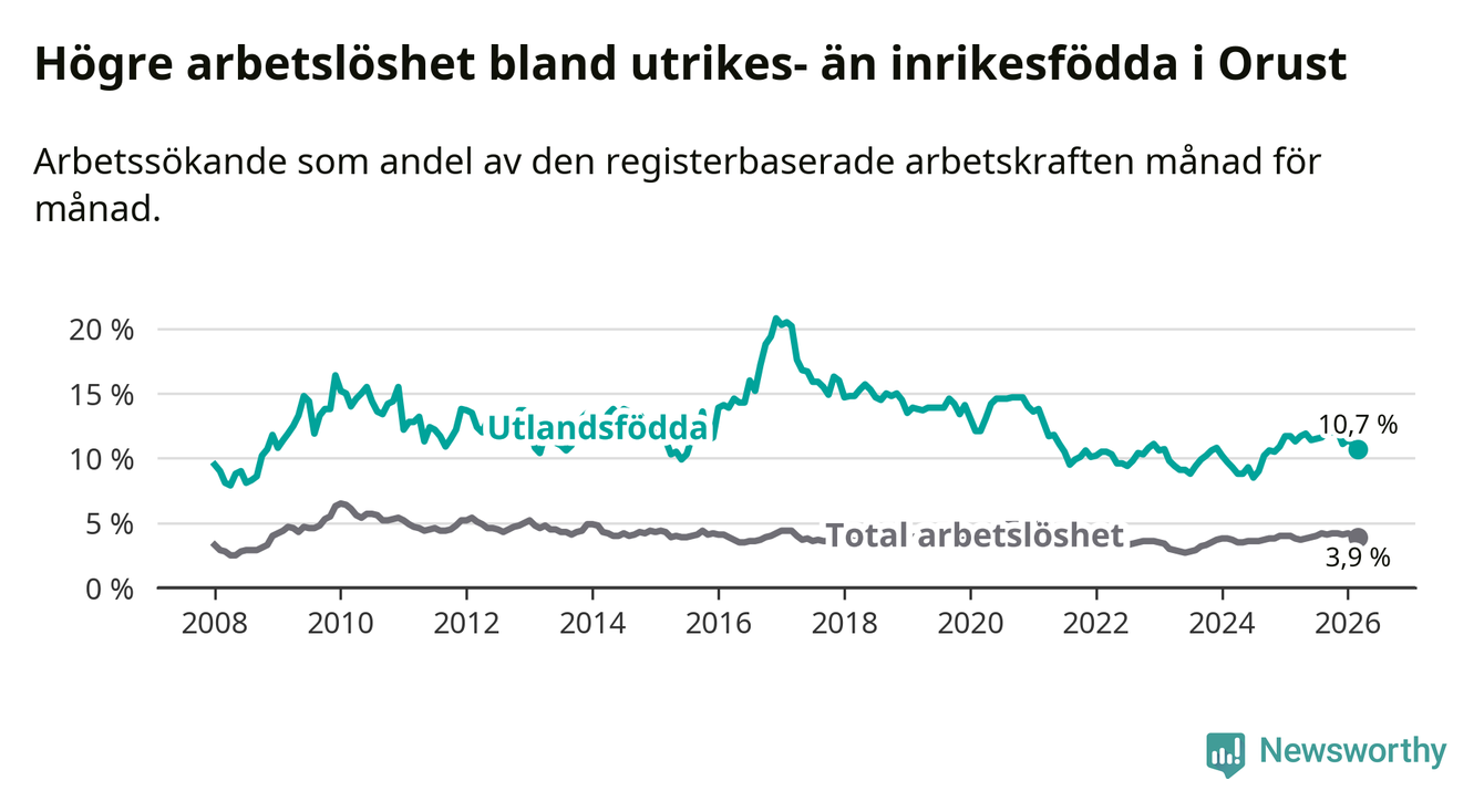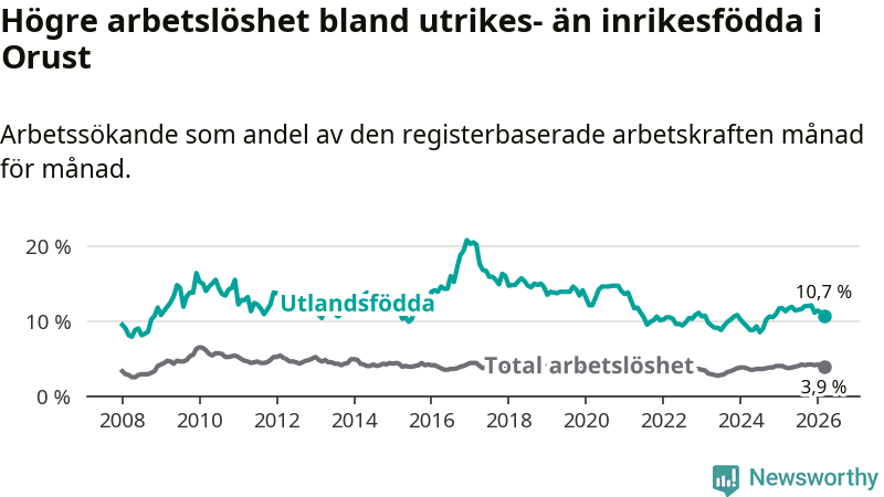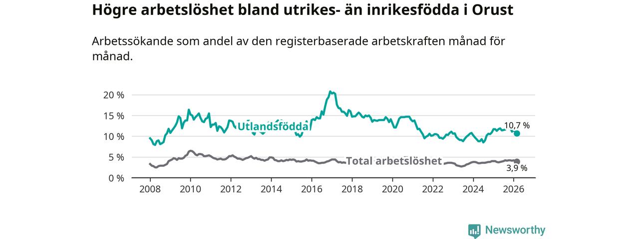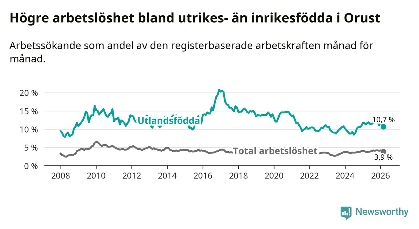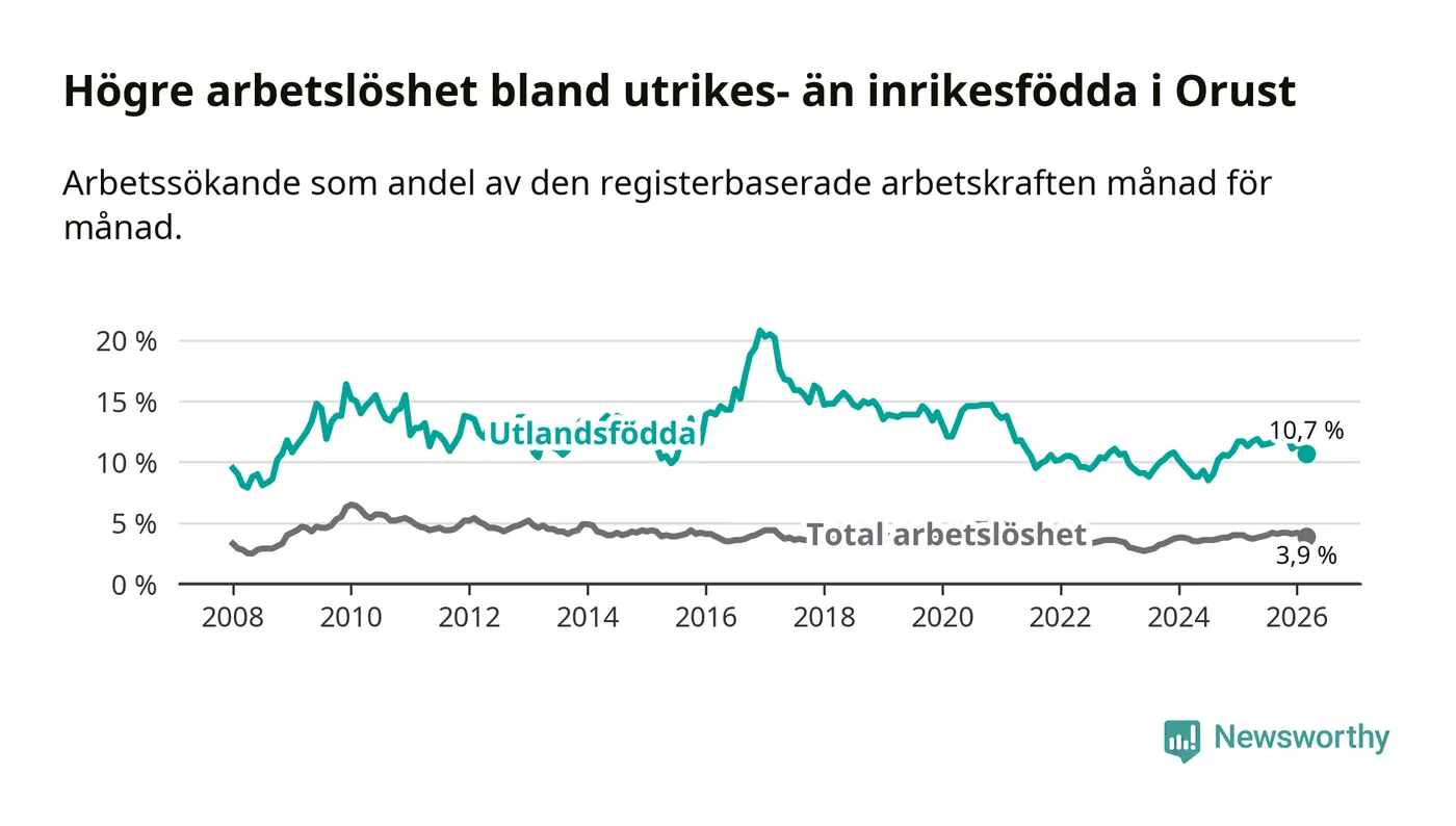 Skillnaden i arbetslöshet mellan utrikesfödda och hela befolkningen är 6,8 procentenheter på Orust. Det är en mindre skillnad än för ett år sedan (−0,7 procentenheter).
