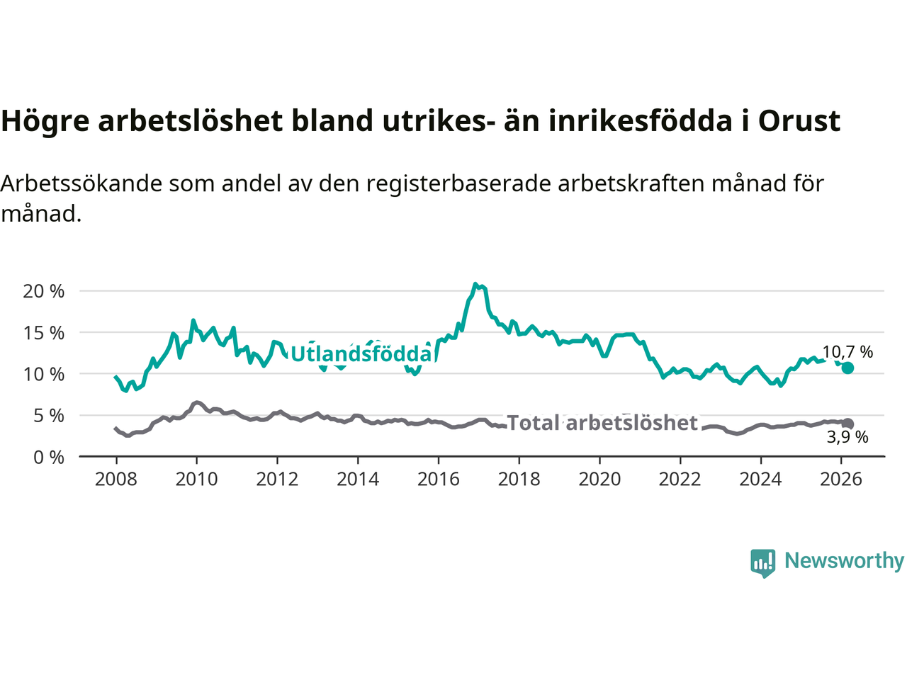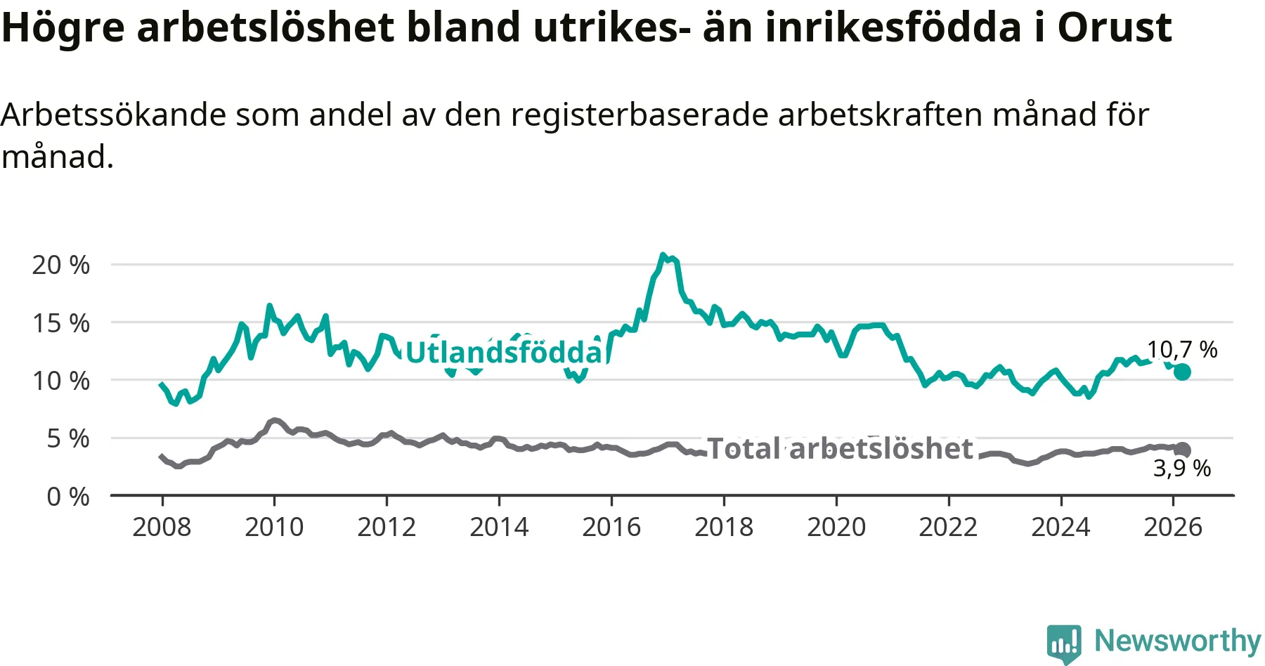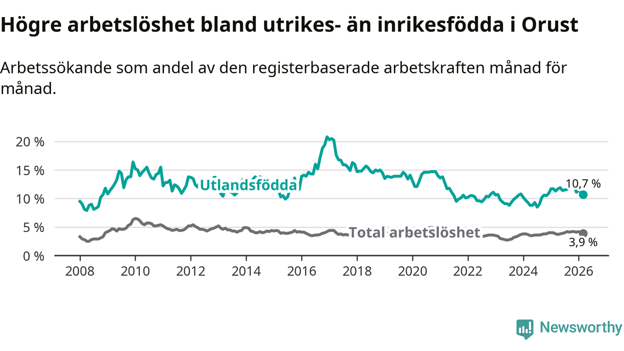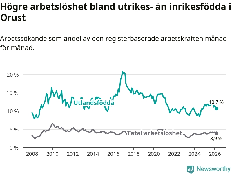 Skillnaden i arbetslöshet mellan utrikesfödda och hela befolkningen är 6,8 procentenheter på Orust. Det är en mindre skillnad än för ett år sedan (−0,7 procentenheter).
