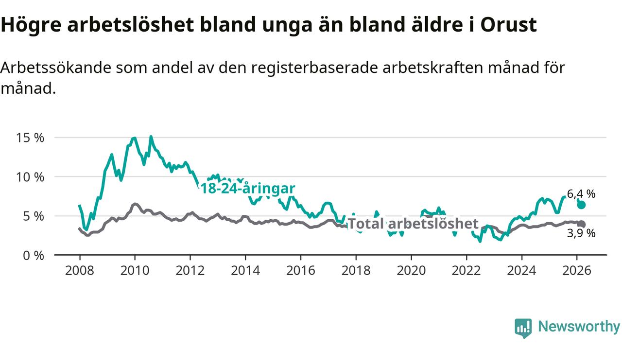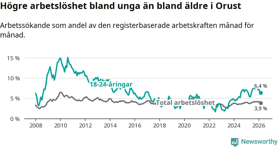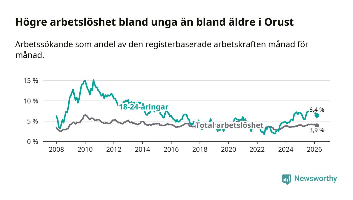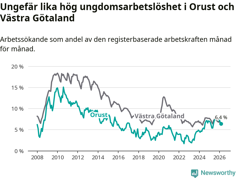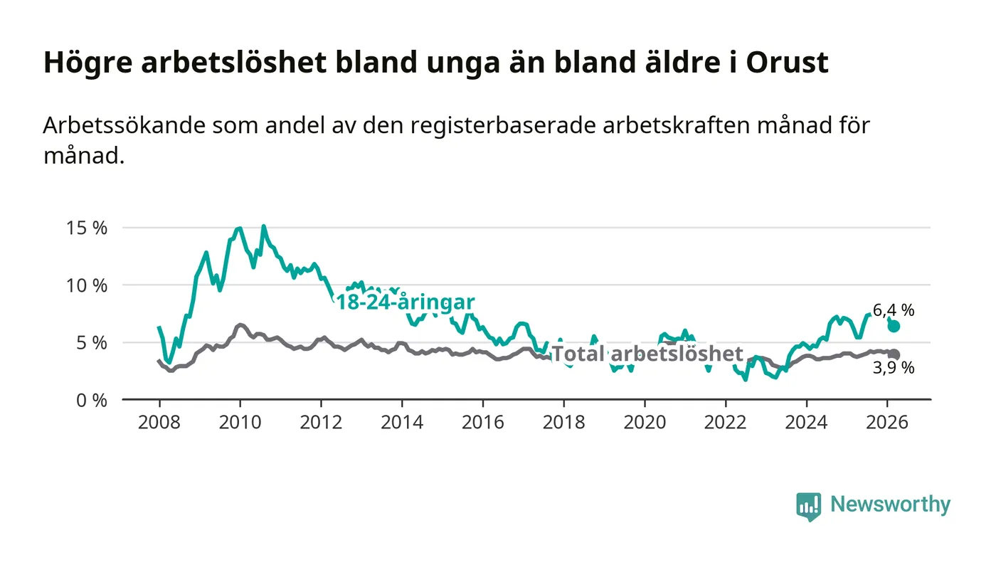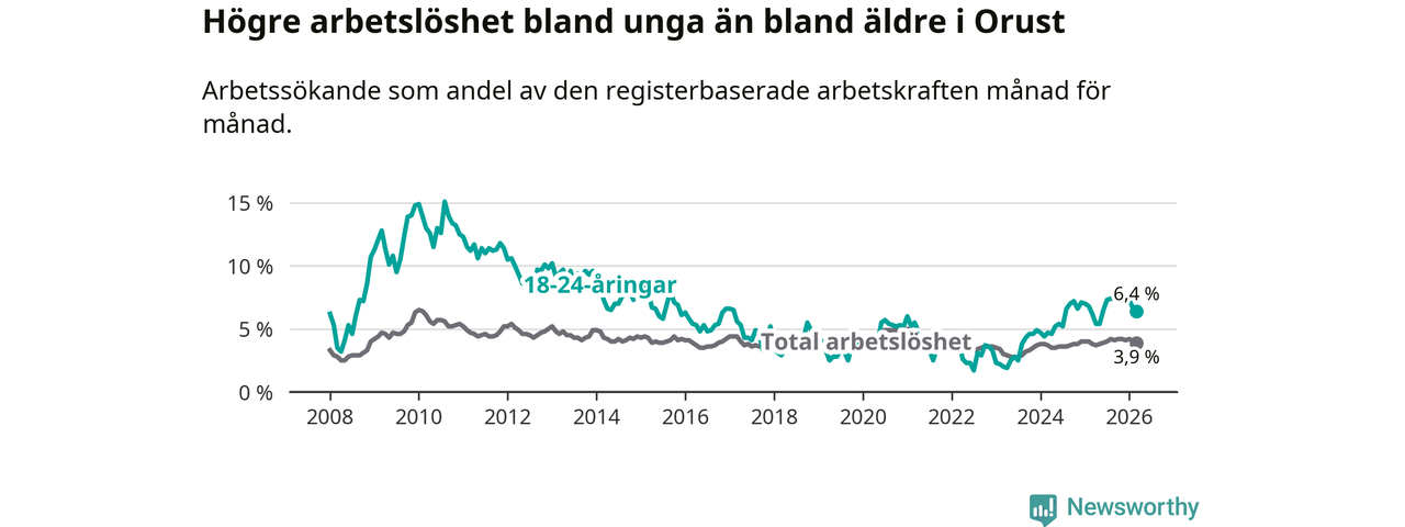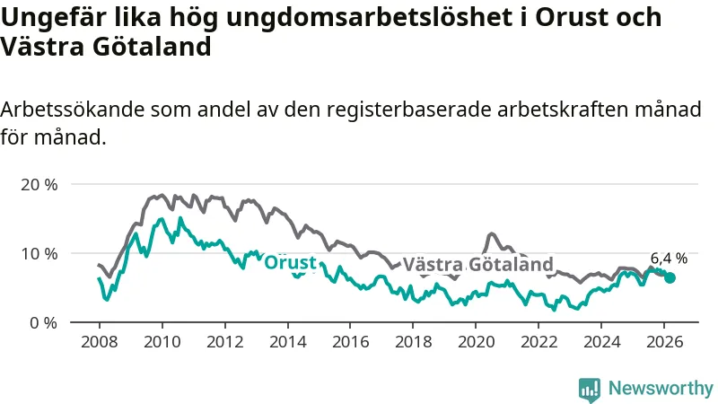 Medan Orust har lägre total arbetslöshet än Västra Götaland, ligger ungdomsarbetslösheten på i stort sett samma nivå.