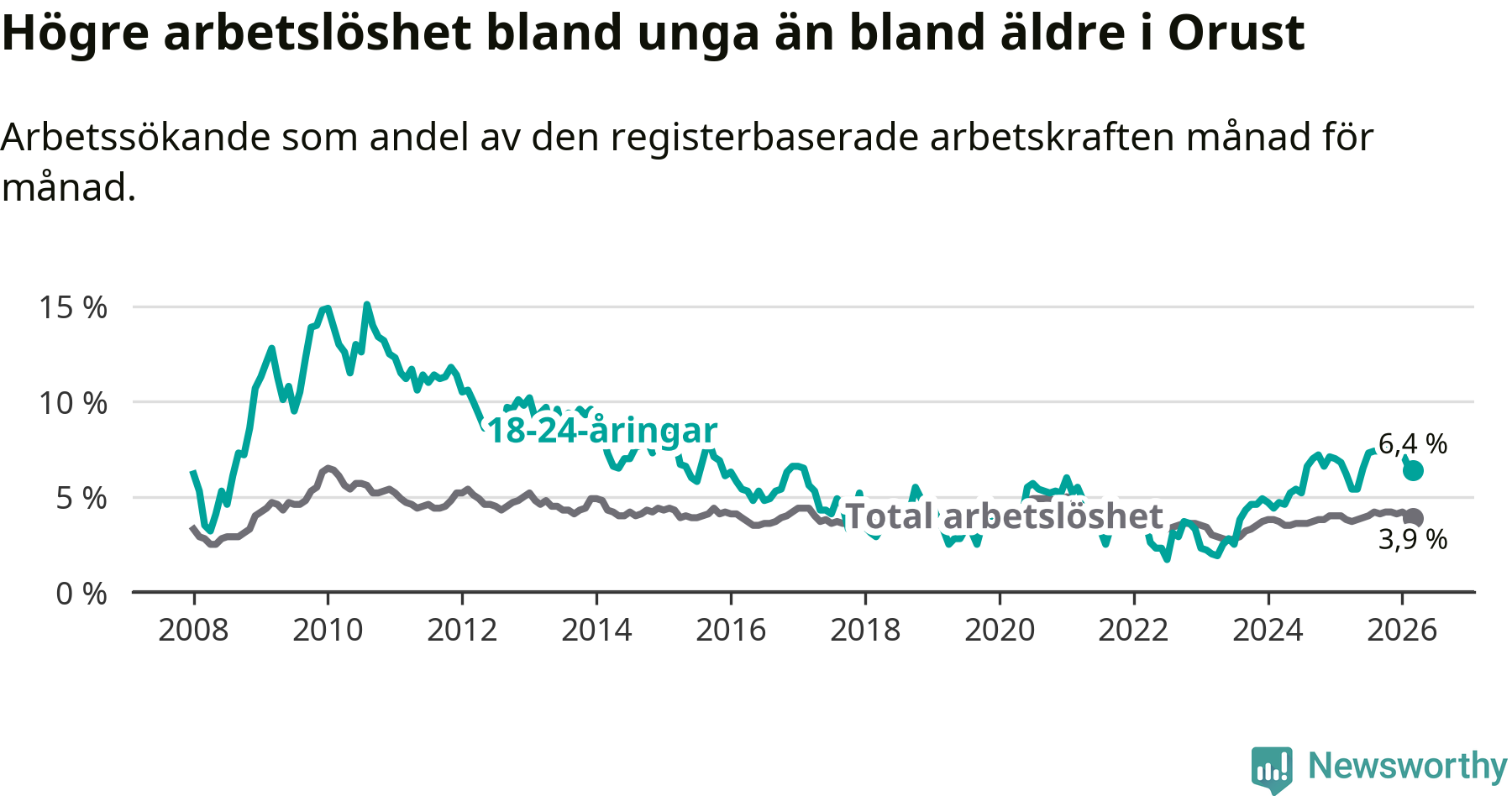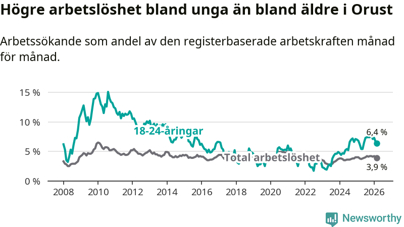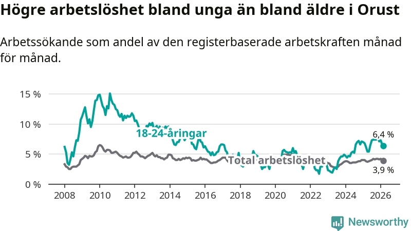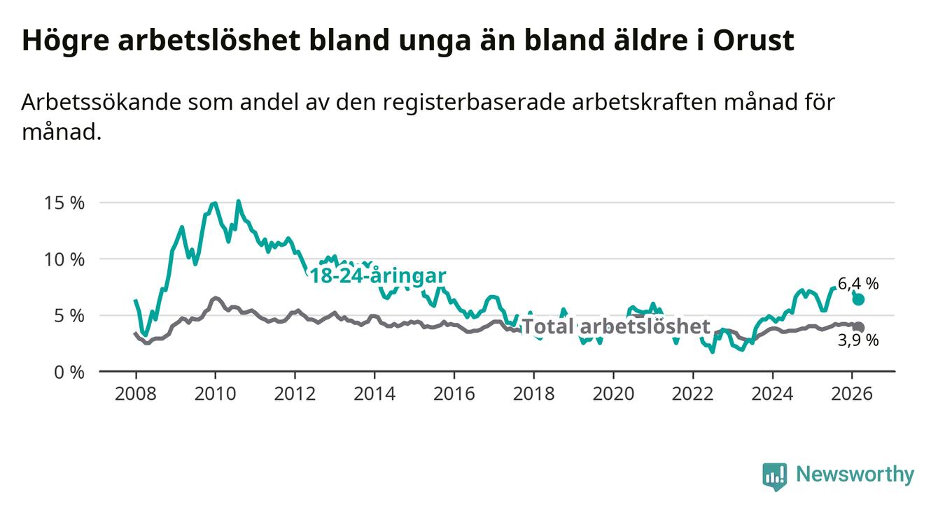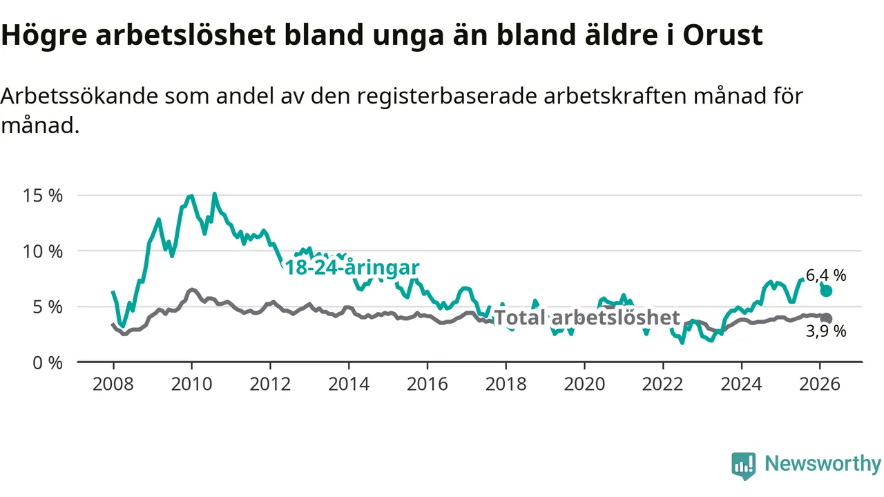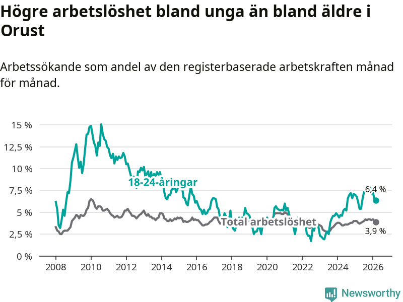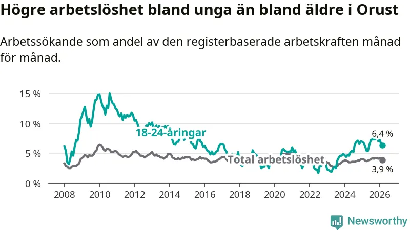 Medan Orust har lägre total arbetslöshet än Västra Götaland, ligger ungdomsarbetslösheten på i stort sett samma nivå.
