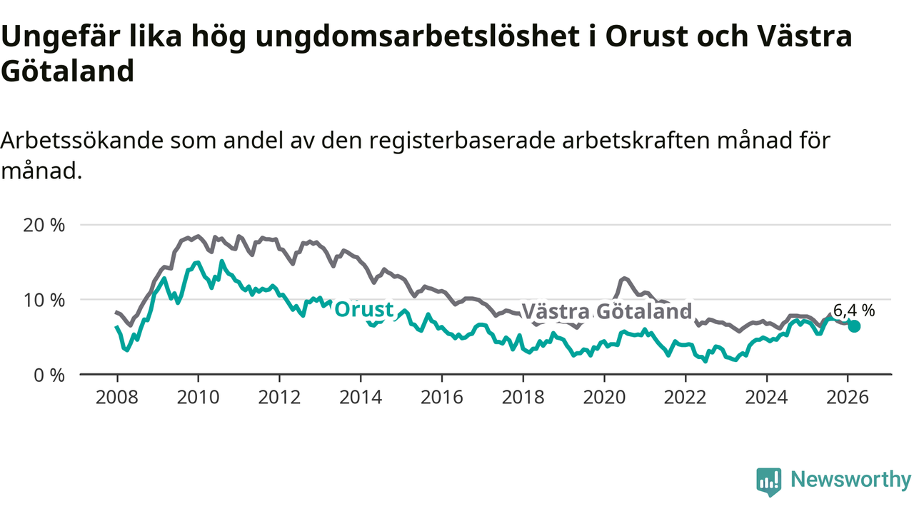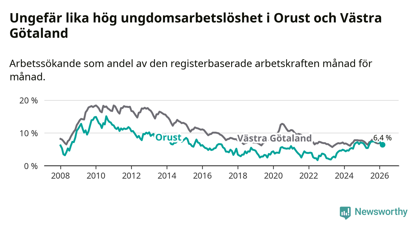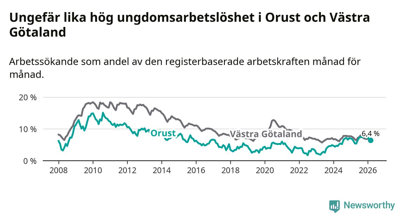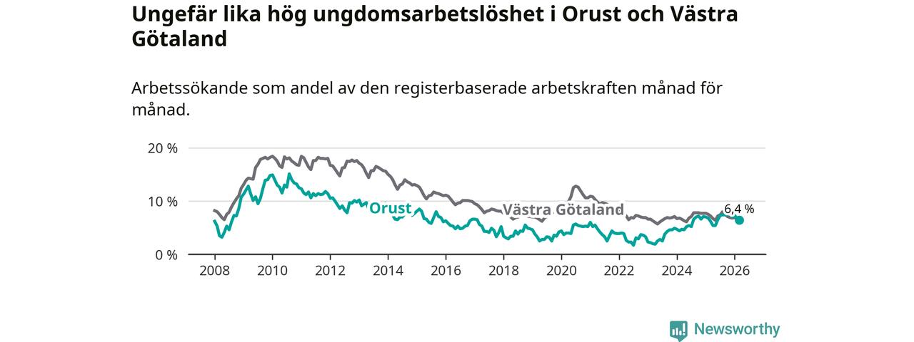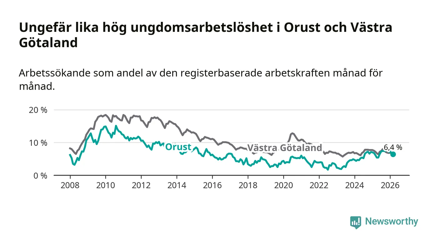 Graf: Arbetslöshet bland unga i Orusts kommun och Västra Götalands län