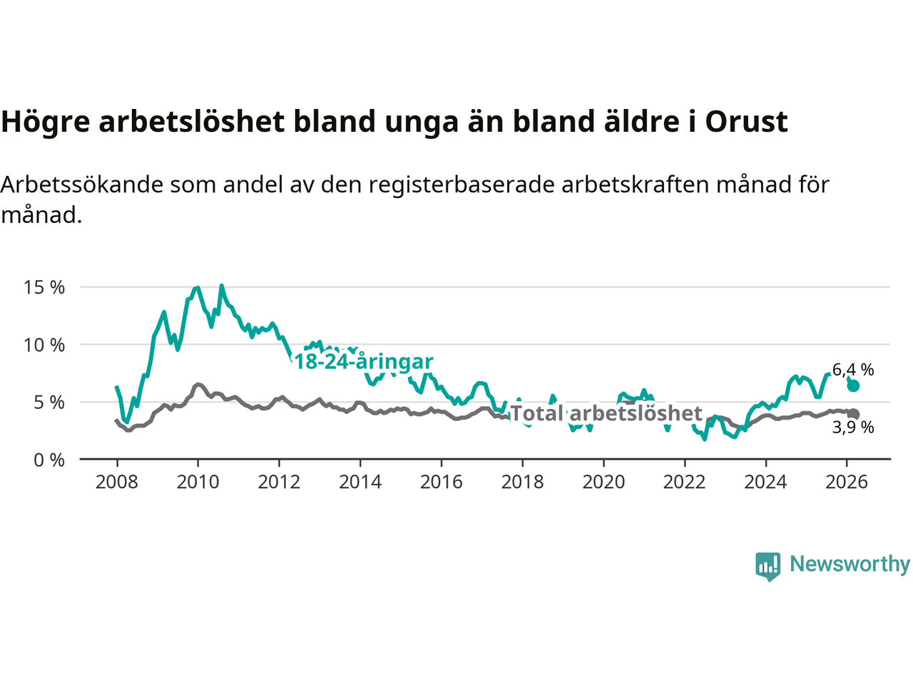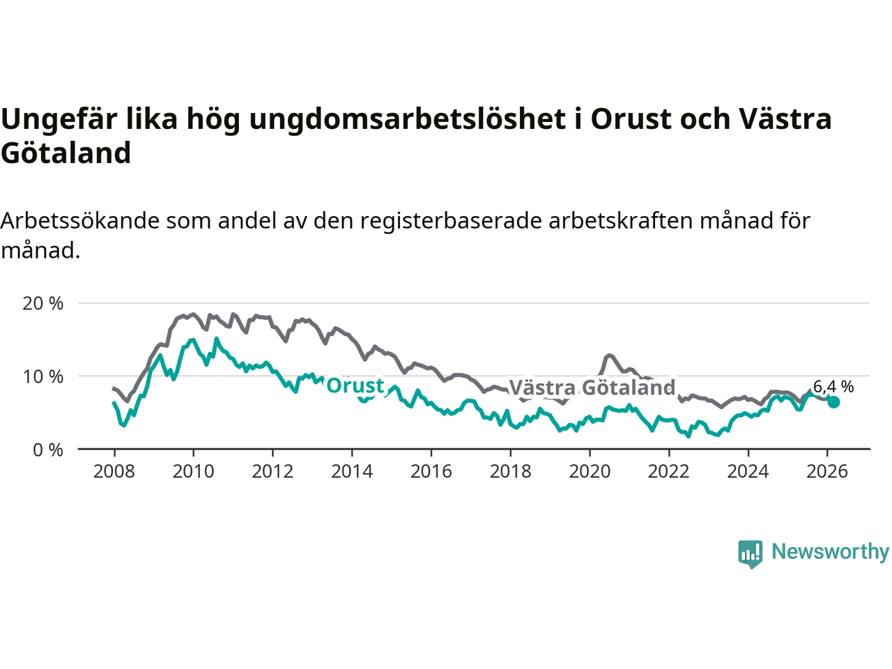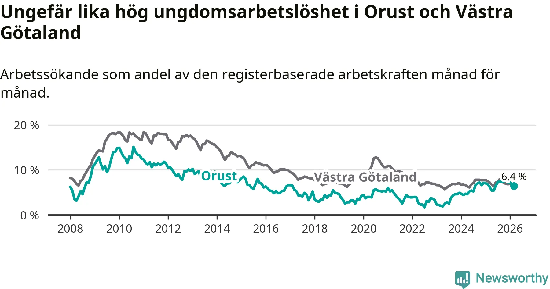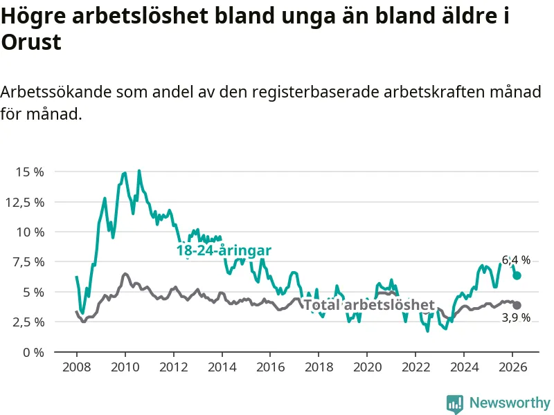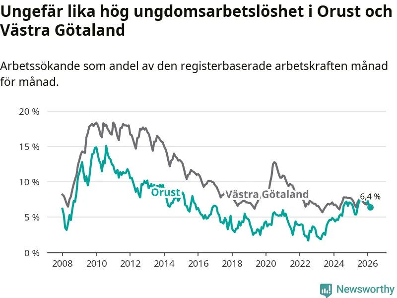 Graf: Arbetslöshet bland unga i Orusts kommun och Västra Götalands län
