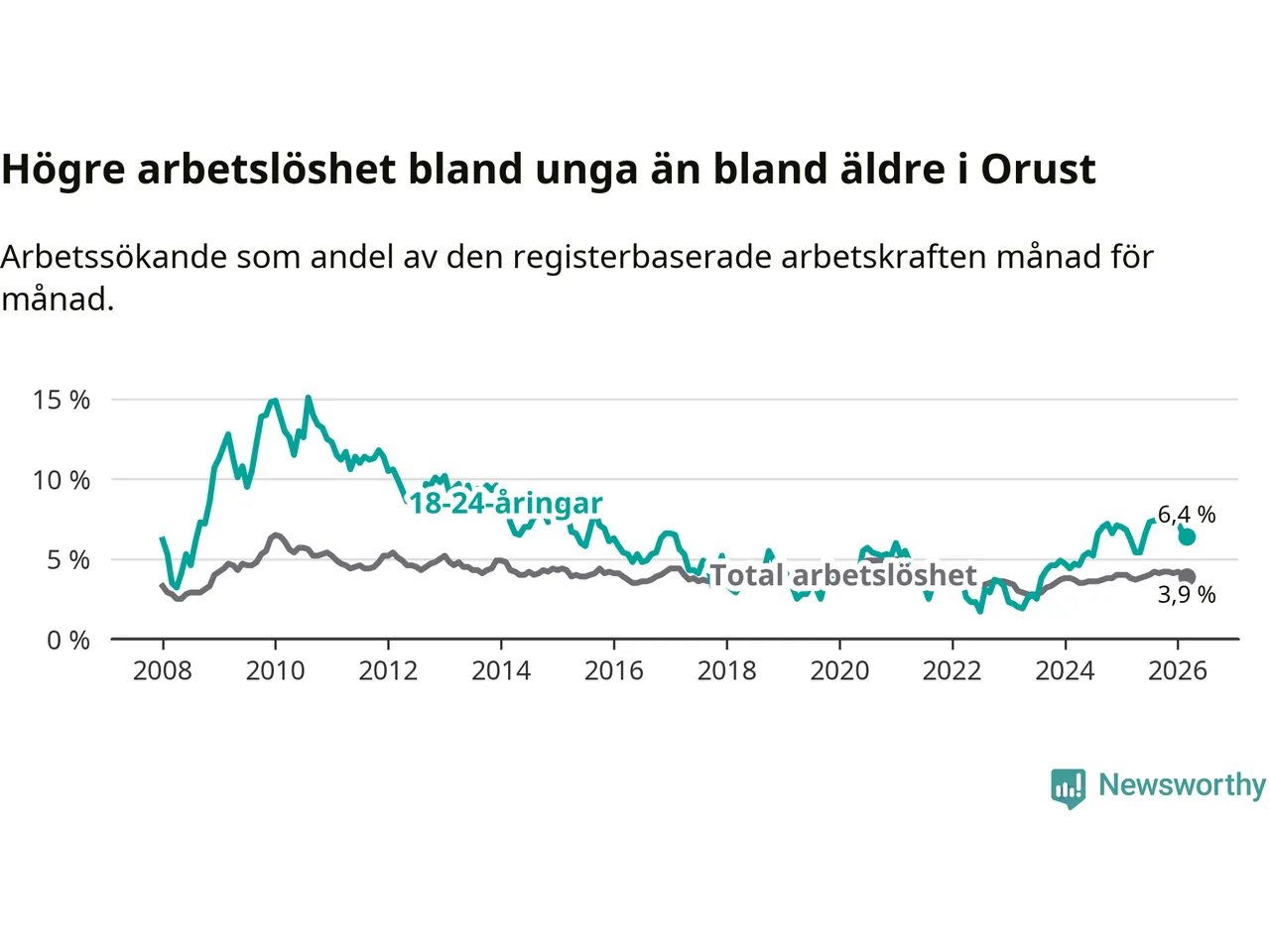 Precis som den totala arbetslösheten stiger arbetslösheten bland unga (+0,2 procentenheter). I mars var 6,4 procent av 18–24-åringarna inskrivna som arbetssökande (motsvarande 40 personer). Mäter vi antalet inskrivna ser vi en ökning med ett personer på ett års sikt.