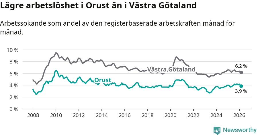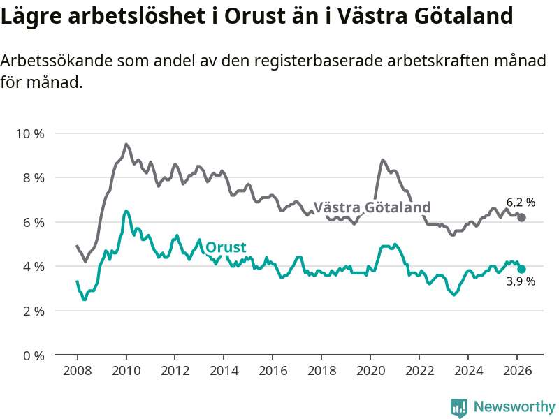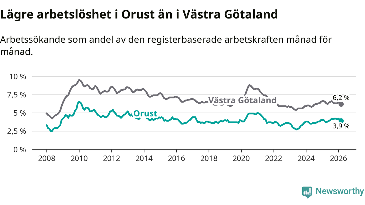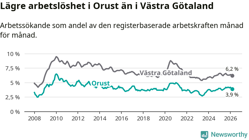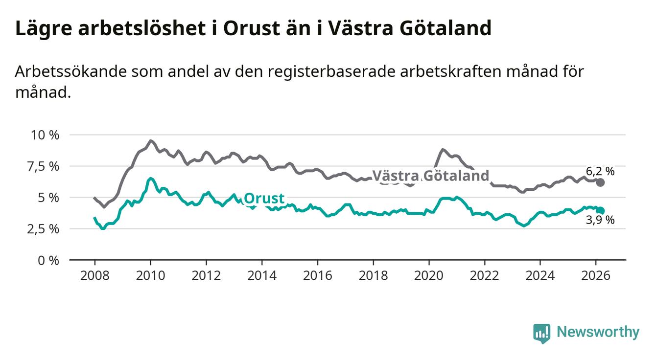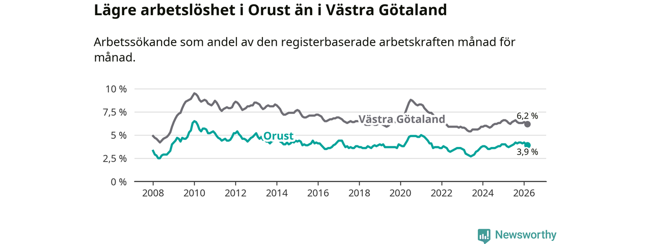 Orust går därmed mot strömmen i förhållande till andra kommuner i Västra Götalands län. I de flesta andra kommuner i länet går arbetslösheten nedåt. Störst är minskningen i Åmål, där arbetslösheten sjunker med 1,6 procentenheter. I tabellen längre ner ser du utvecklingen i samtliga kommuner i länet.