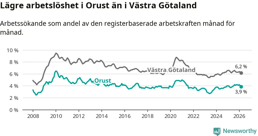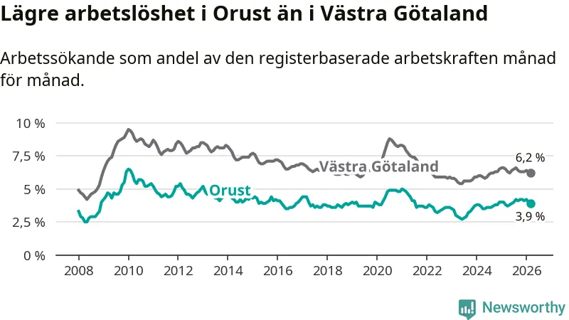 Även om arbetslösheten på Orust alltså ökar, så ligger den fortfarande under snittet i hela Västra Götalands län (3,9 procent i kommunen, jämfört med 6,2 procent i hela länet). Öckerö har den lägsta arbetslösheten i länet (2,6 procent), medan Gullspång har den högsta (8,1 procent). För att Orust skulle komma ner i samma arbetslöshetsnivå som Öckerö skulle 89 personer behöva sysselsättas.