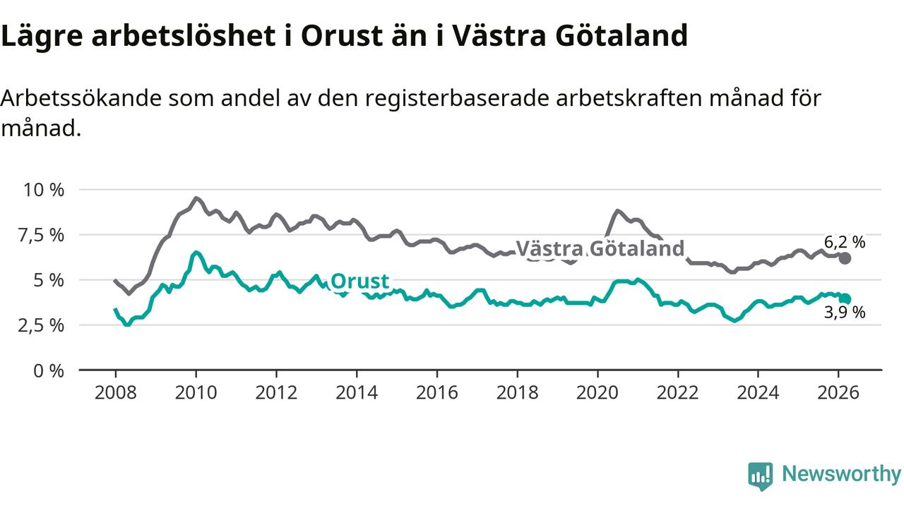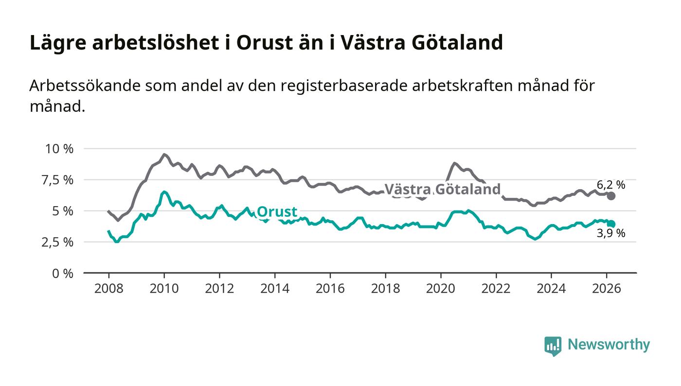 Under mars månad rapporterade Orusts kommun en total arbetslöshet på 3,9 procent. Det är en ökning jämfört med samma tidpunkt i fjol (+0,1 procentenheter). I Västra Götalands län däremot sjunker arbetslösheten .