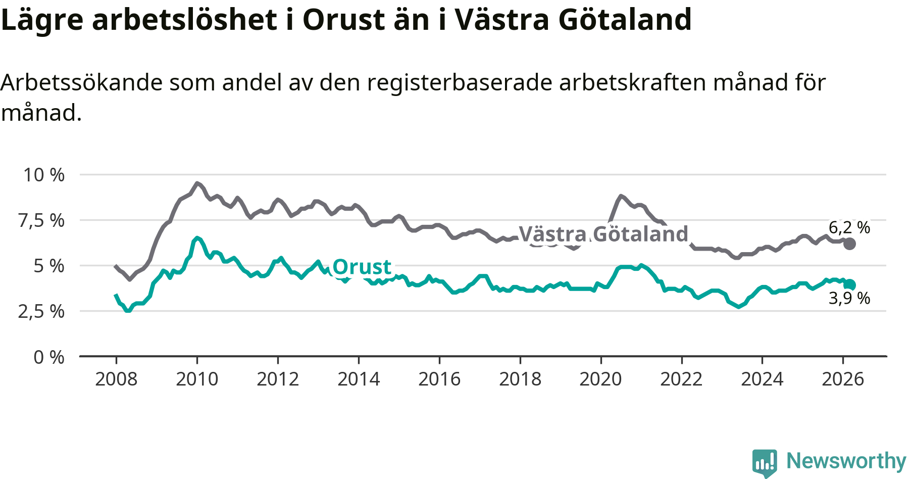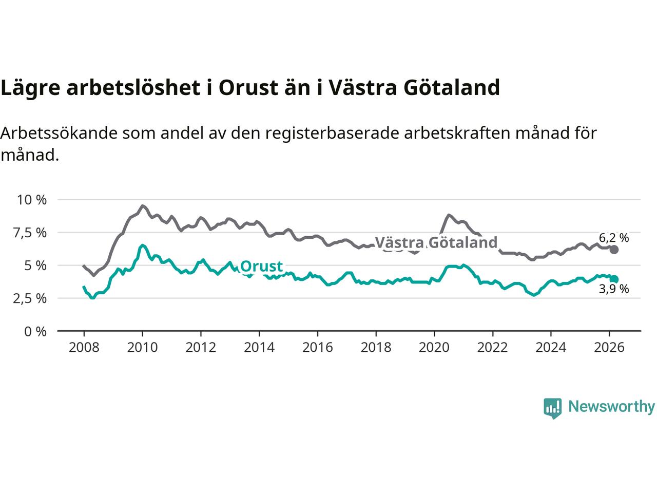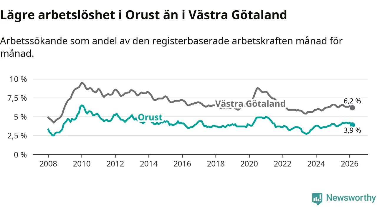 Graf: Arbetslöshet i Orusts kommun och Västra Götalands län
