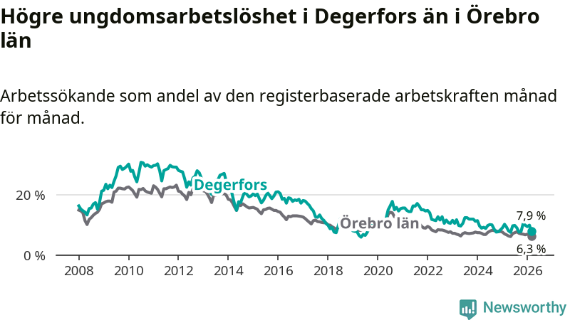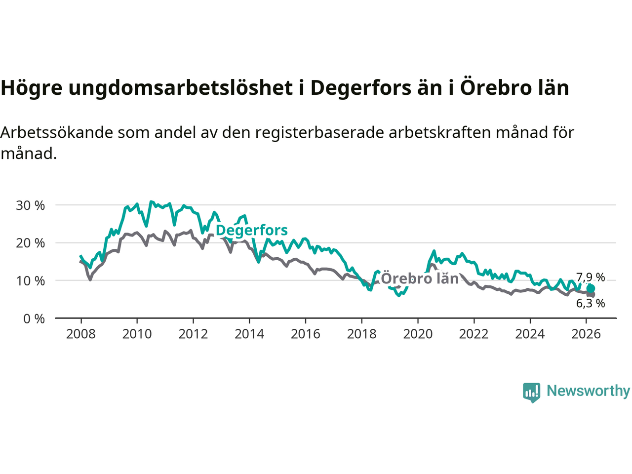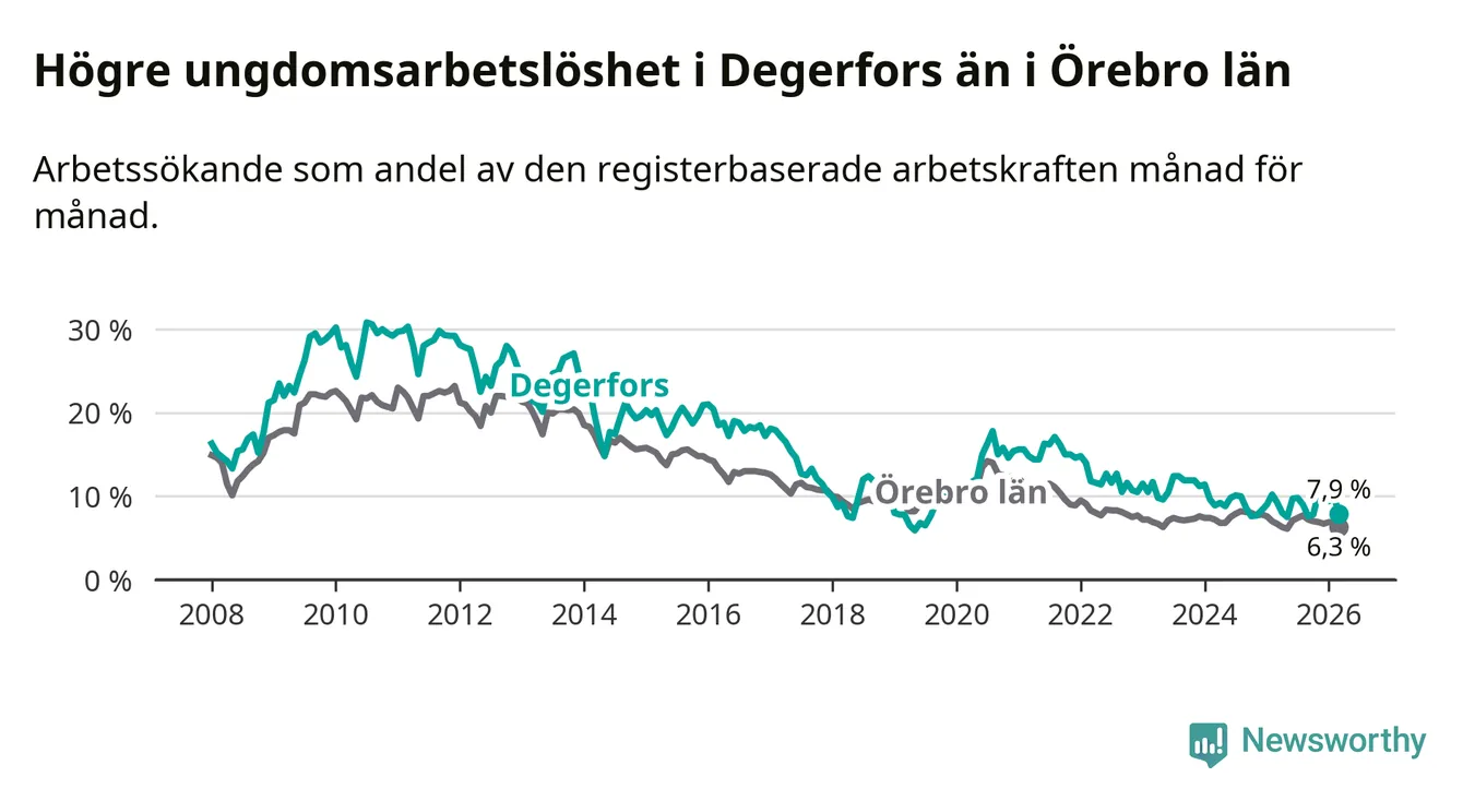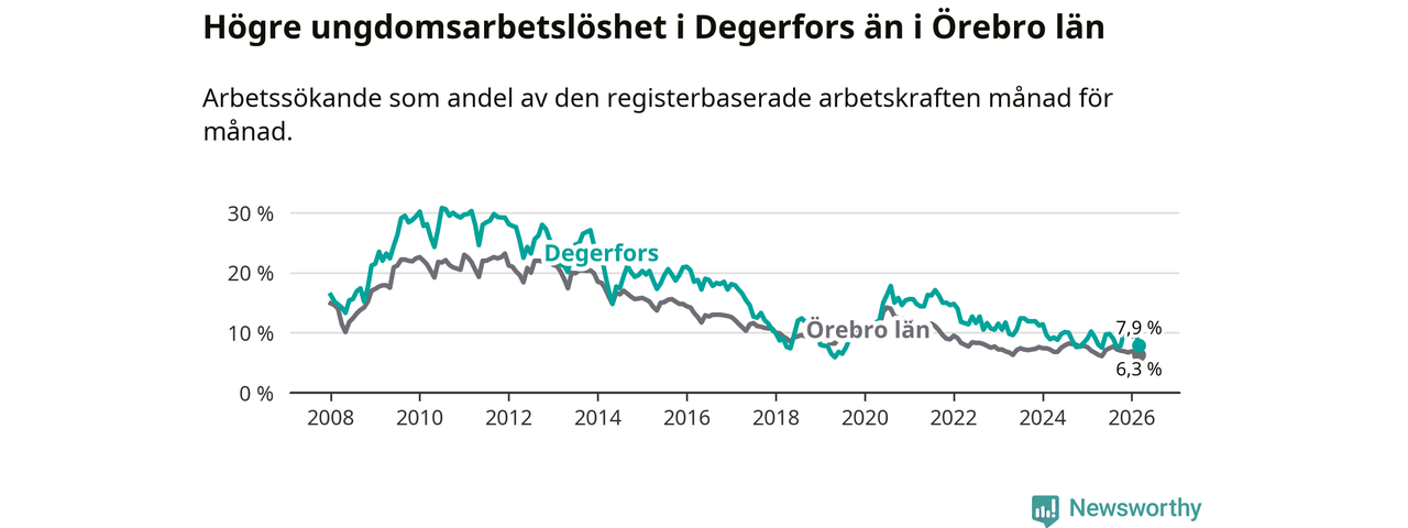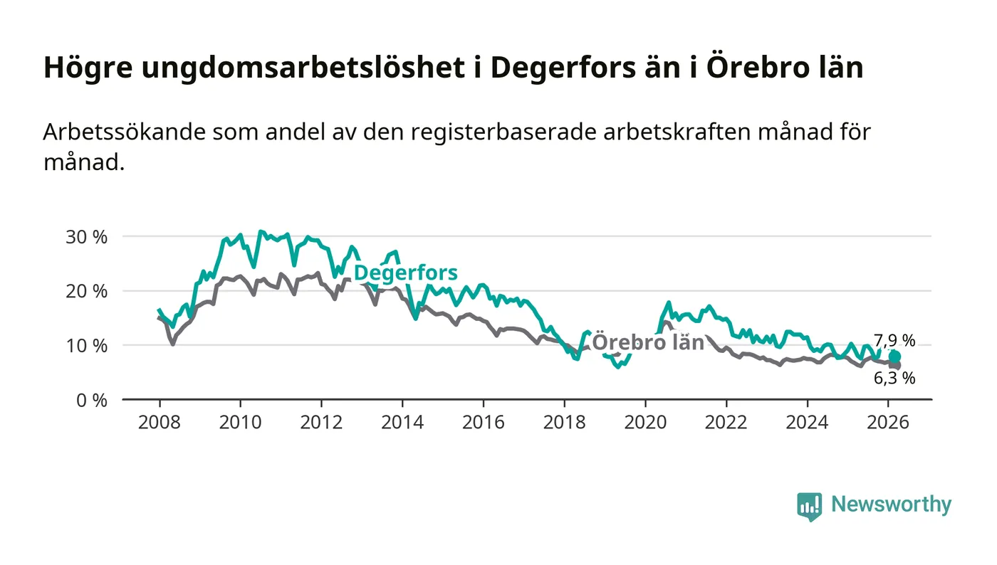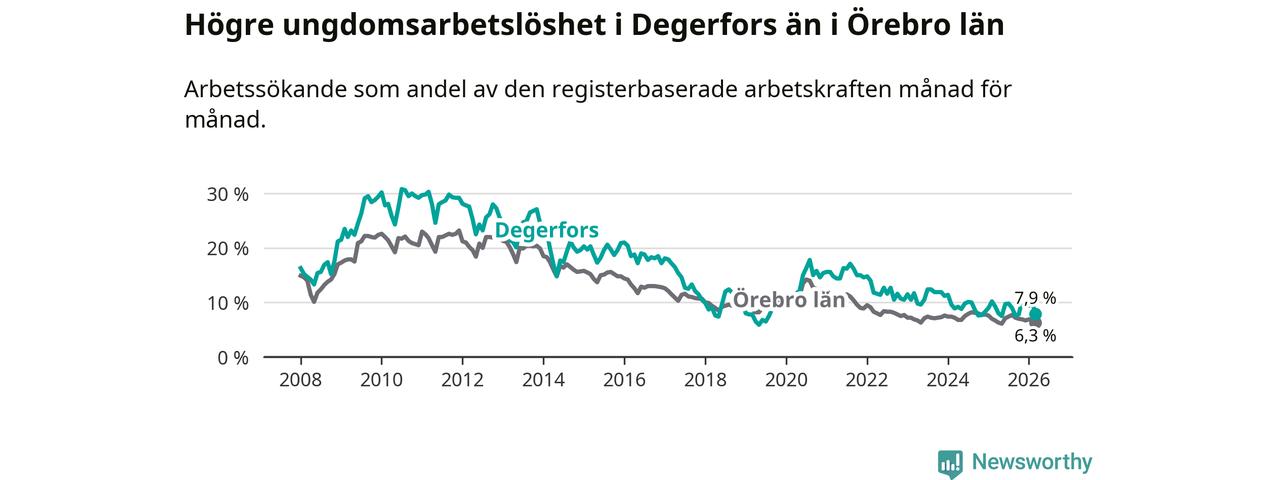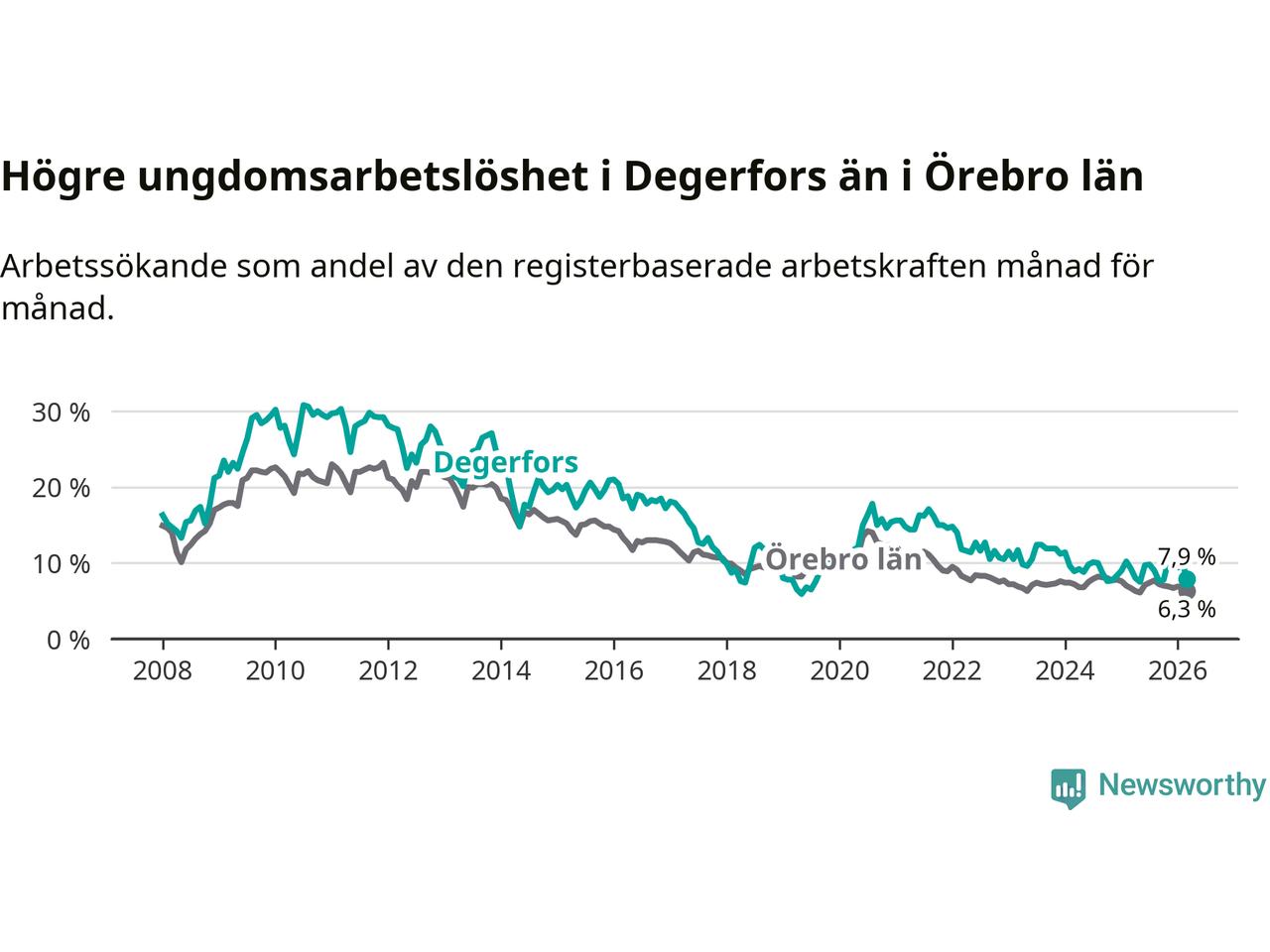 Precis som den totala arbetslösheten ligger ungdomsarbetslösheten i Degerfors högre än i Örebro som helhet. Skillnaden mellan kommunen och länet är 1,6 procentenheter.
