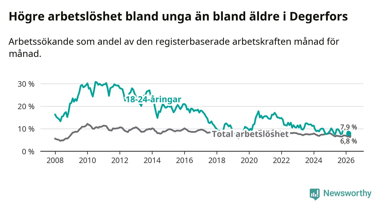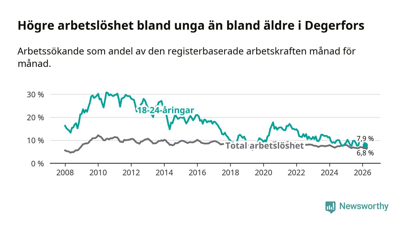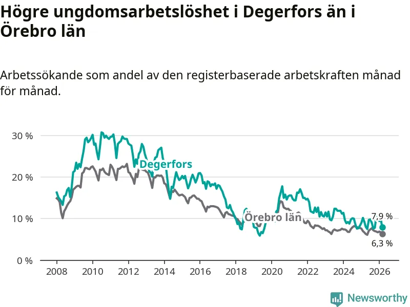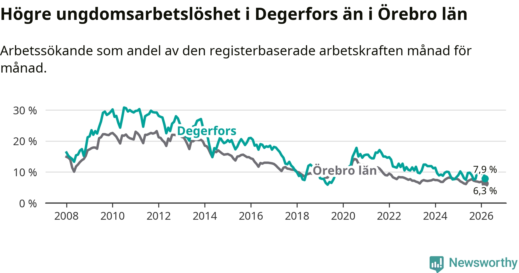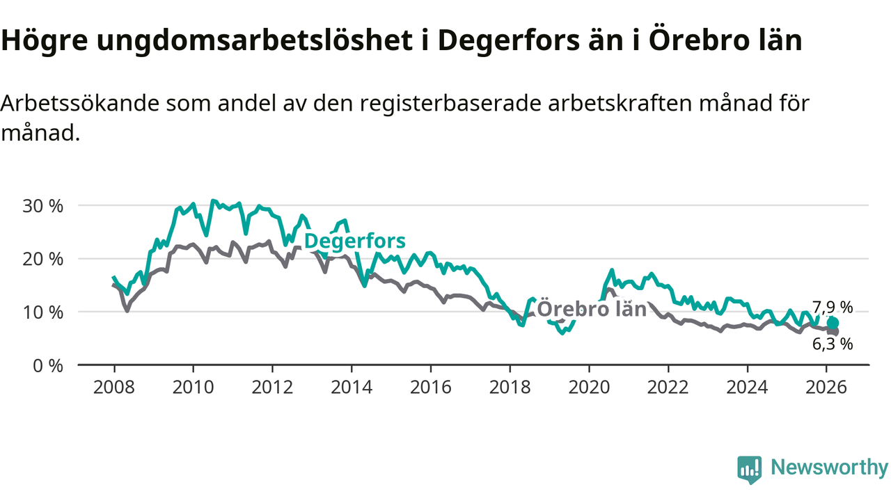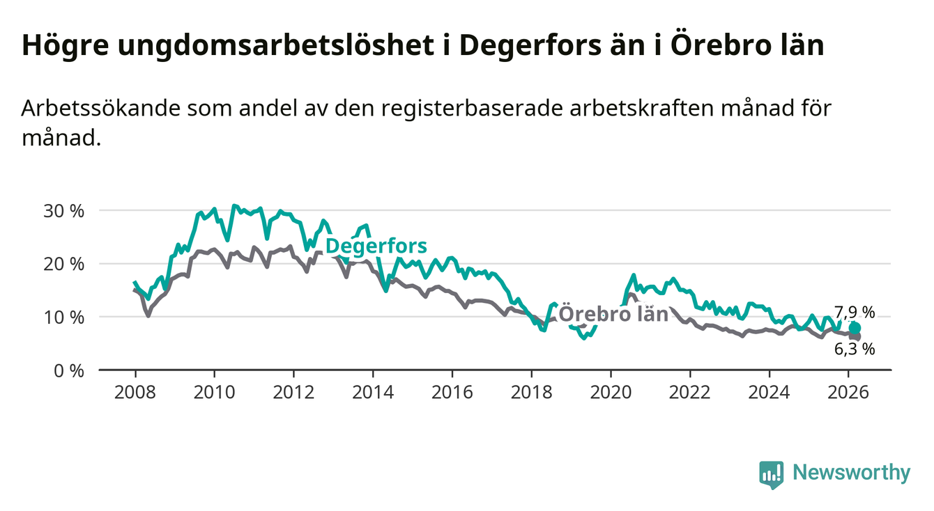 Precis som den totala arbetslösheten ligger ungdomsarbetslösheten i Degerfors högre än i Örebro som helhet. Skillnaden mellan kommunen och länet är 1,6 procentenheter.