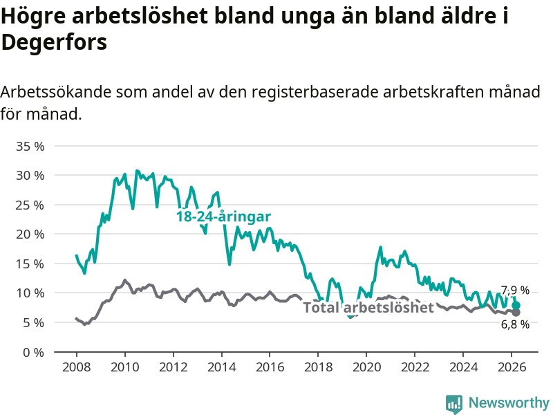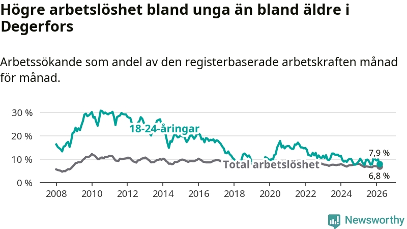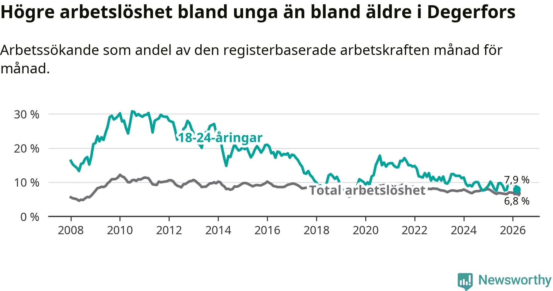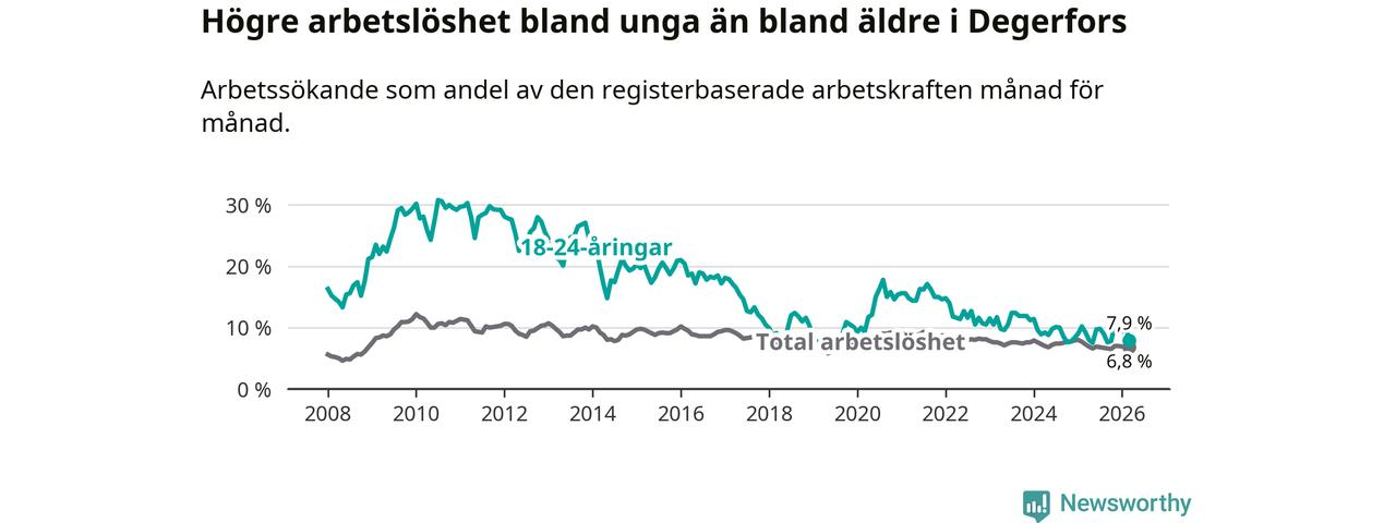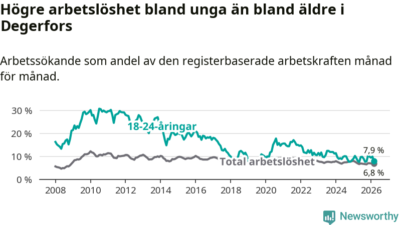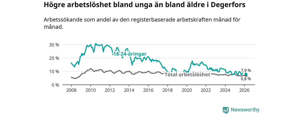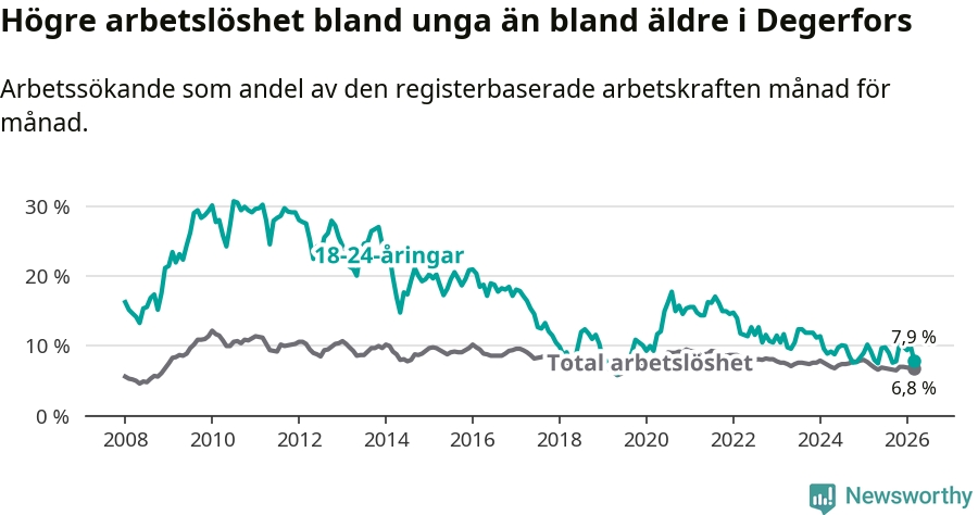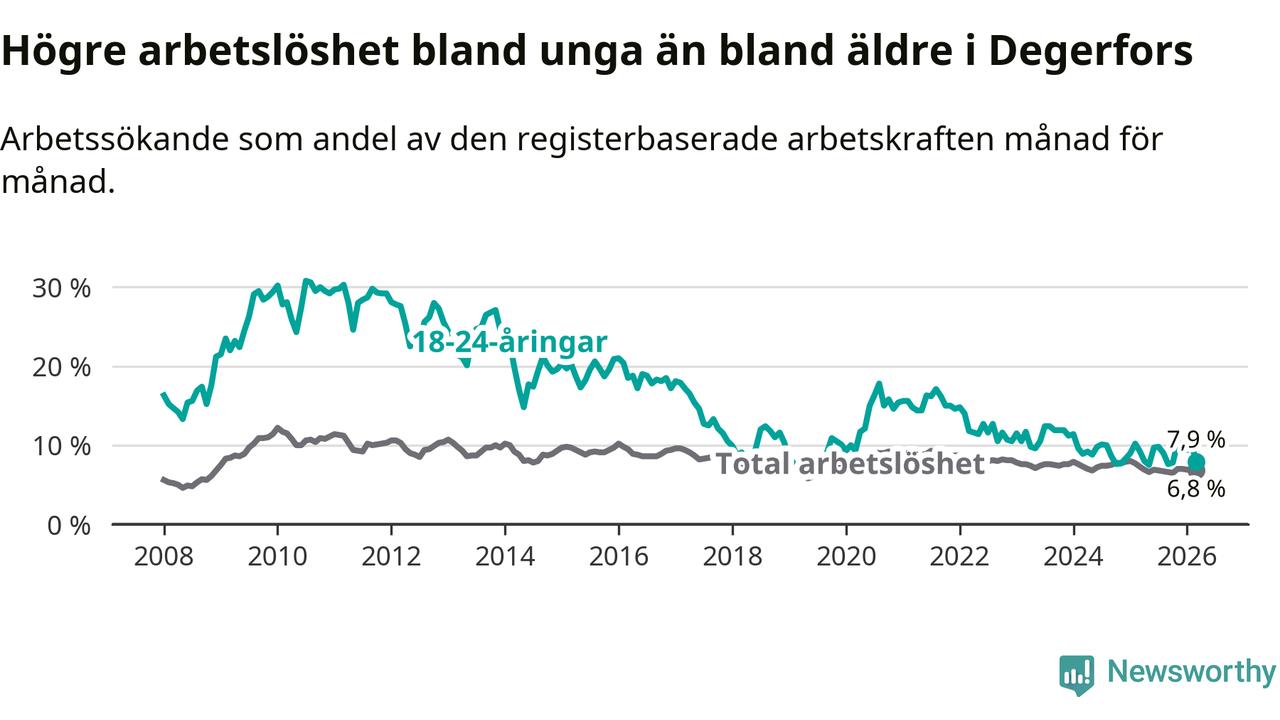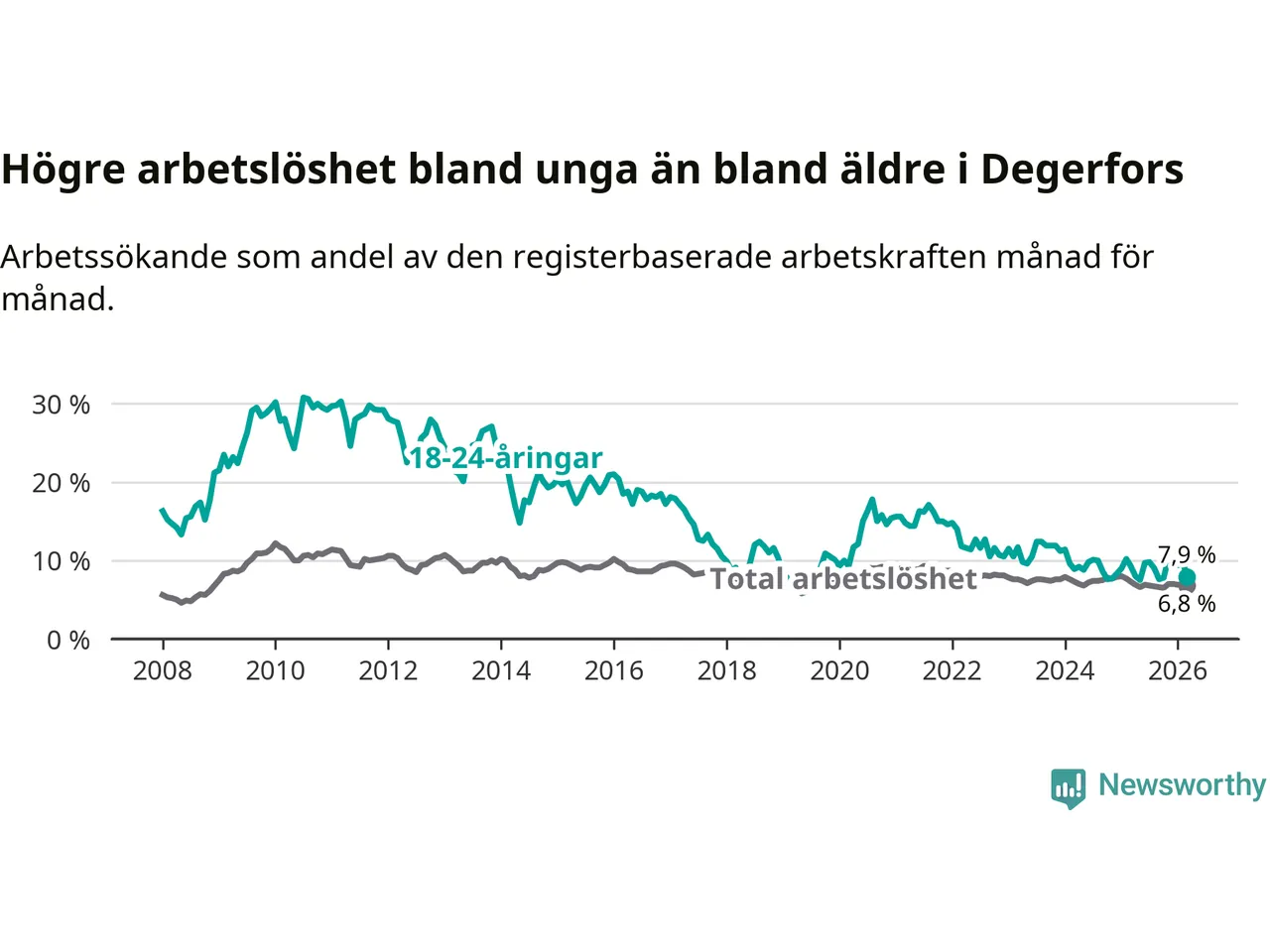 Precis som den totala arbetslösheten ligger ungdomsarbetslösheten i Degerfors högre än i Örebro som helhet. Skillnaden mellan kommunen och länet är 1,6 procentenheter.