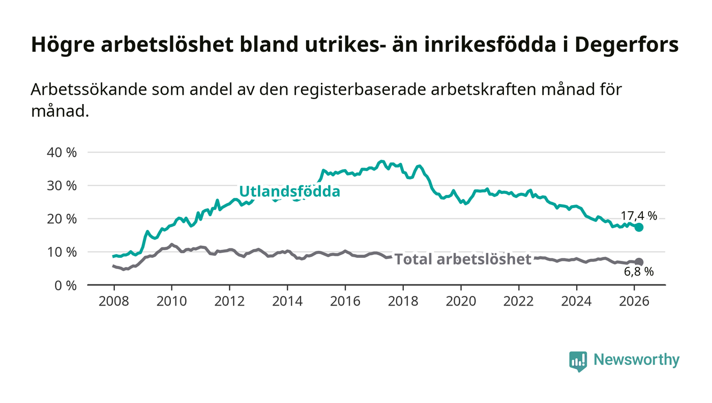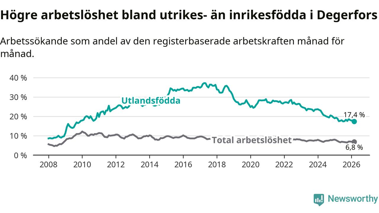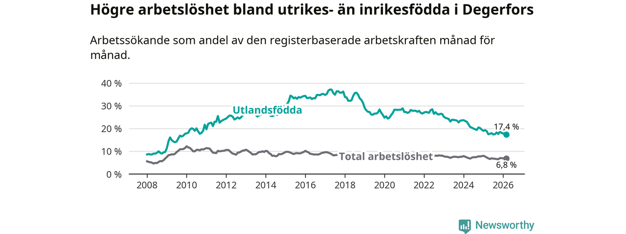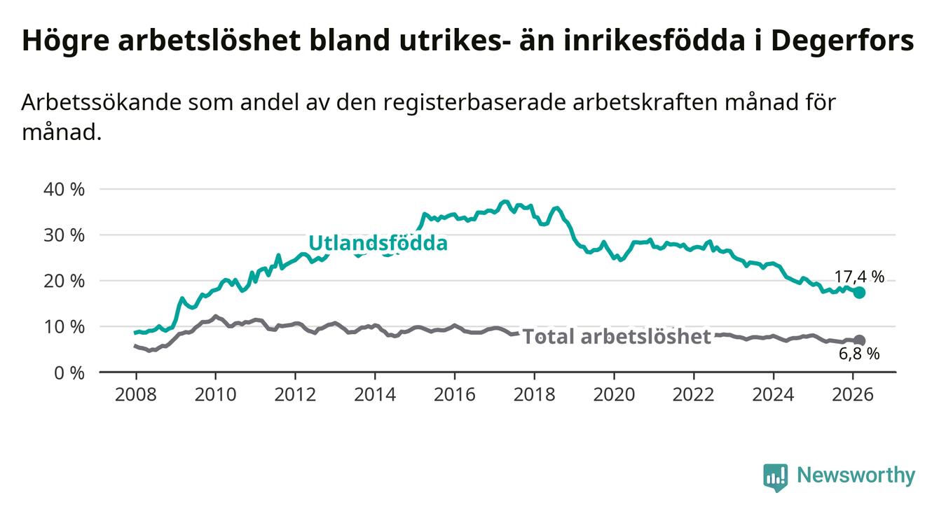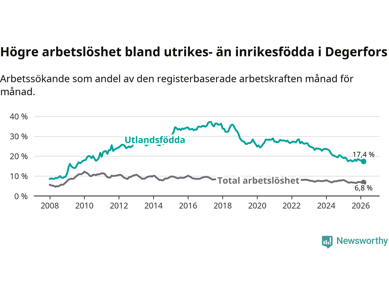 Arbetslösheten bland utlandsfödda var 17,4 procent i Degerfors under mars månad, motsvarande 119 av 684 personer. Det är 1,5 procentenheter färre än vid samma tidpunkt i fjol (−8 om man räknar personer). Därmed har de utlandsföddas arbetslöshet varit lägre än vid samma tidpunkt i fjol i över tre år i sträck. Sedan juni 2022 har arbetslösheten bland utlandsfödda minskat från 28,5 till 17,4 procent.