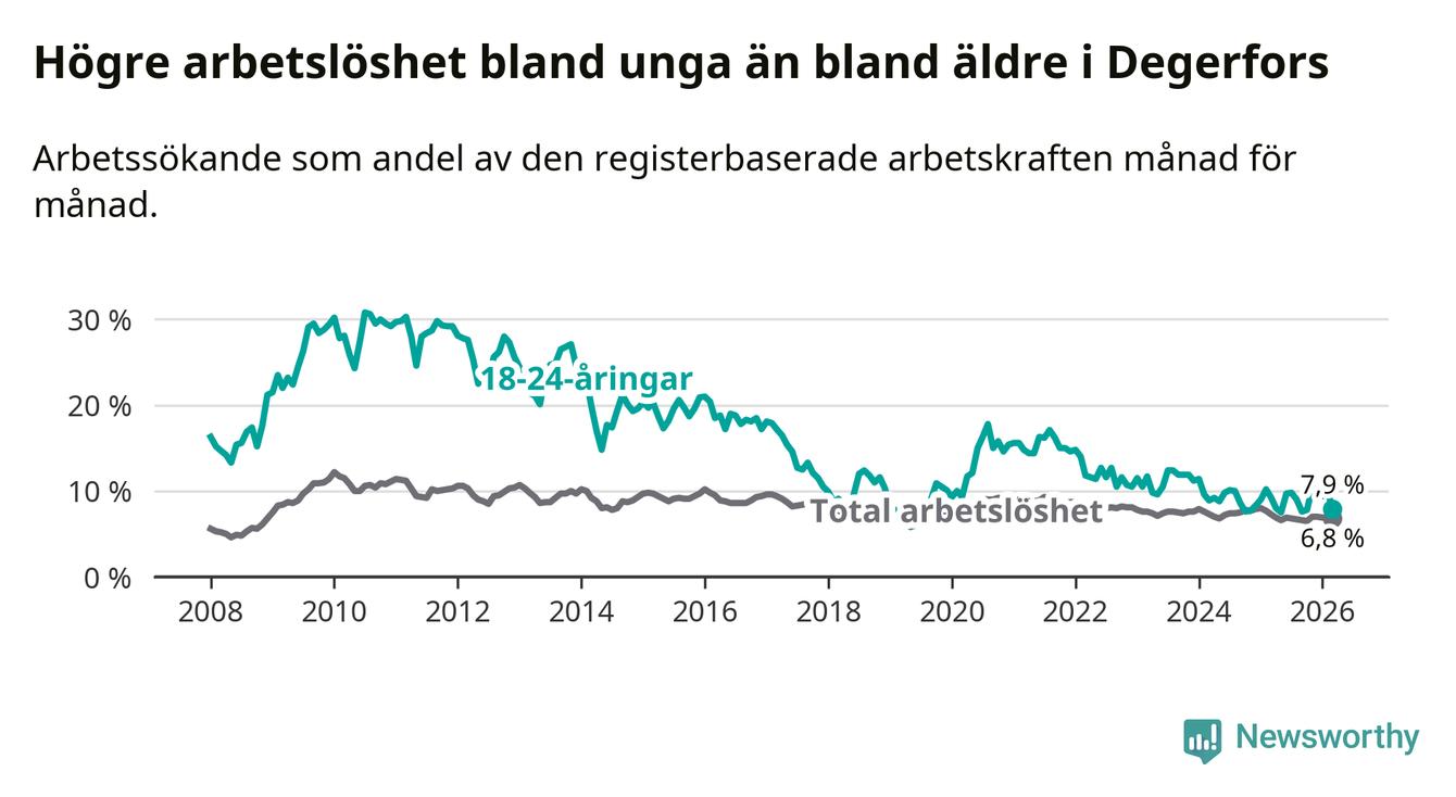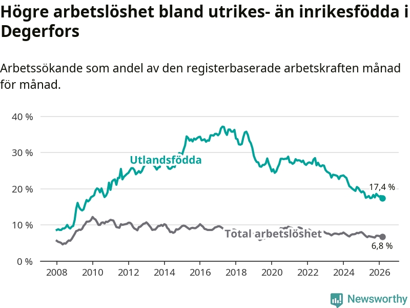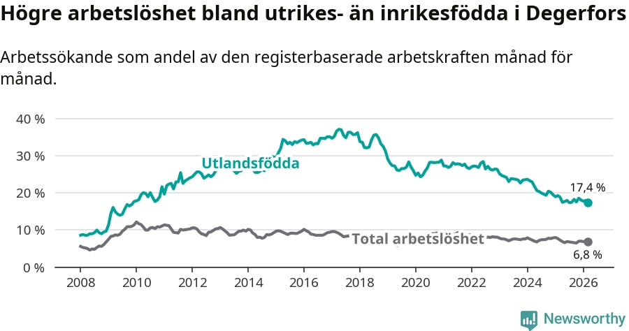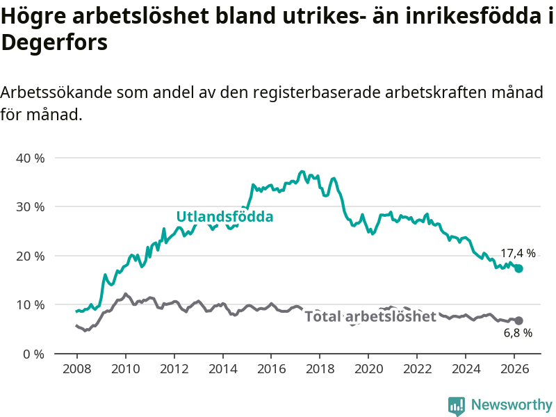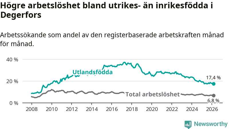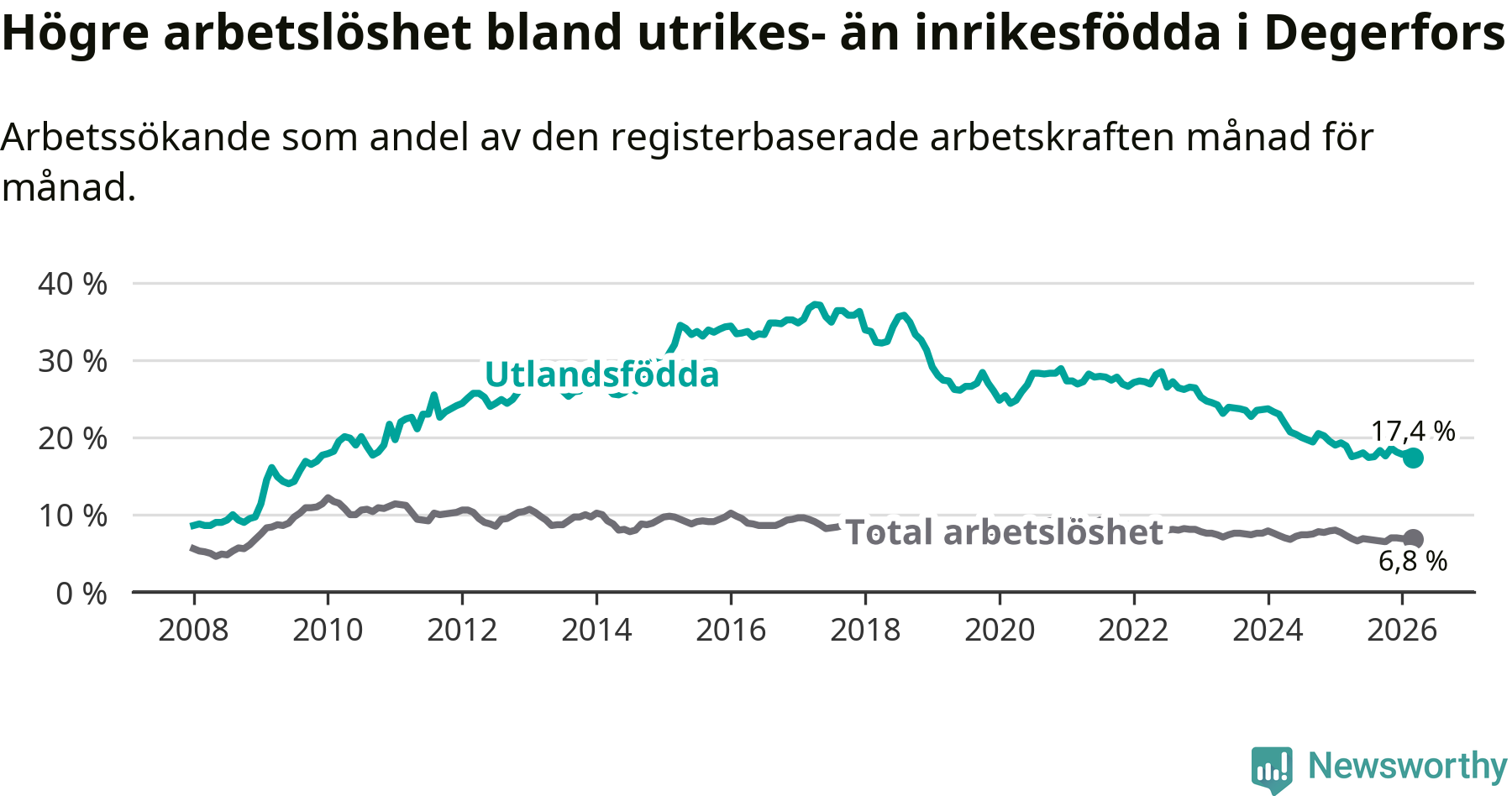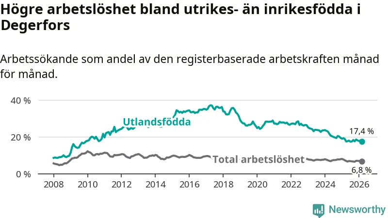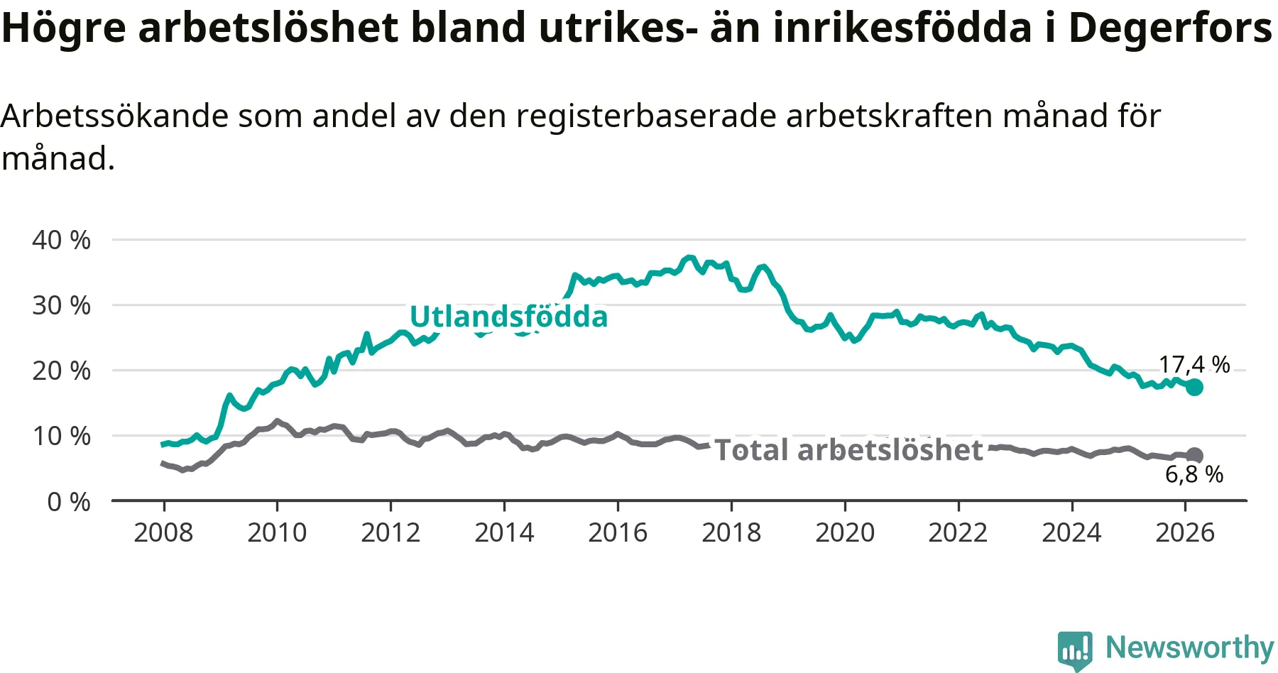 Arbetslösheten bland utlandsfödda var 17,4 procent i Degerfors under mars månad, motsvarande 119 av 684 personer. Det är 1,5 procentenheter färre än vid samma tidpunkt i fjol (−8 om man räknar personer). Därmed har de utlandsföddas arbetslöshet varit lägre än vid samma tidpunkt i fjol i över tre år i sträck. Sedan juni 2022 har arbetslösheten bland utlandsfödda minskat från 28,5 till 17,4 procent.