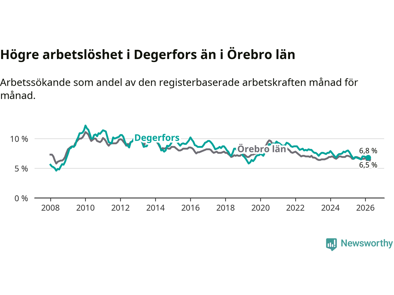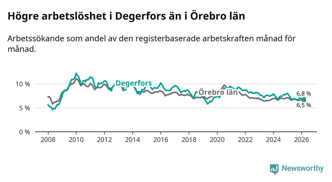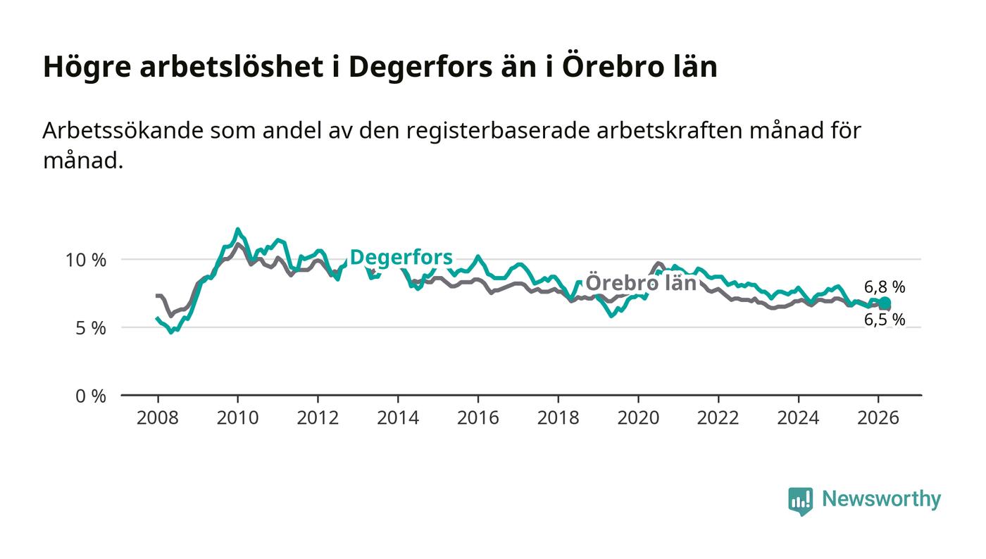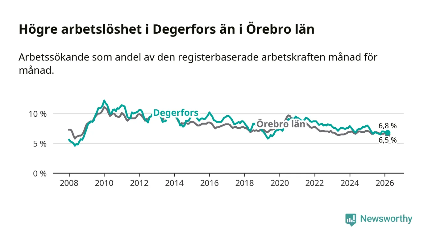 Under mars månad rapporterade Degerfors kommun en total arbetslöshet på 6,8 procent. Det är en minskning jämfört med samma tidpunkt i fjol (−0,5 procentenheter). Även i Örebro län sjunker arbetslösheten .