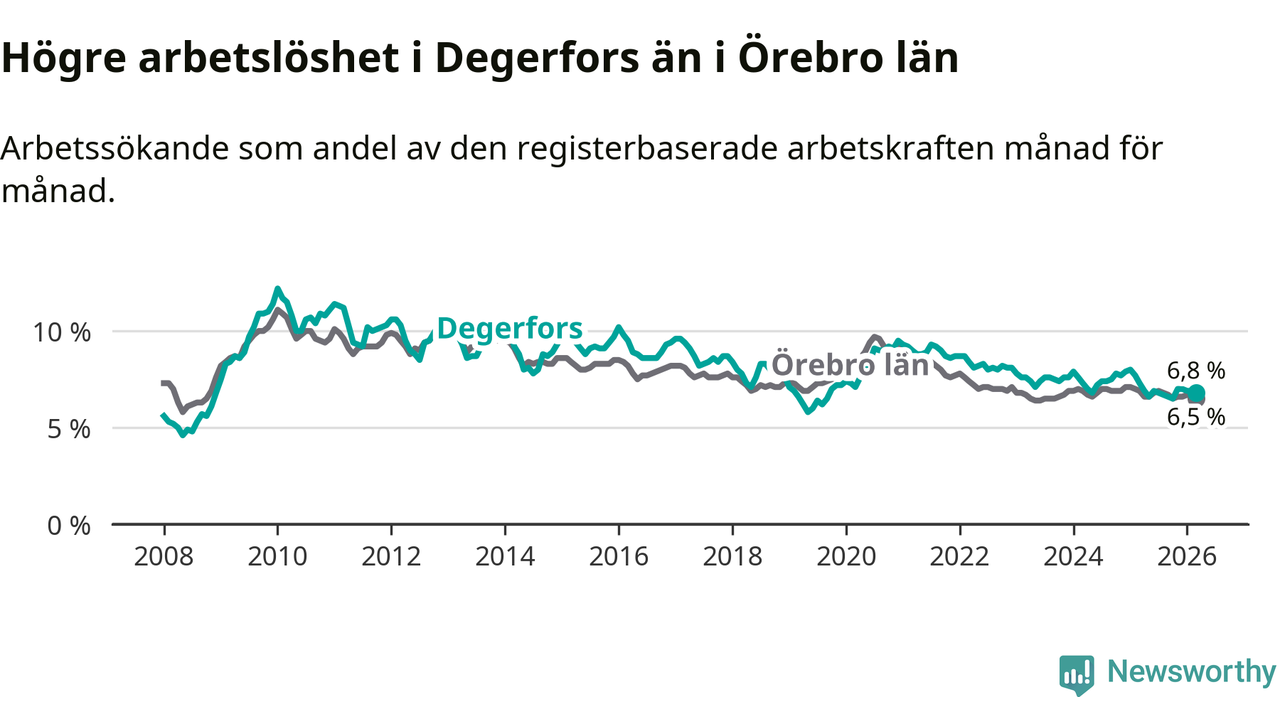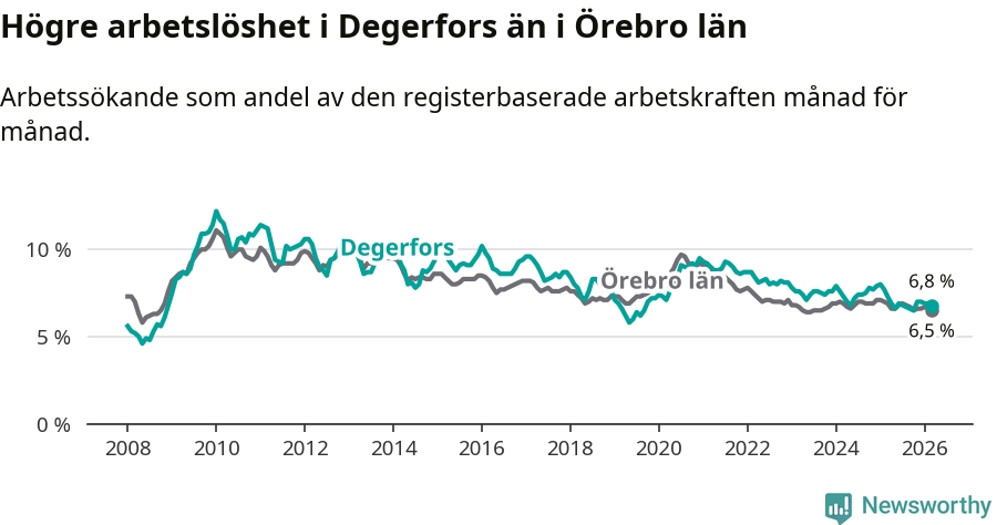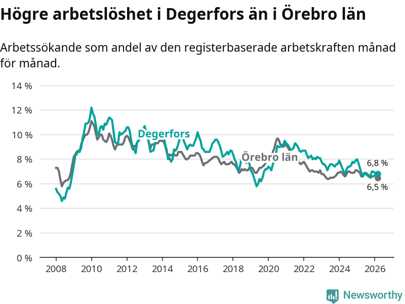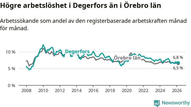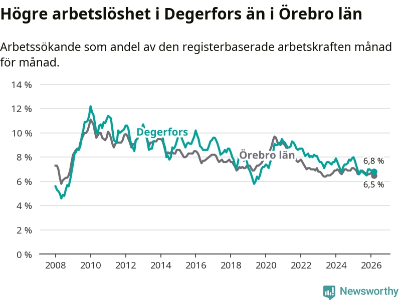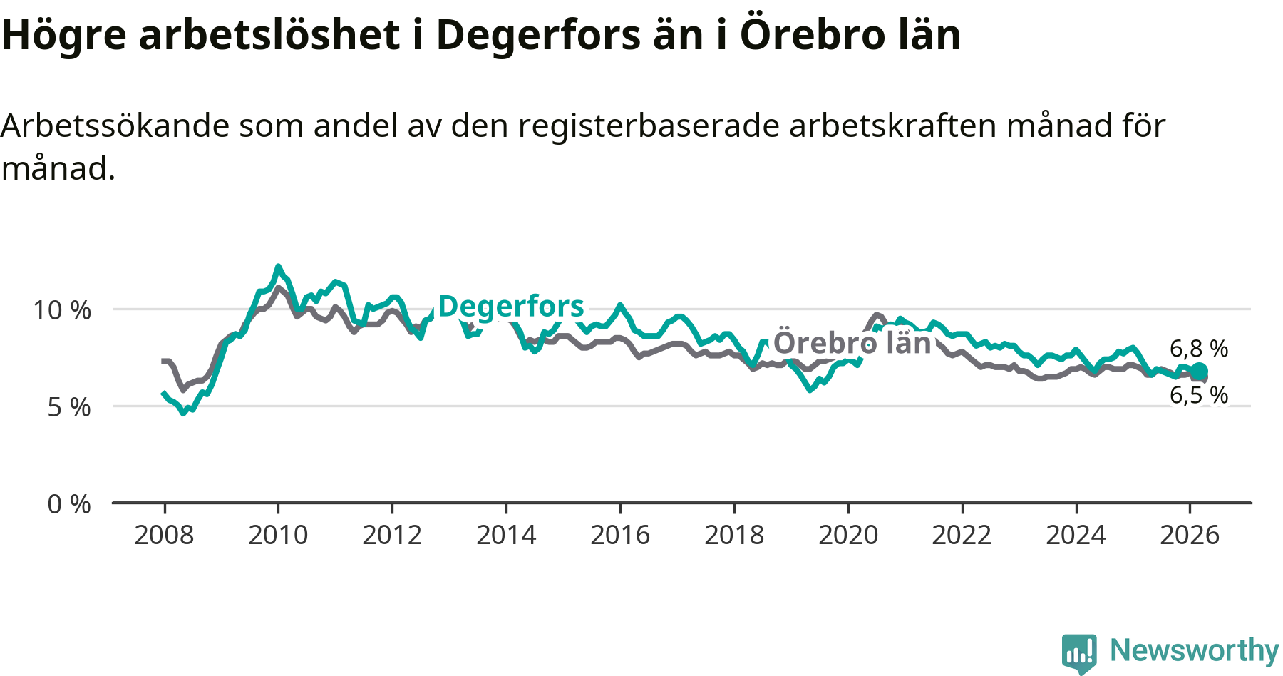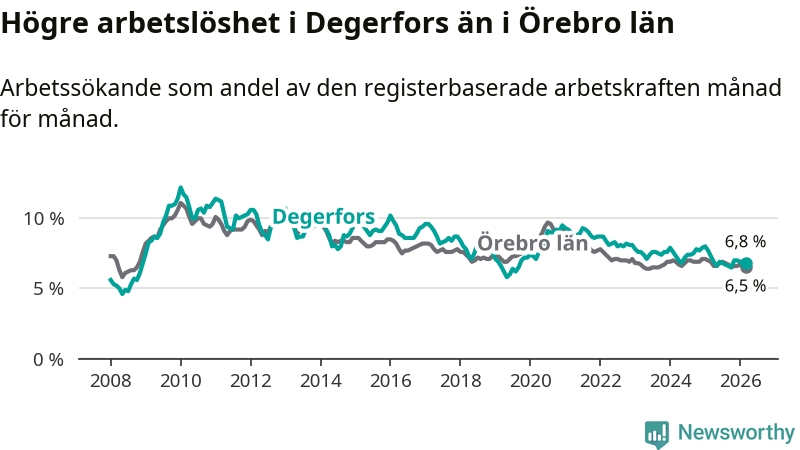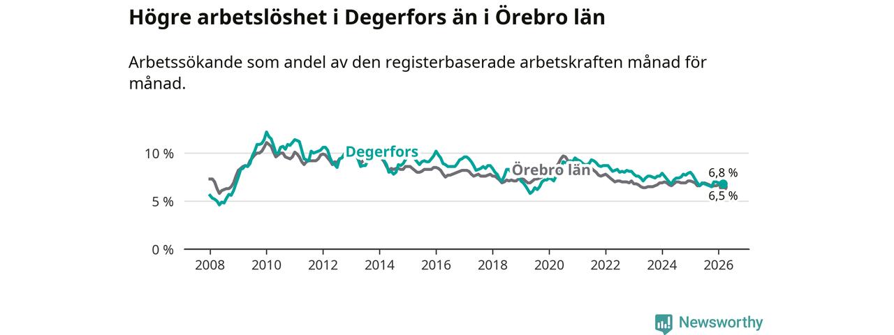 Under mars månad rapporterade Degerfors kommun en total arbetslöshet på 6,8 procent. Det är en minskning jämfört med samma tidpunkt i fjol (−0,5 procentenheter). Även i Örebro län sjunker arbetslösheten .