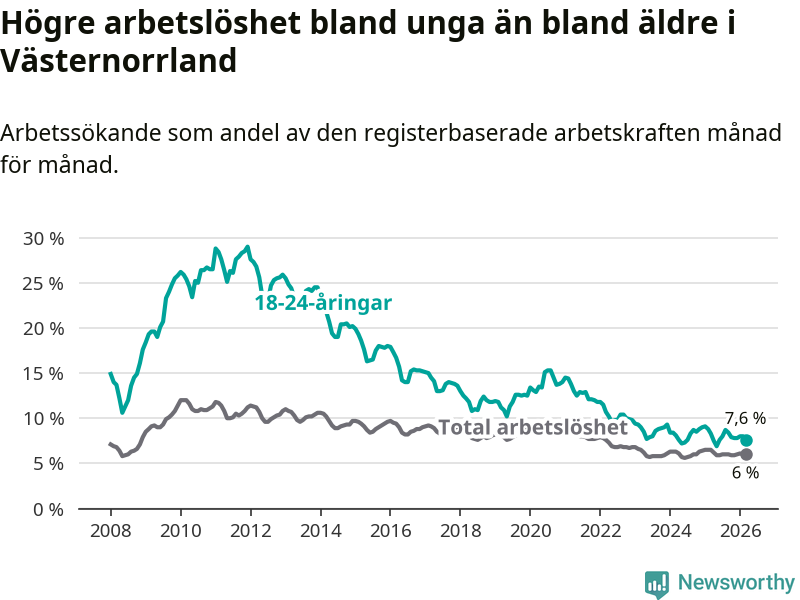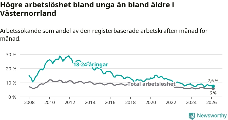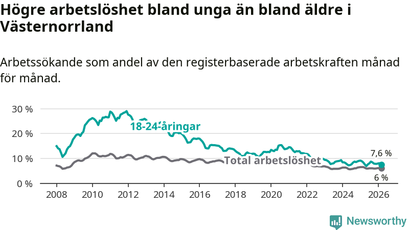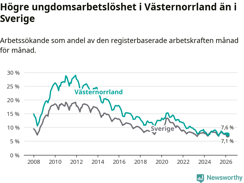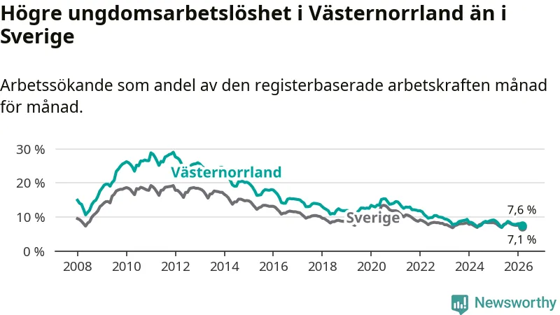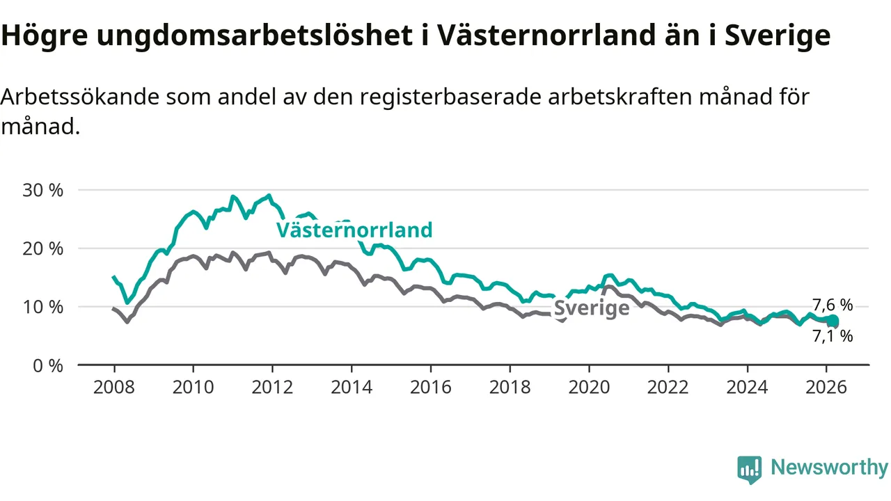 I och med den senaste månadens nedgång har de ungas arbetslöshet i Västernorrland sjunkit sju månader i följd (ner från 8,7 procent i augusti 2025 till 7,6 procent nu).