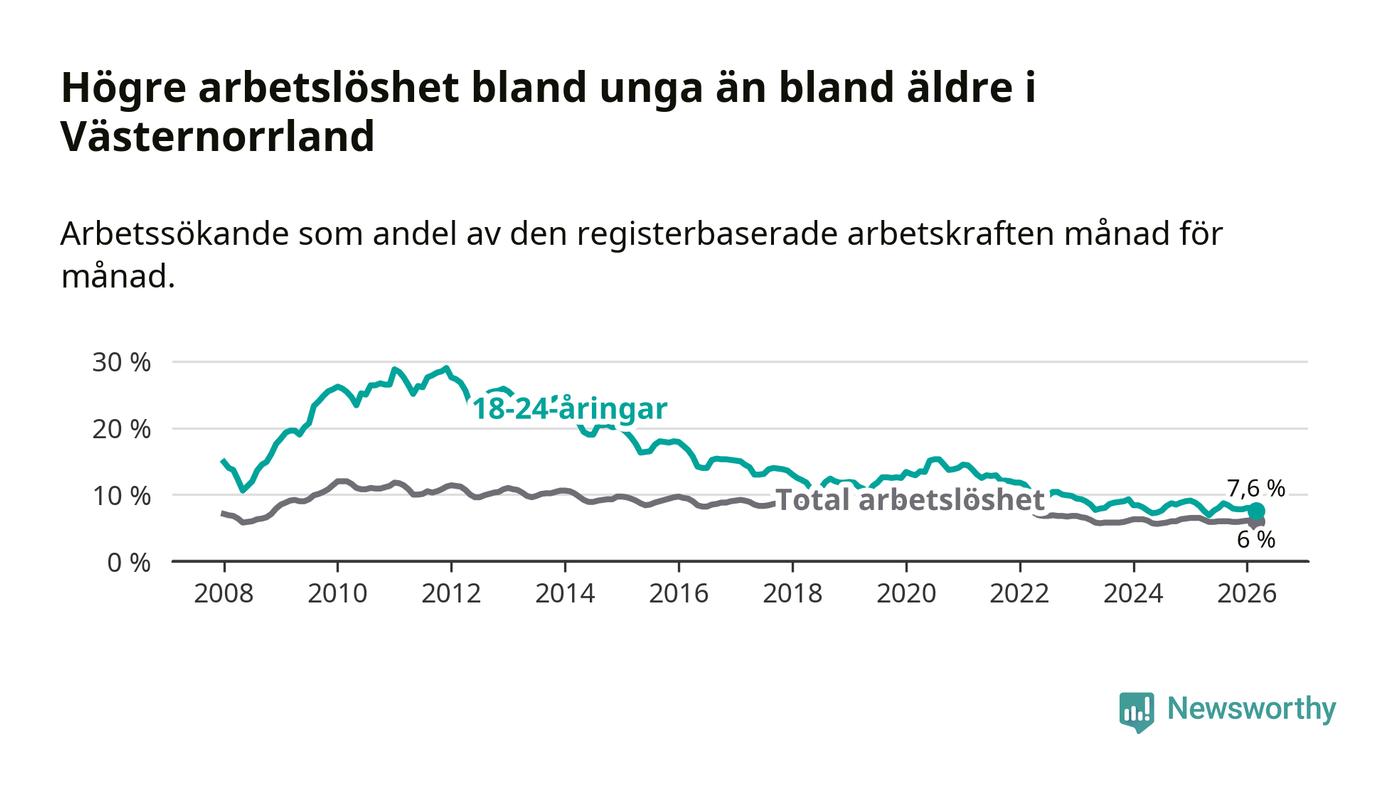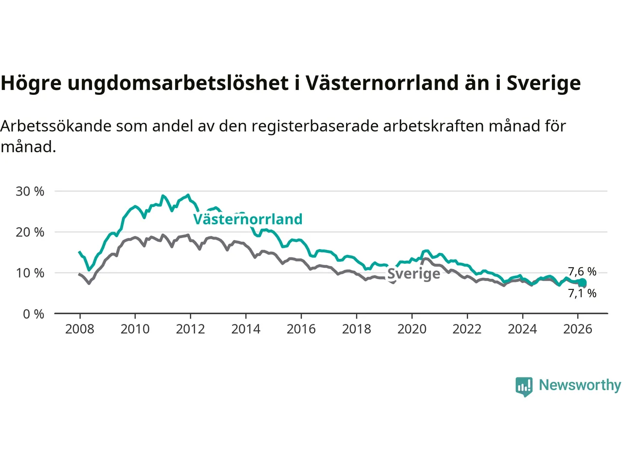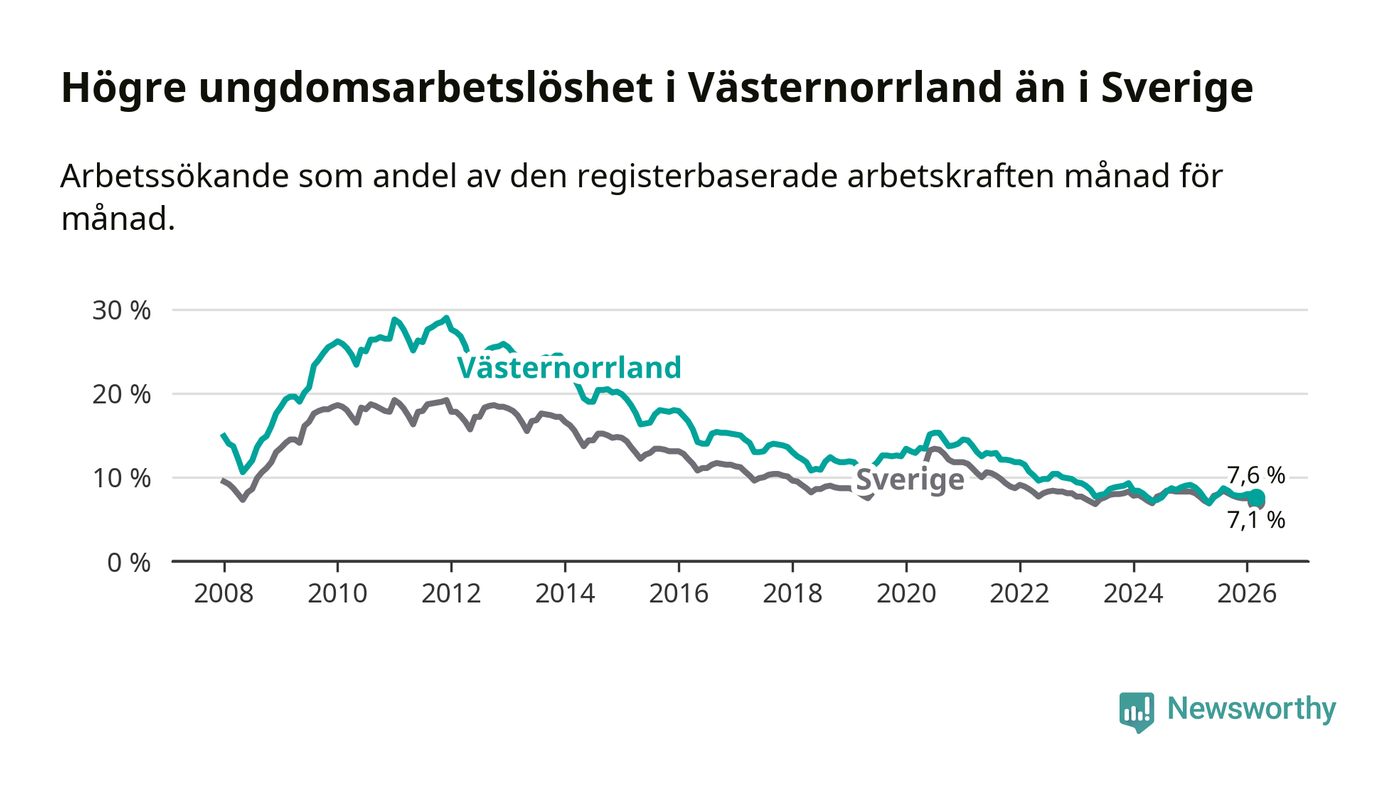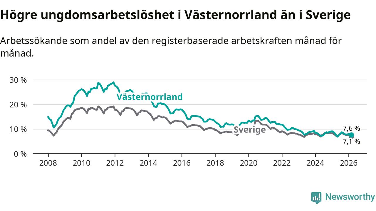 Medan Västernorrland har lägre total arbetslöshet än Sverige, ligger ungdomsarbetslösheten 0,5 procentenheter högre i Västernorrland.
