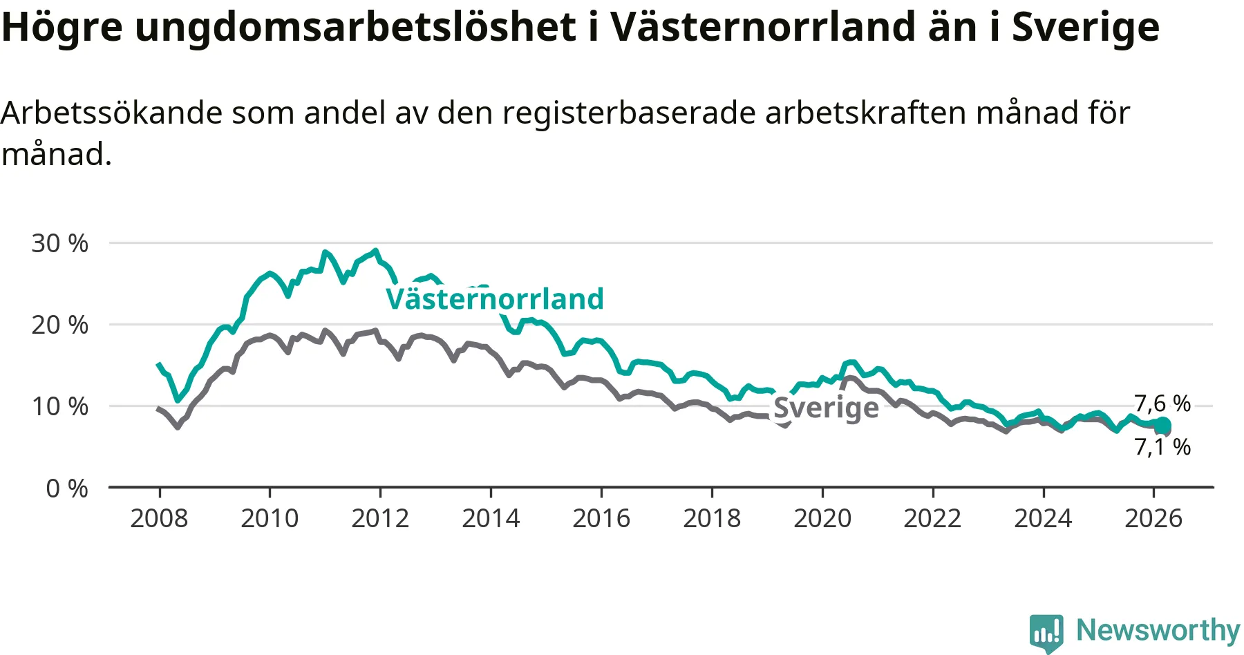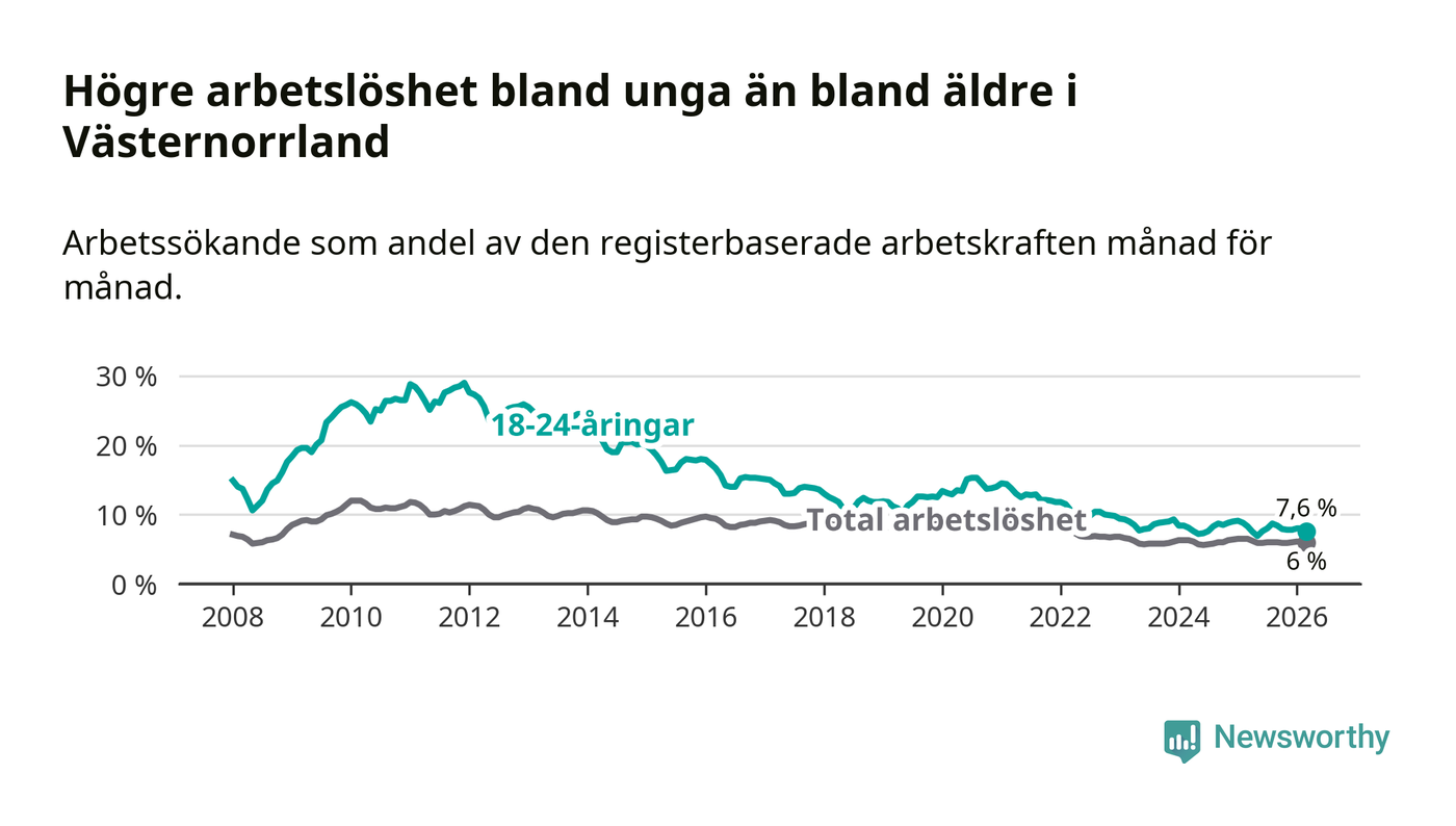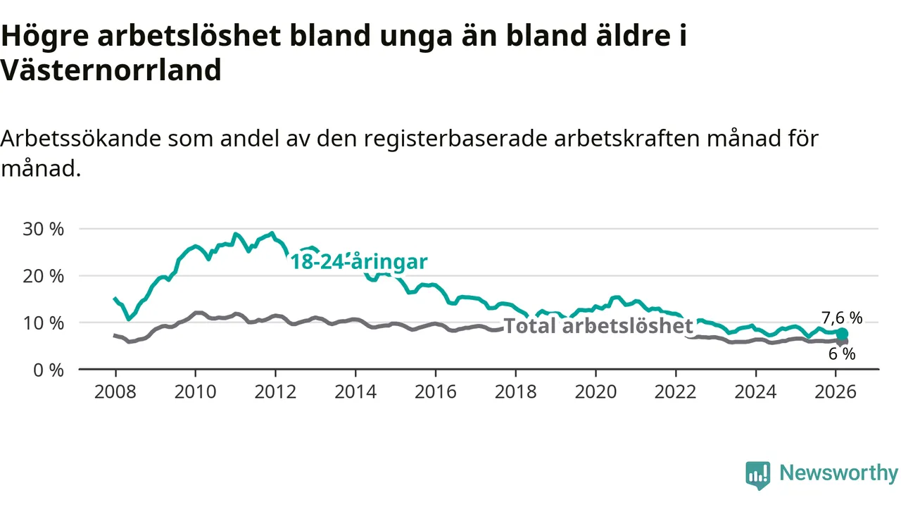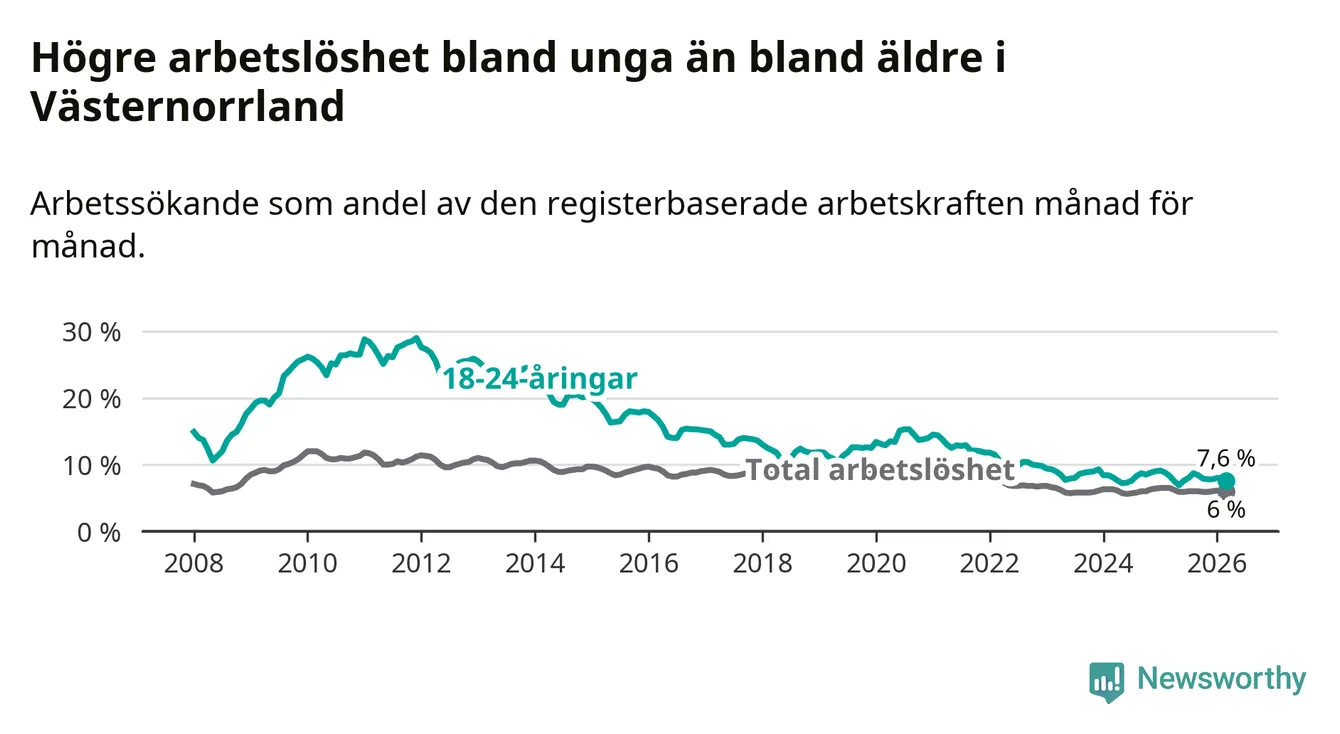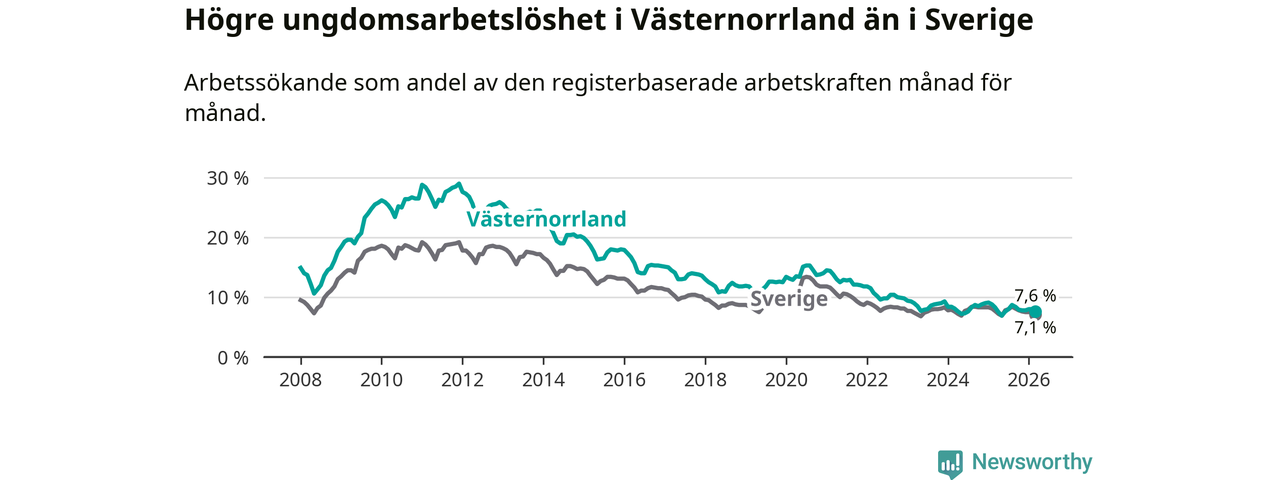 Medan Västernorrland har lägre total arbetslöshet än Sverige, ligger ungdomsarbetslösheten 0,5 procentenheter högre i Västernorrland.
