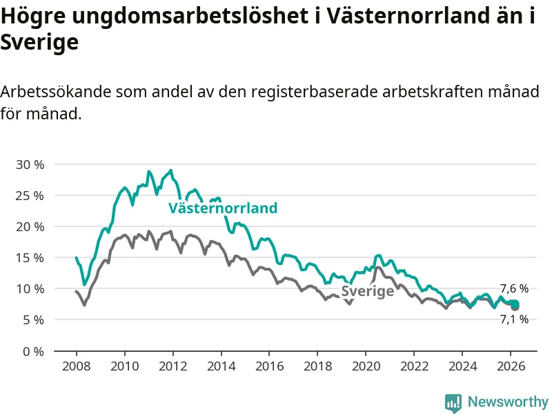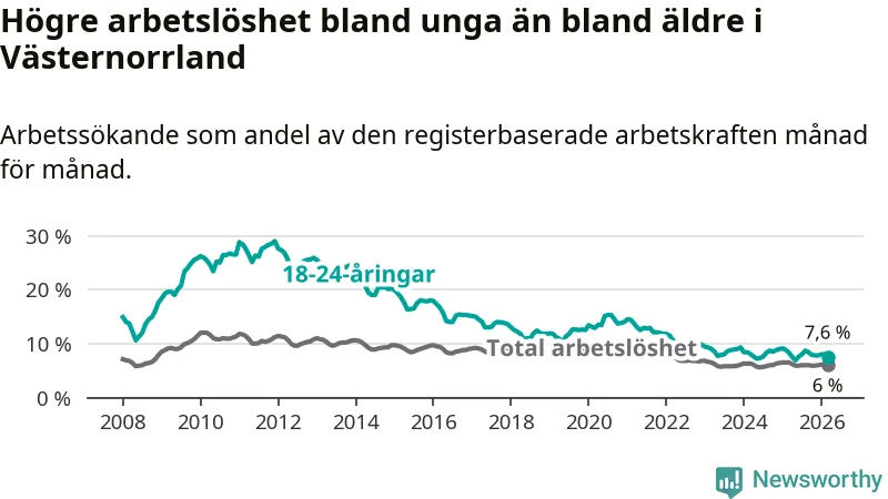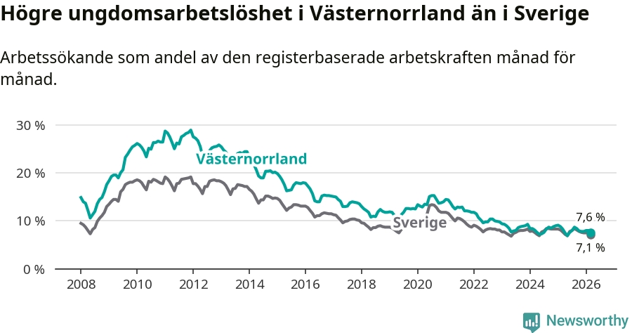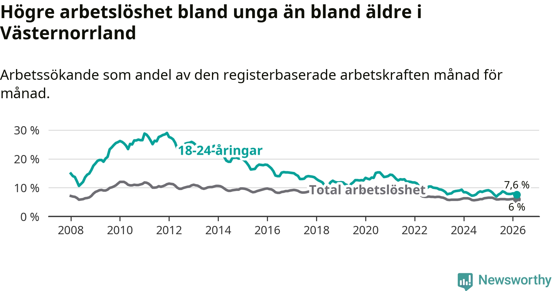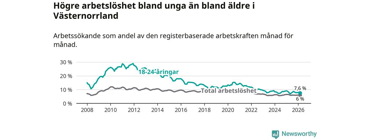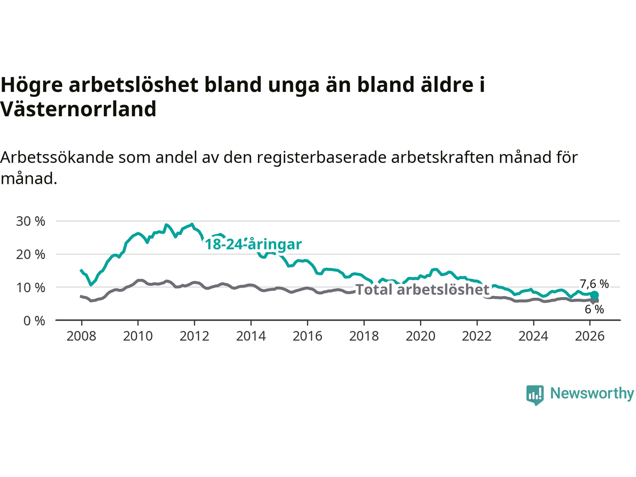 Medan Västernorrland har lägre total arbetslöshet än Sverige, ligger ungdomsarbetslösheten 0,5 procentenheter högre i Västernorrland.
