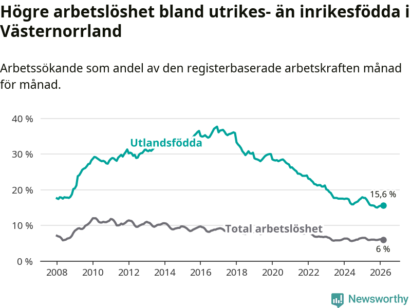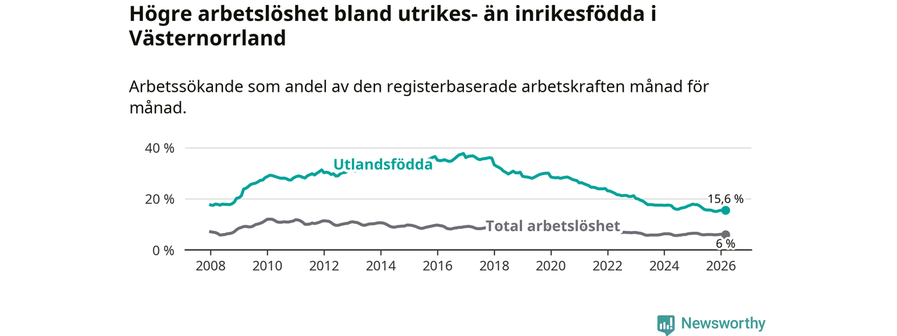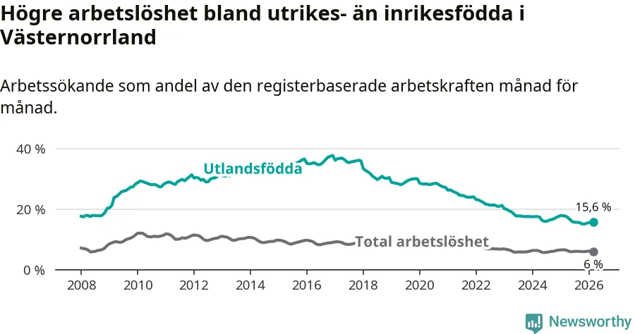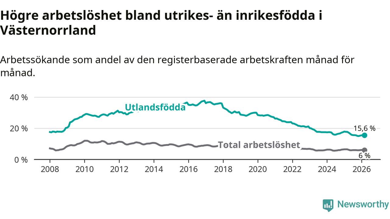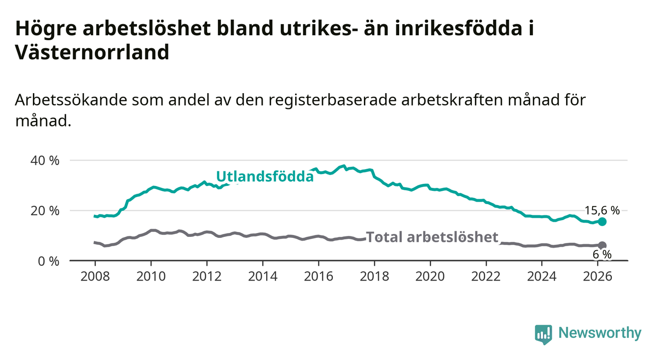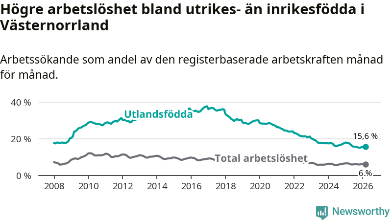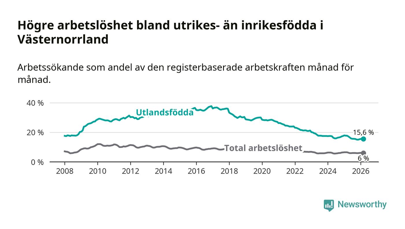 Skillnaden i arbetslöshet mellan utrikesfödda och hela befolkningen är 9,6 procentenheter i Västernorrland. Det är en betydligt mindre skillnad än för ett år sedan (−1,6 procentenheter).
