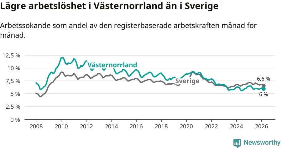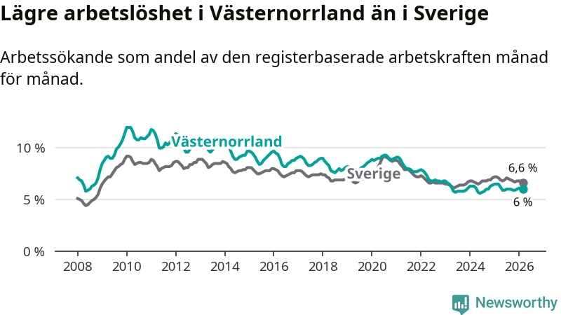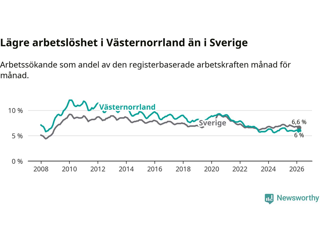 Under mars månad rapporterade Västernorrlands län en total arbetslöshet på 6,0 procent. Det är en minskning jämfört med samma tidpunkt i fjol (−0,5 procentenheter). Även i Sverige sjunker arbetslösheten .