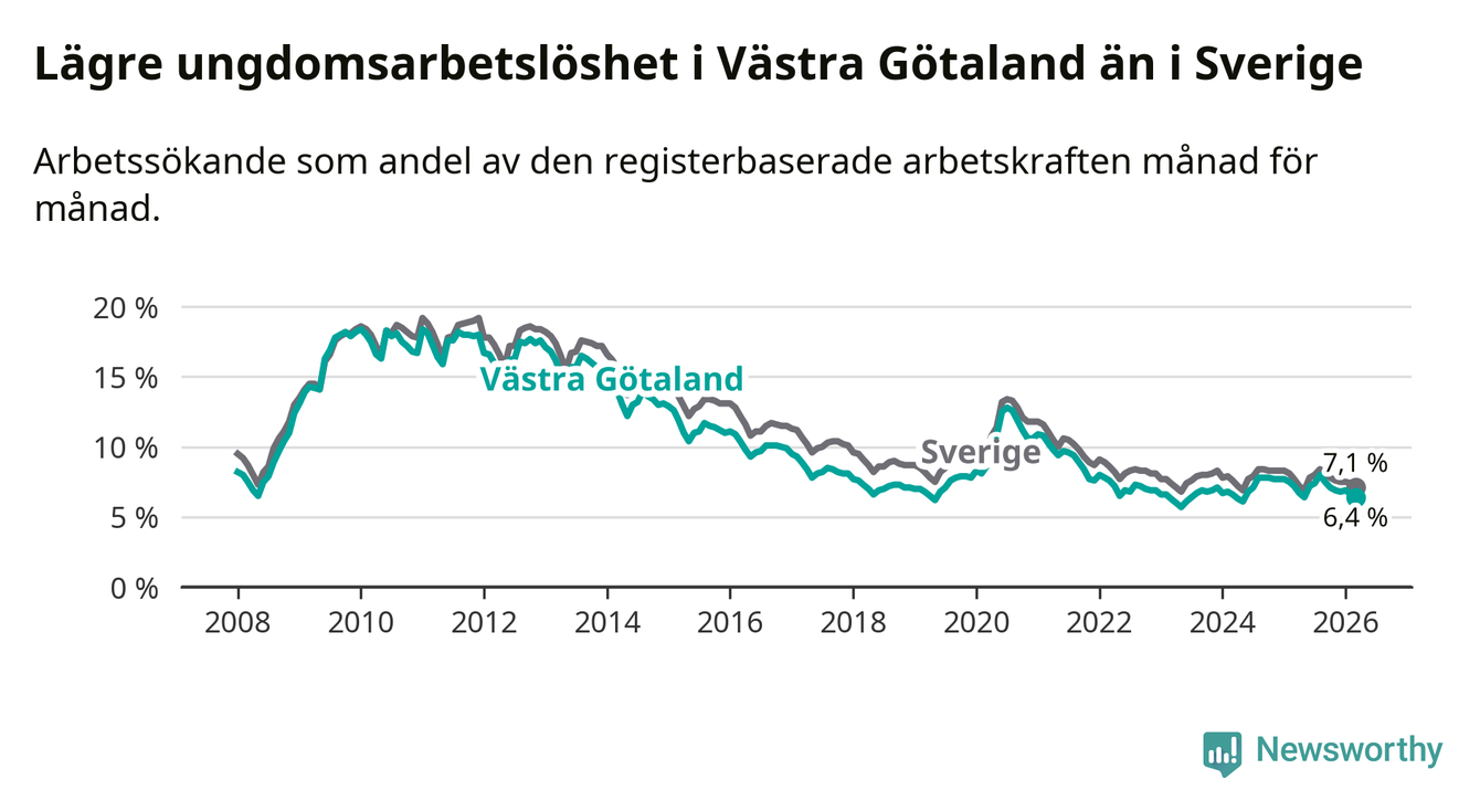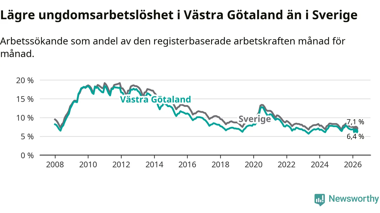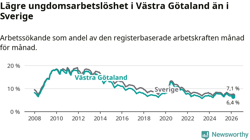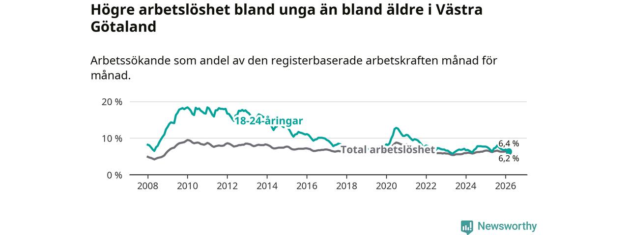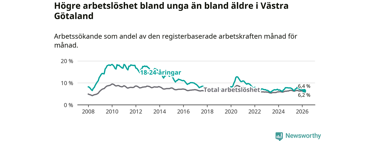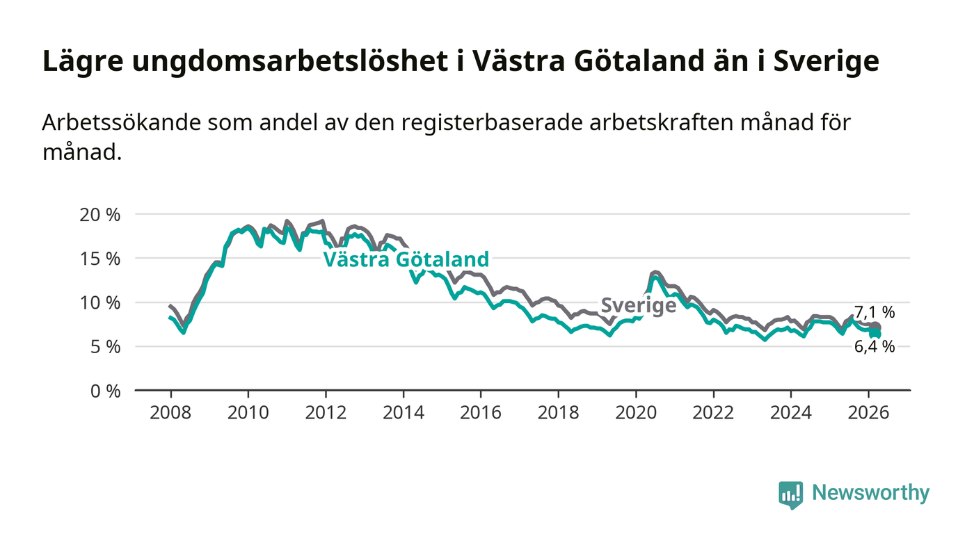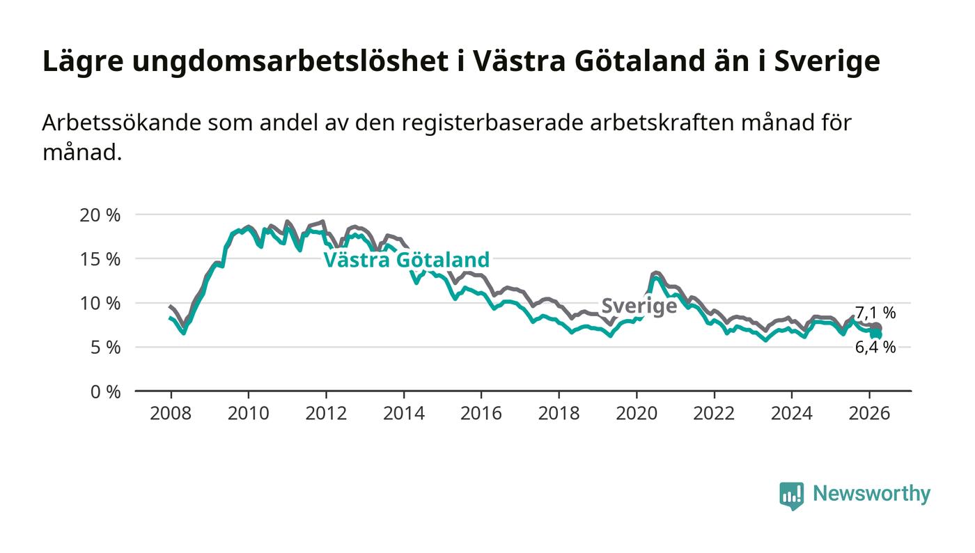 I och med den senaste månadens nedgång har de ungas arbetslöshet i Västra Götaland sjunkit sju månader i följd (ner från 8,0 procent i augusti 2025 till 6,4 procent nu).