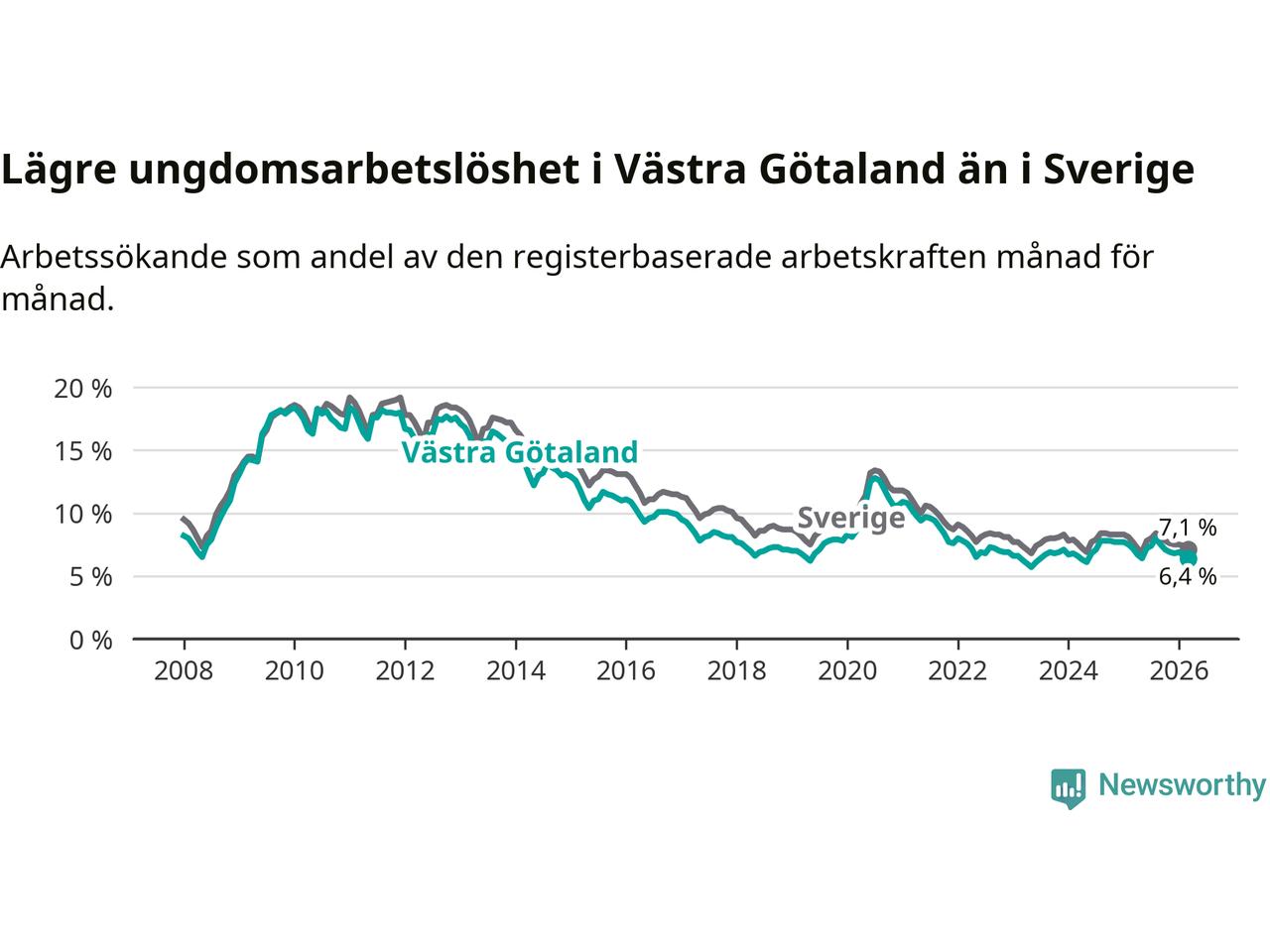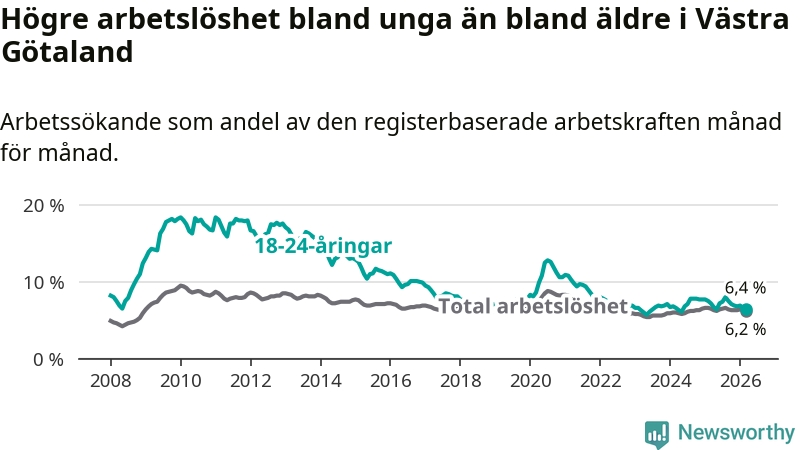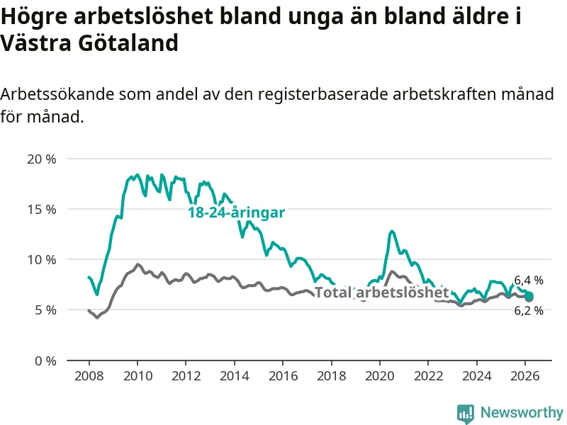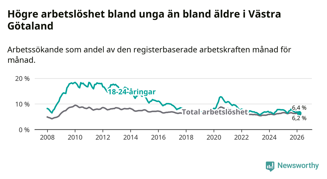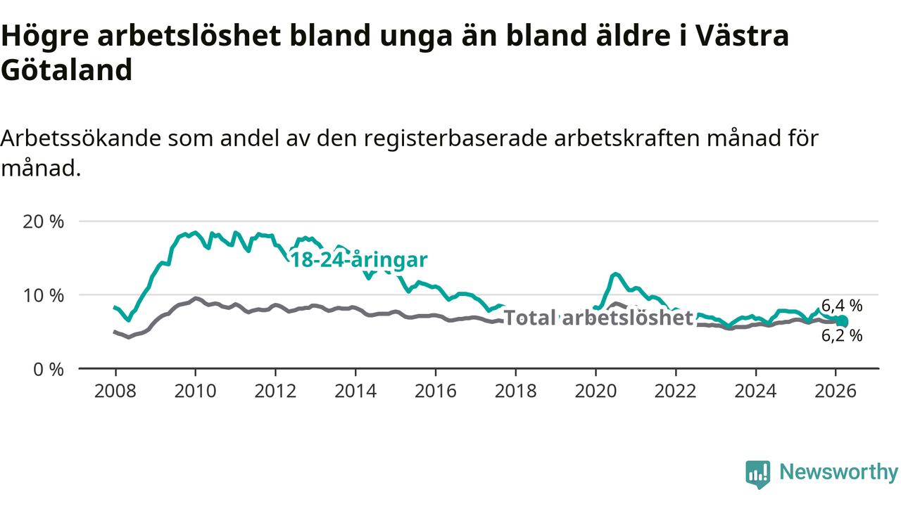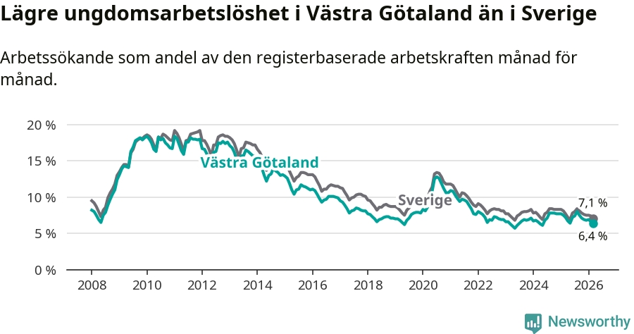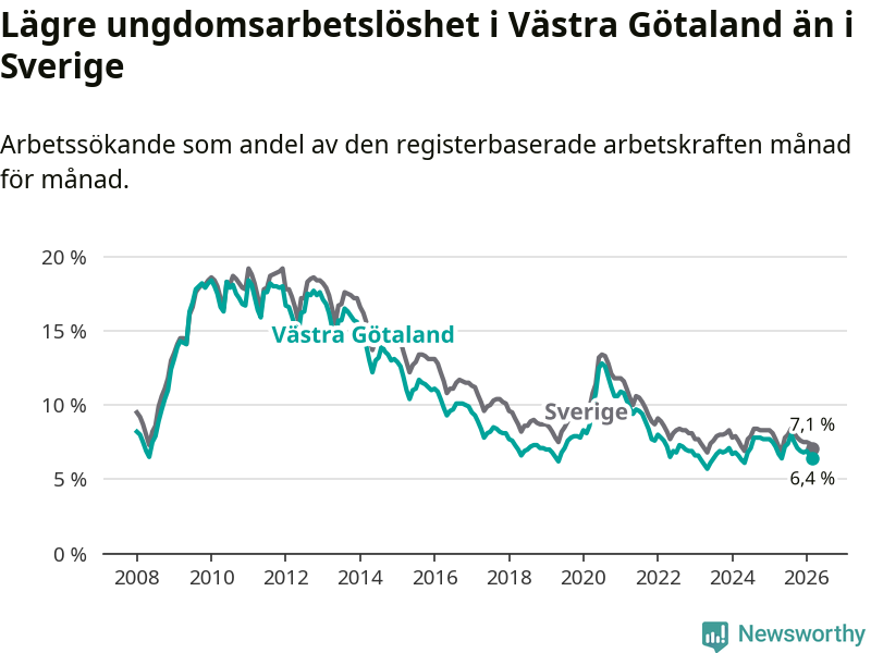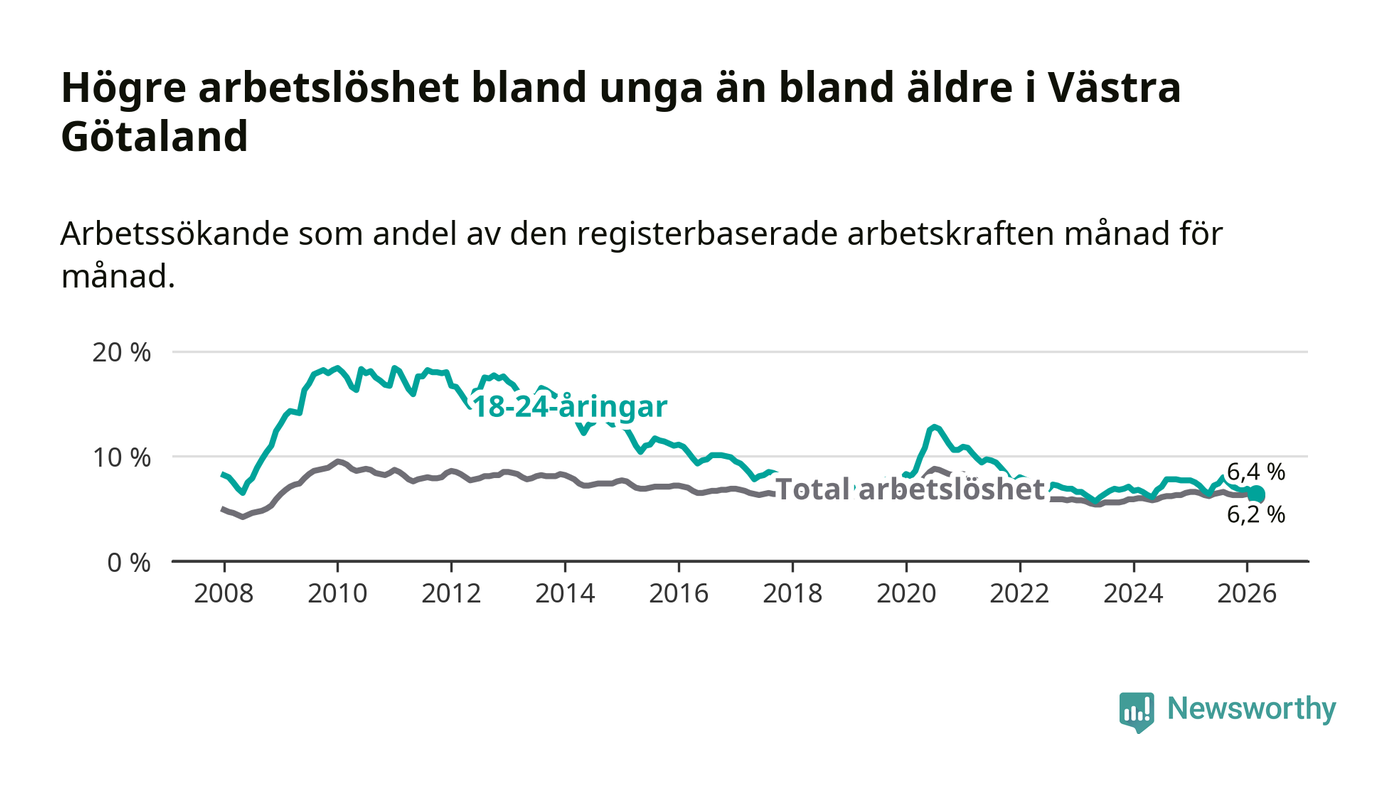 I och med den senaste månadens nedgång har de ungas arbetslöshet i Västra Götaland sjunkit sju månader i följd (ner från 8,0 procent i augusti 2025 till 6,4 procent nu).