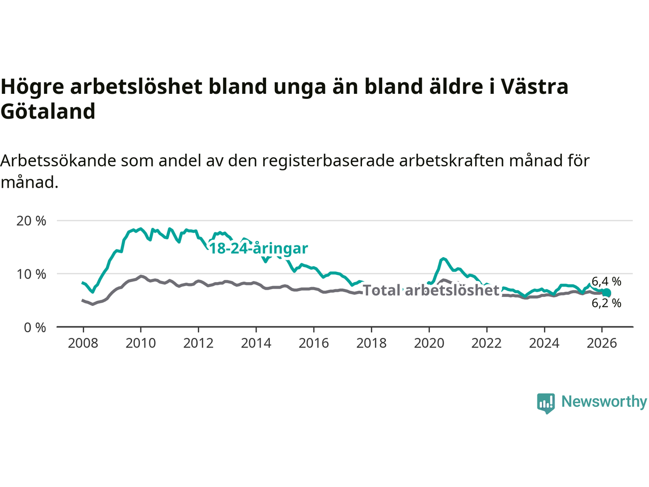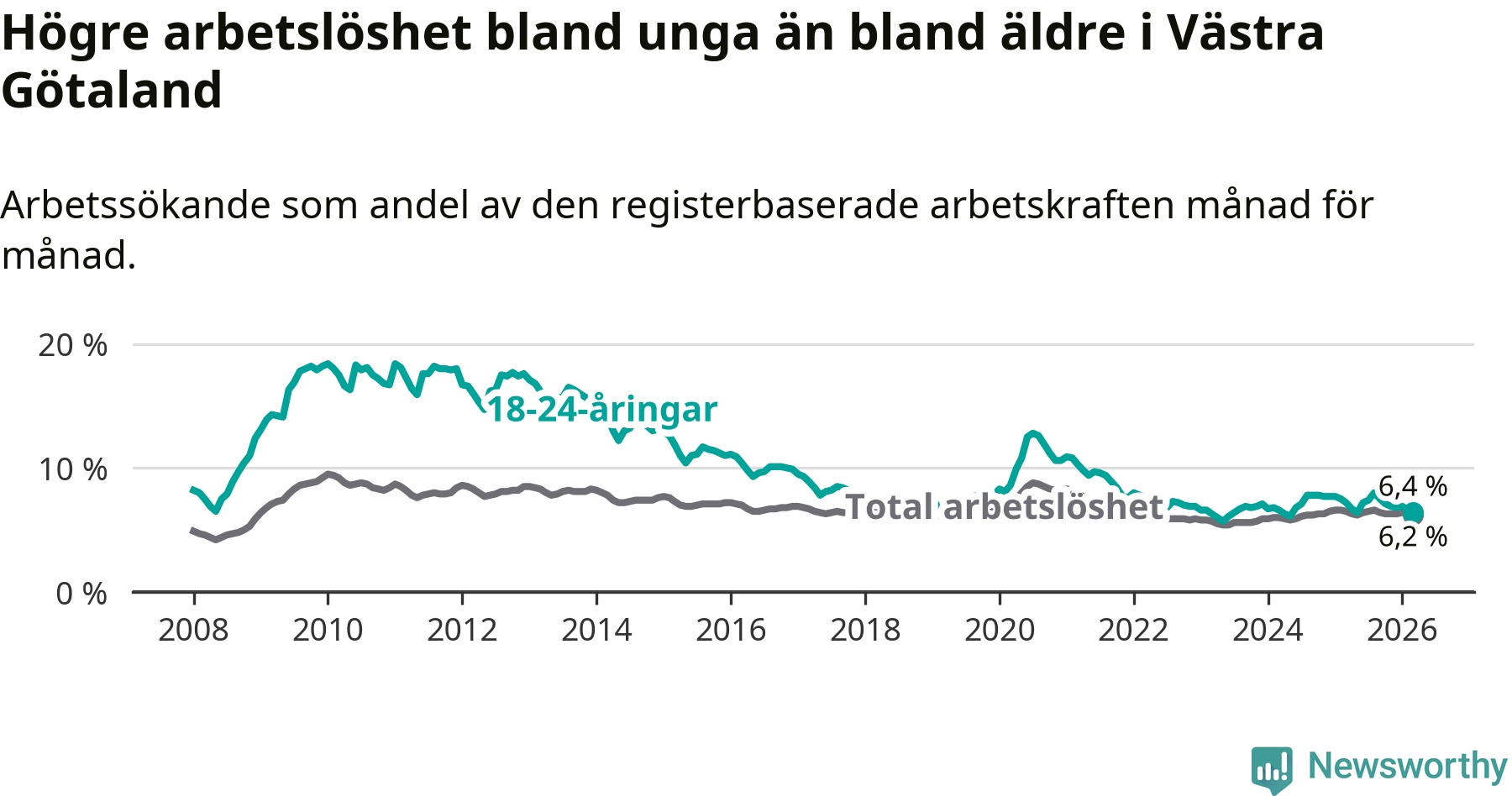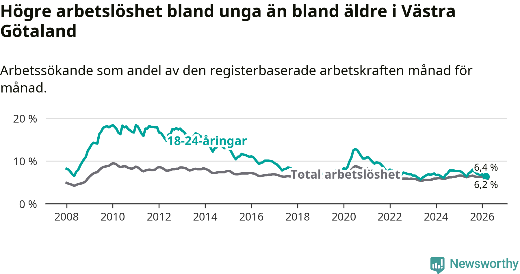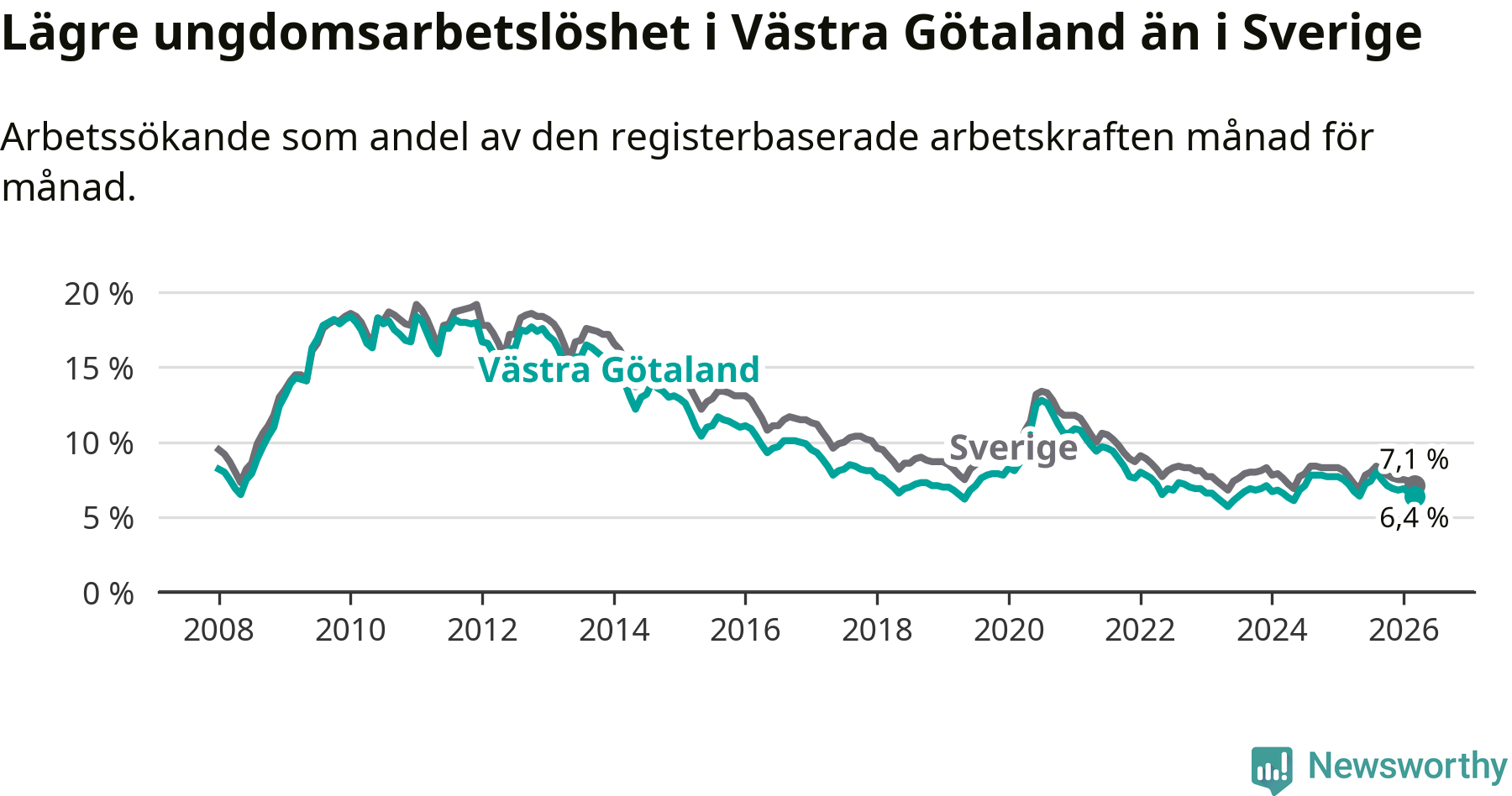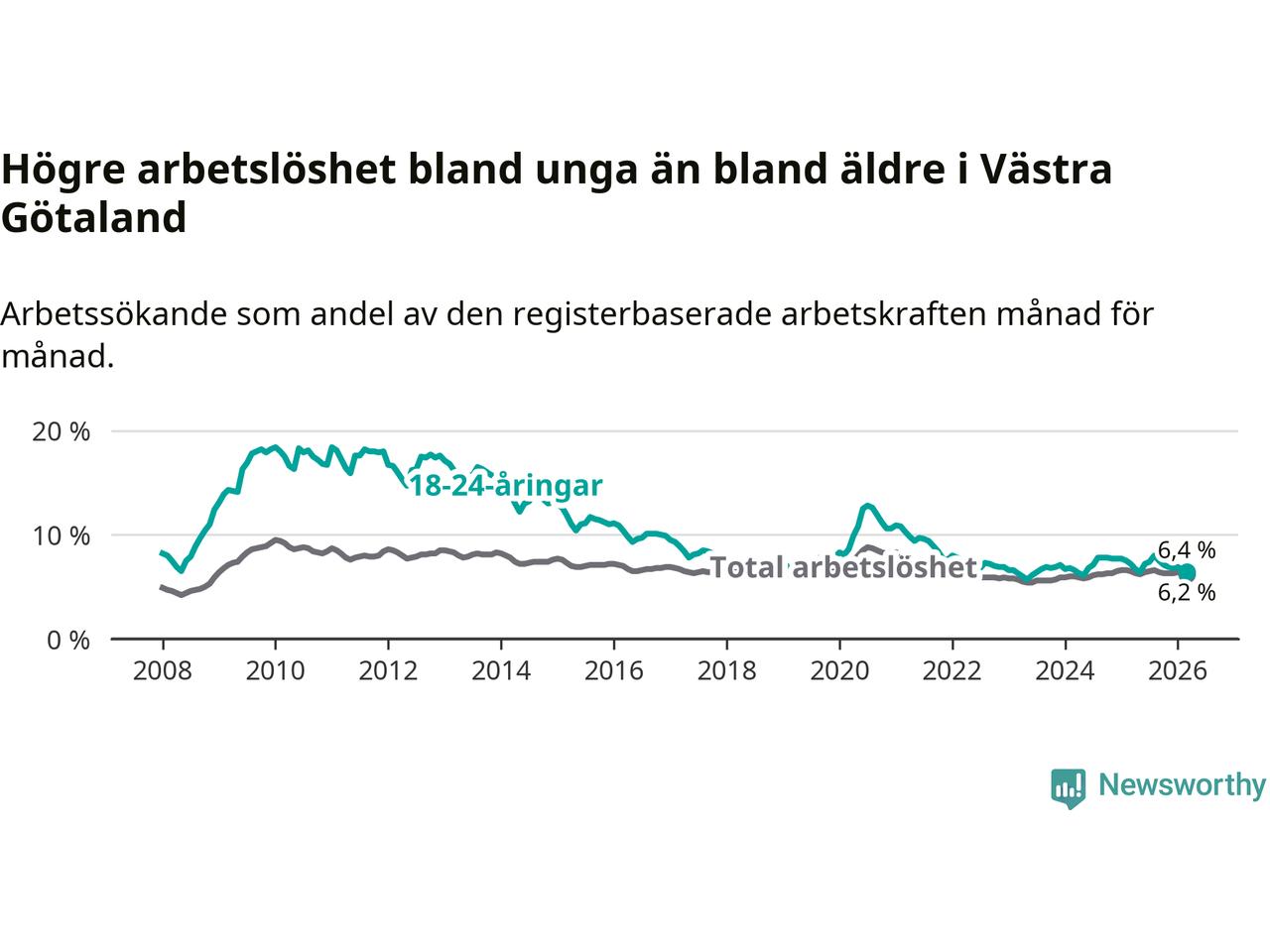 I och med den senaste månadens nedgång har de ungas arbetslöshet i Västra Götaland sjunkit sju månader i följd (ner från 8,0 procent i augusti 2025 till 6,4 procent nu).