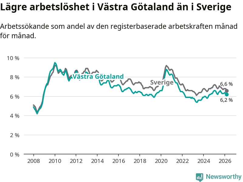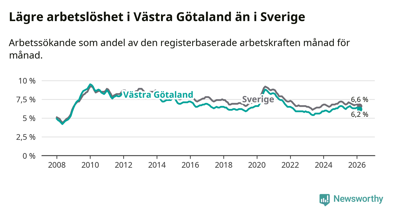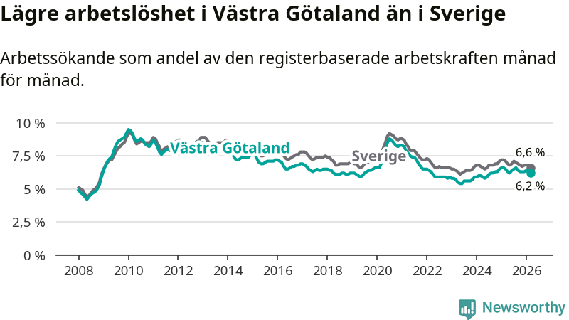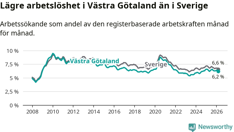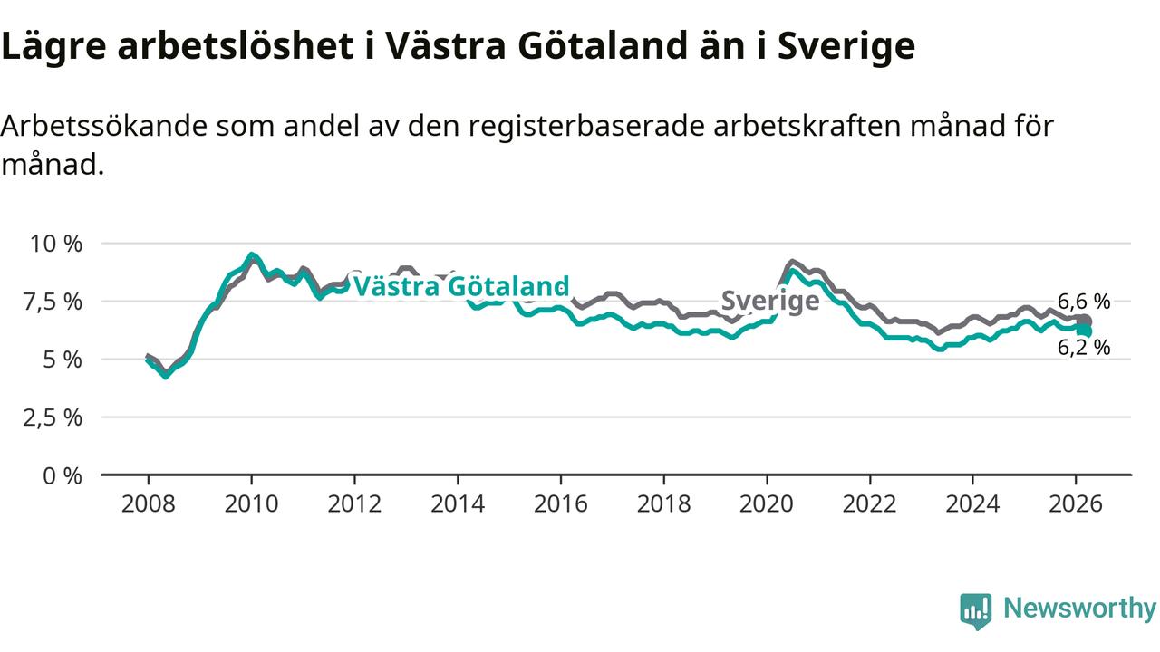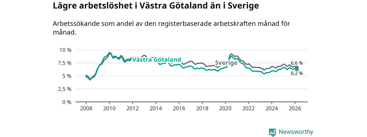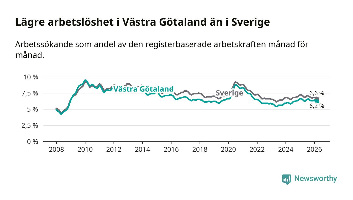 Under mars månad rapporterade Västra Götalands län en total arbetslöshet på 6,2 procent. Det är en minskning jämfört med samma tidpunkt i fjol (−0,3 procentenheter). Även i Sverige sjunker arbetslösheten .