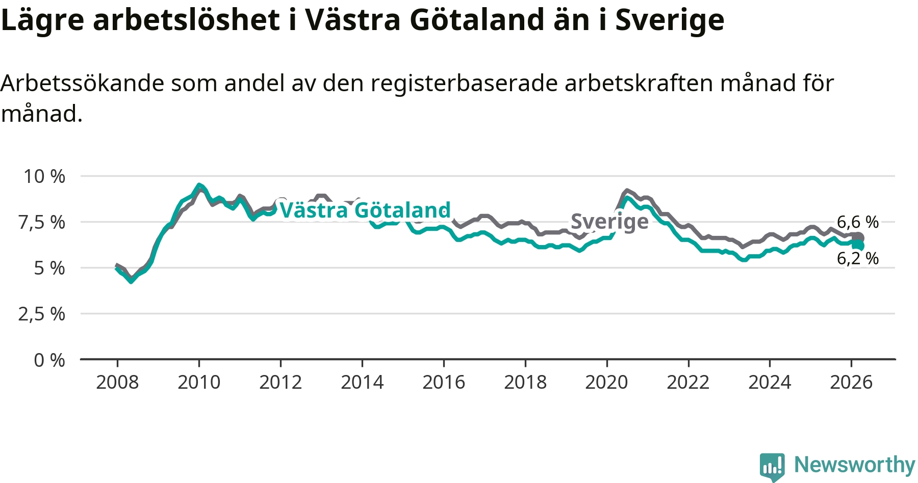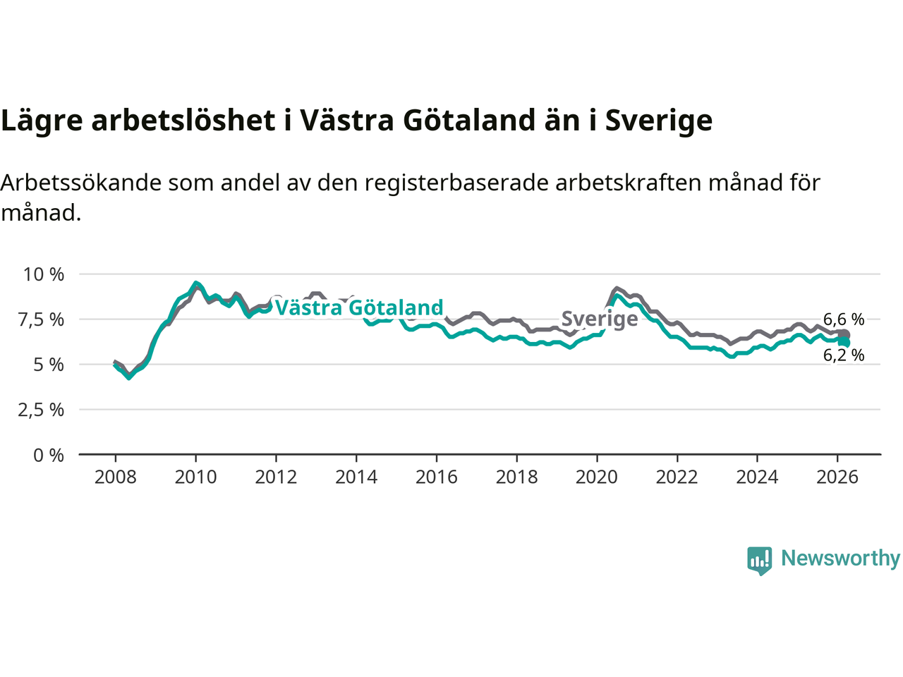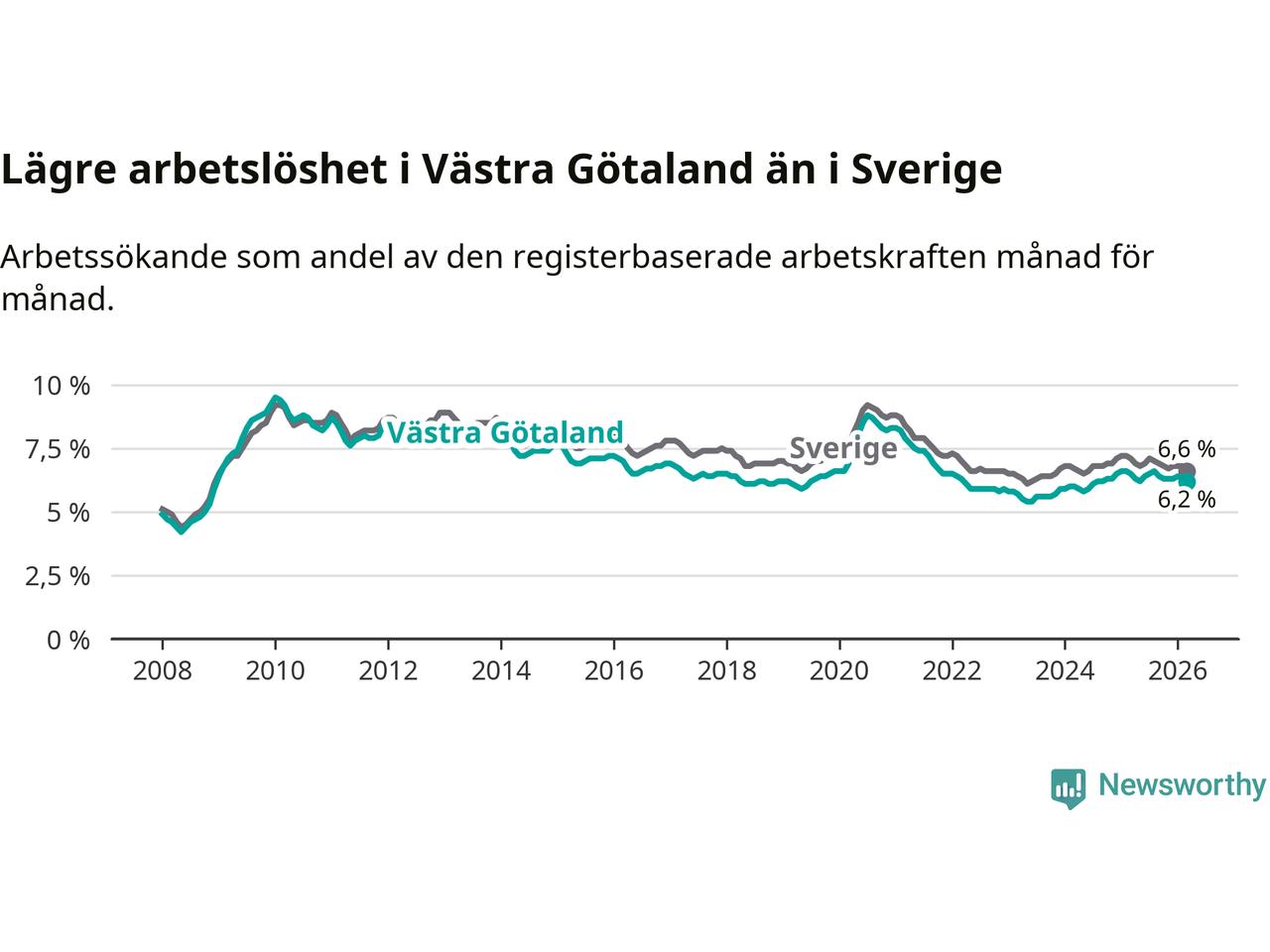 Västra Götaland hade redan tidigare lägre arbetslöshet än snittet i hela Sverige och nu växer klyftan (6,2 procent i länet, jämfört med 6,6 procent i hela riket). Norrbotten har den lägsta arbetslösheten i riket (3,8 procent), medan Skåne har den högsta (8,6 procent). För att Västra Götaland skulle komma ner i samma arbetslöshetsnivå som Norrbotten skulle 21 794 personer behöva sysselsättas.