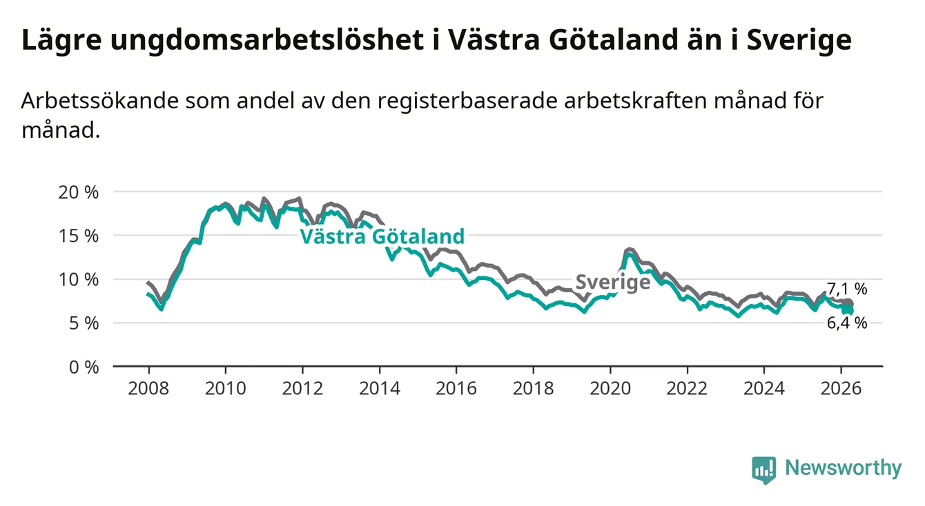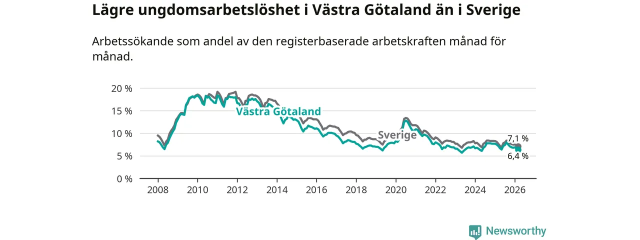 Precis som den totala arbetslösheten ligger ungdomsarbetslösheten i Västra Götaland lägre än i Sverige som helhet. Skillnaden mellan länet och riket är 0,7 procentenheter.