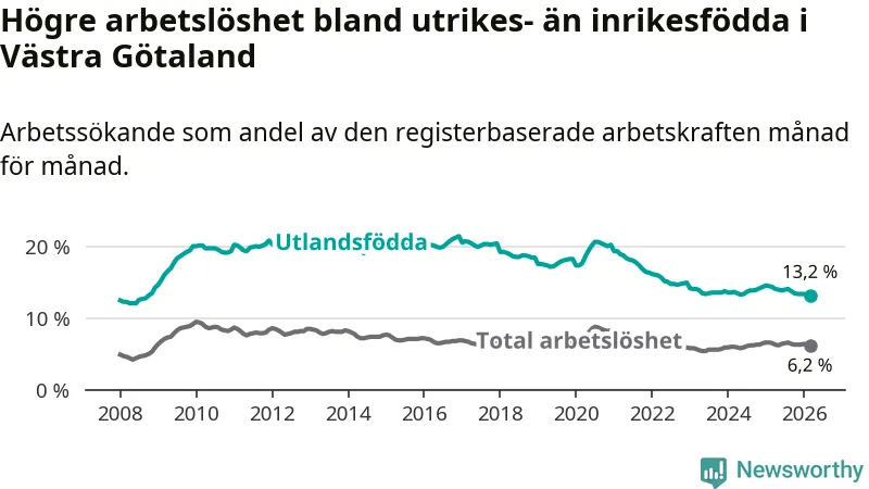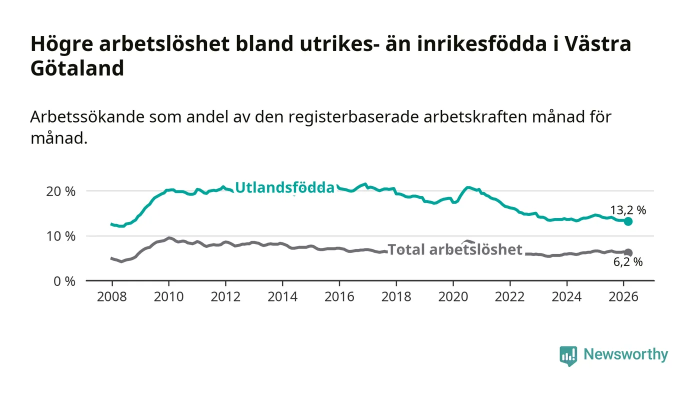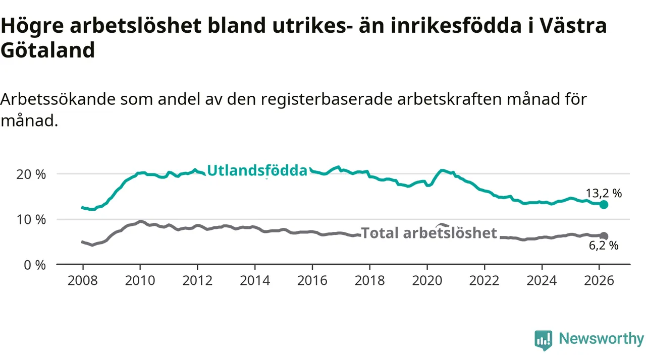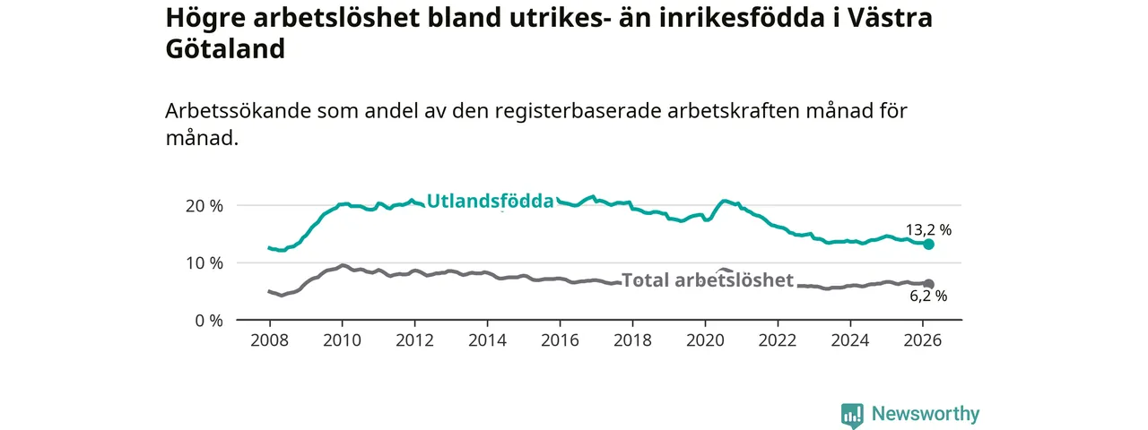 Arbetslösheten bland utlandsfödda var 13,2 procent i Västra Götaland under mars månad, motsvarande 29 561 av 223 947 personer. Det är 1,2 procentenheter färre än vid samma tidpunkt i fjol (−2 126 om man räknar personer). Därmed är de utlandsföddas arbetslöshet lägre än vid samma tidpunkt i fjol för sjunde månaden i följd. Den nuvarande arbetslöshetsnivån är den lägsta sedan oktober 2008.