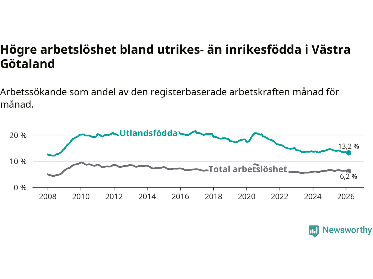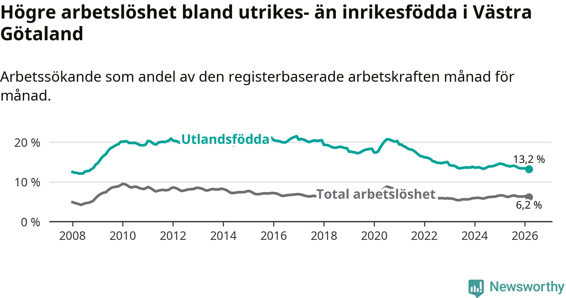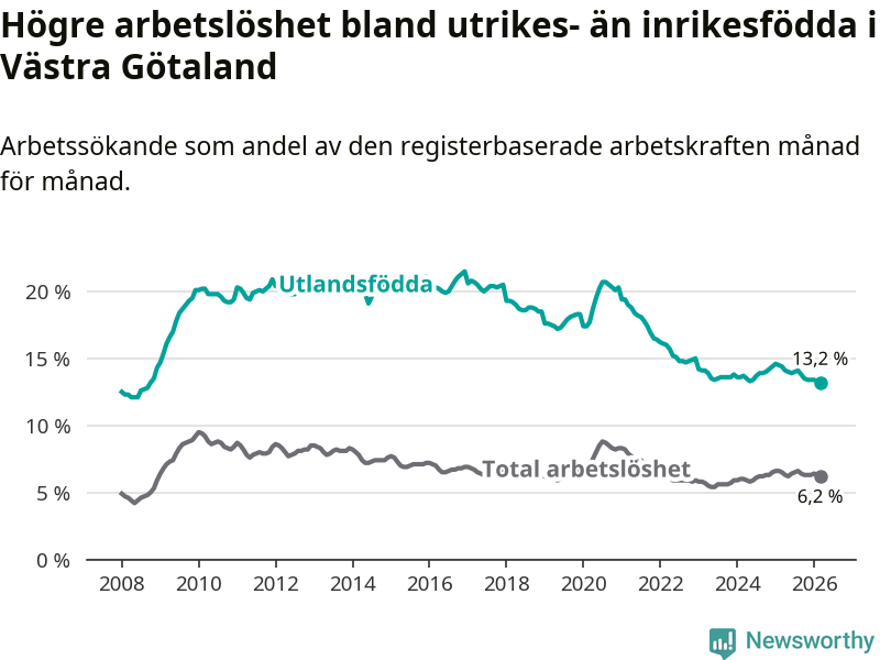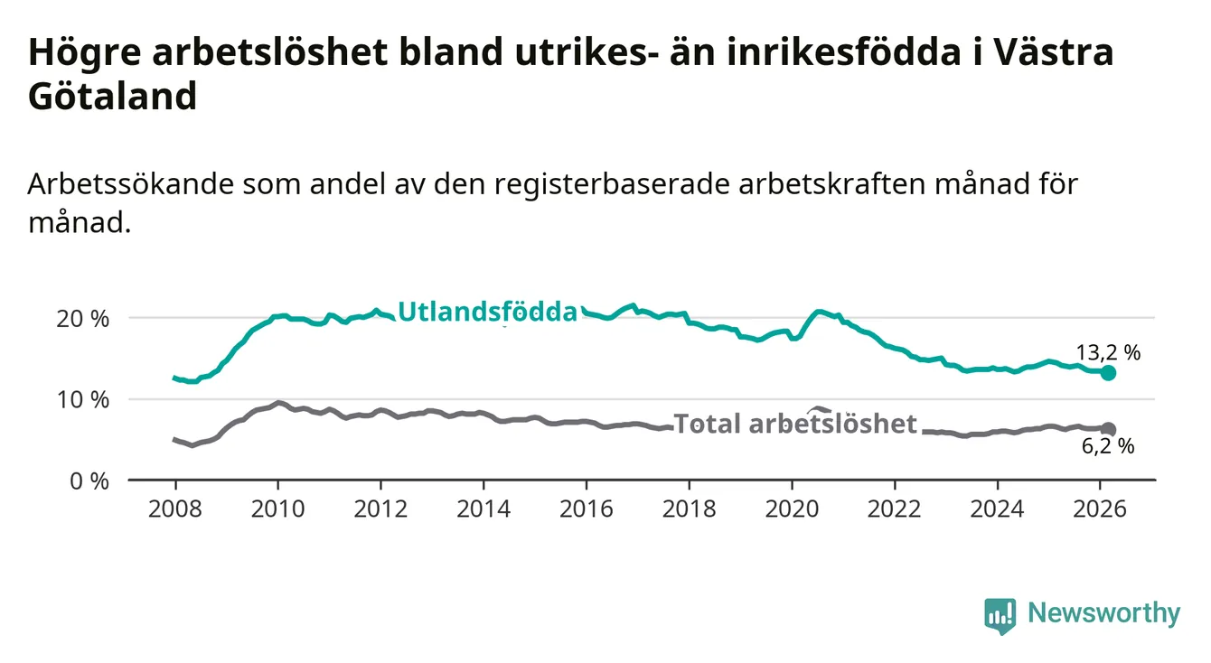 Arbetslösheten bland utlandsfödda var 13,2 procent i Västra Götaland under mars månad, motsvarande 29 561 av 223 947 personer. Det är 1,2 procentenheter färre än vid samma tidpunkt i fjol (−2 126 om man räknar personer). Därmed är de utlandsföddas arbetslöshet lägre än vid samma tidpunkt i fjol för sjunde månaden i följd. Den nuvarande arbetslöshetsnivån är den lägsta sedan oktober 2008.