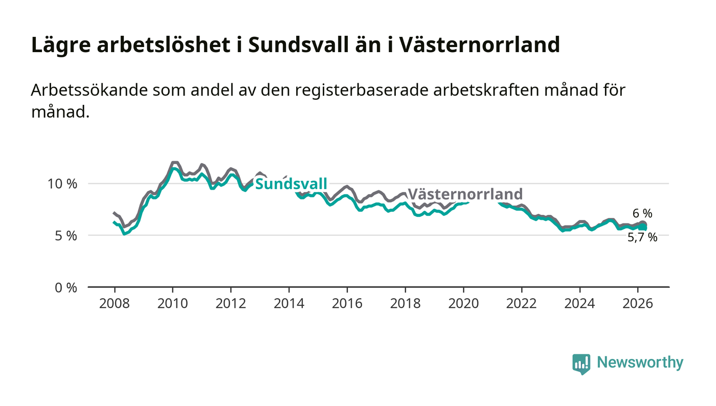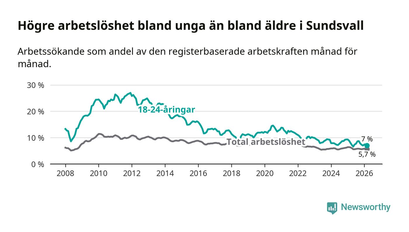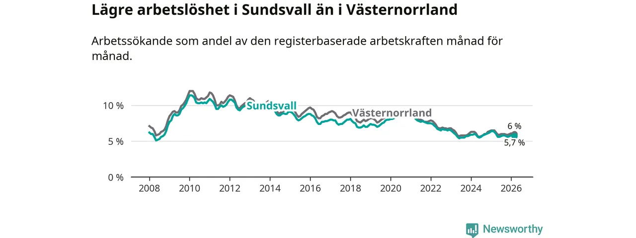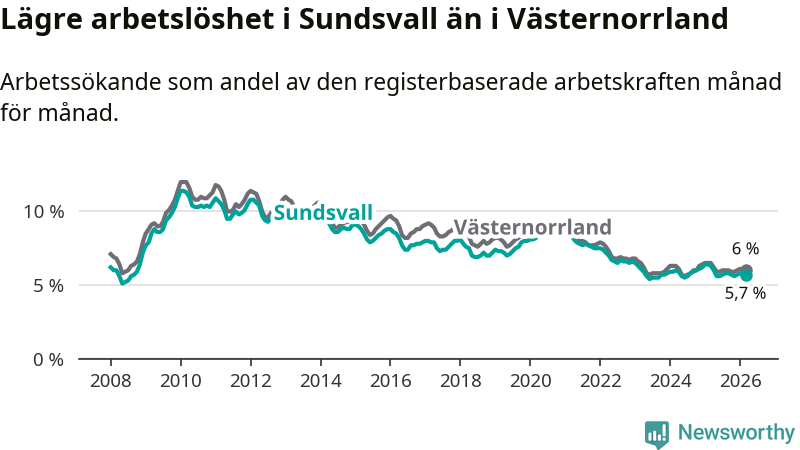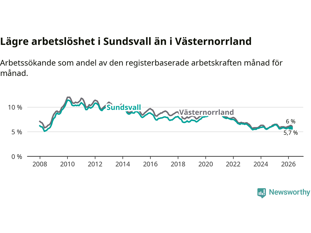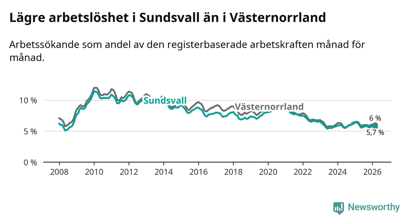 Under mars månad rapporterade Sundsvalls kommun en total arbetslöshet på 5,7 procent. Det är en minskning jämfört med samma tidpunkt i fjol (−0,6 procentenheter). Även i Västernorrlands län sjunker arbetslösheten .