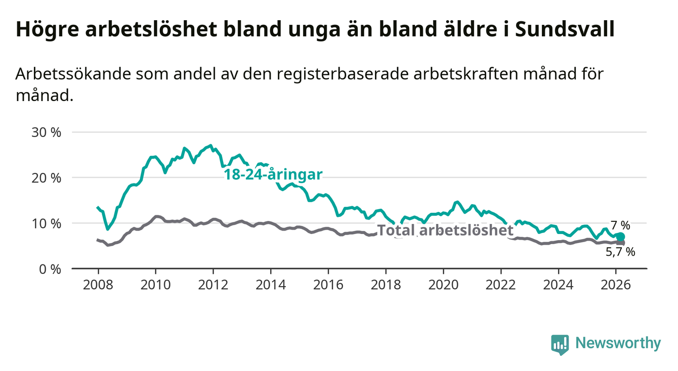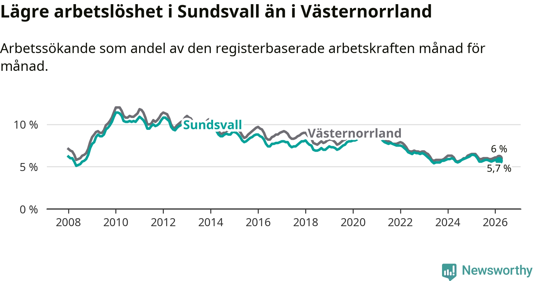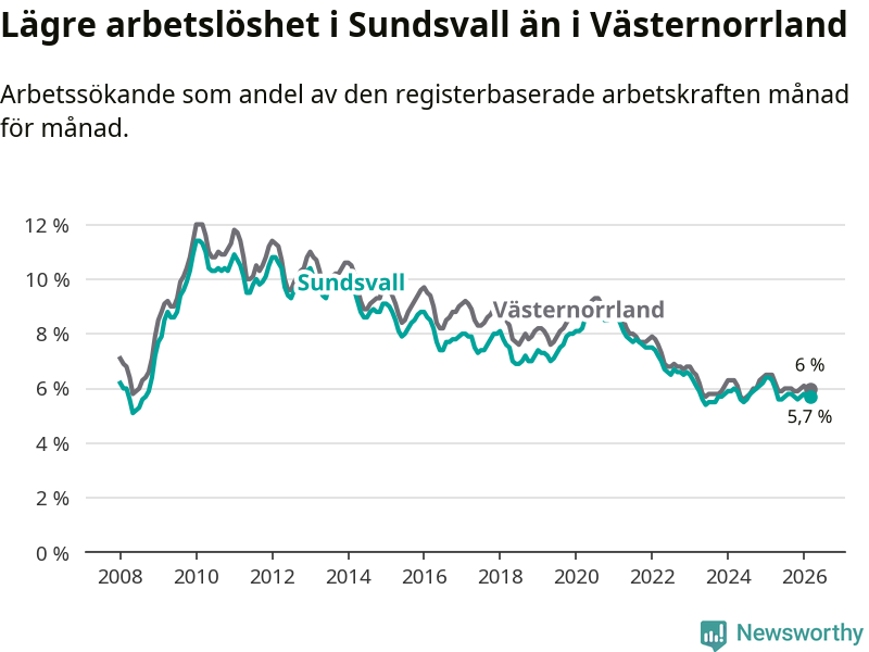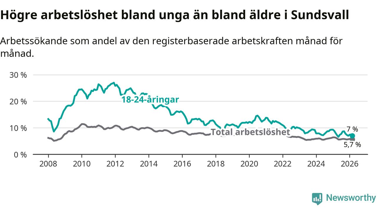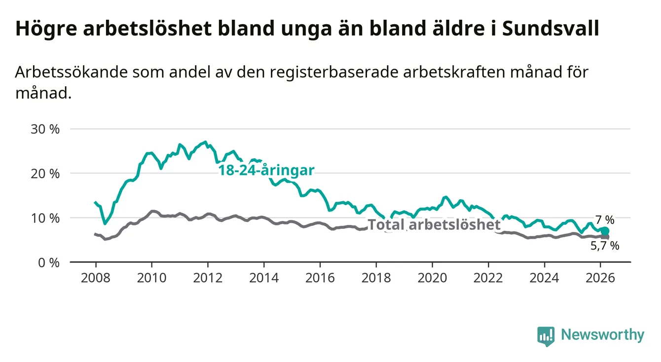 Under mars månad rapporterade Sundsvalls kommun en total arbetslöshet på 5,7 procent. Det är en minskning jämfört med samma tidpunkt i fjol (−0,6 procentenheter). Även i Västernorrlands län sjunker arbetslösheten .