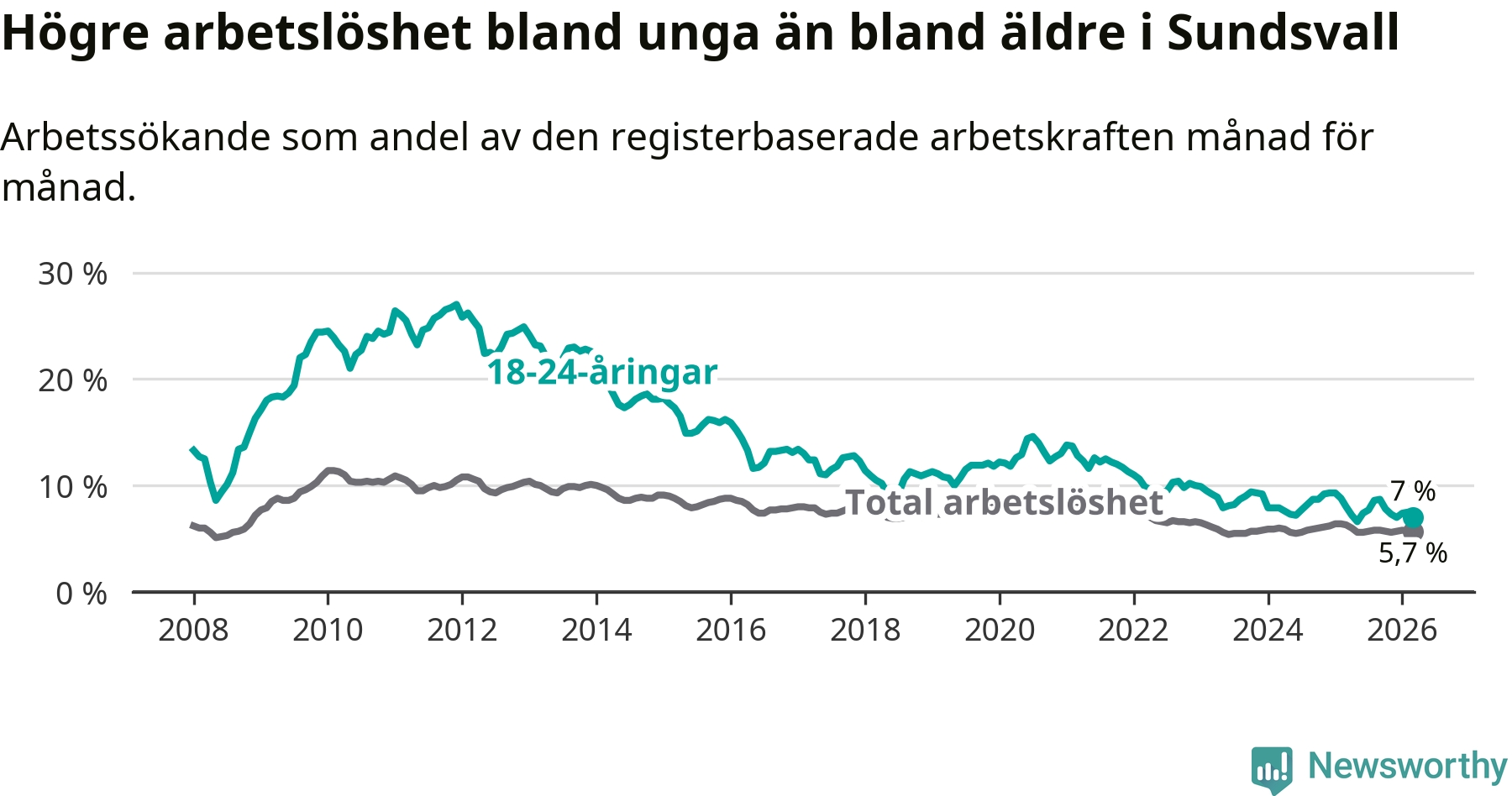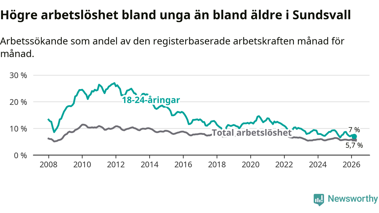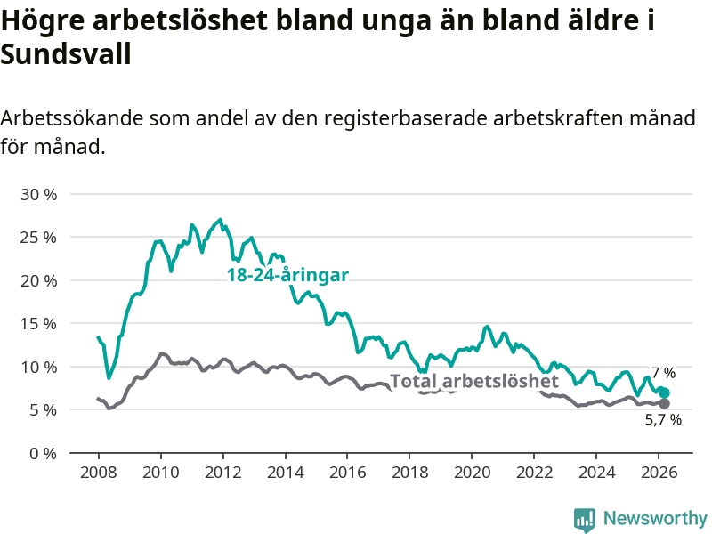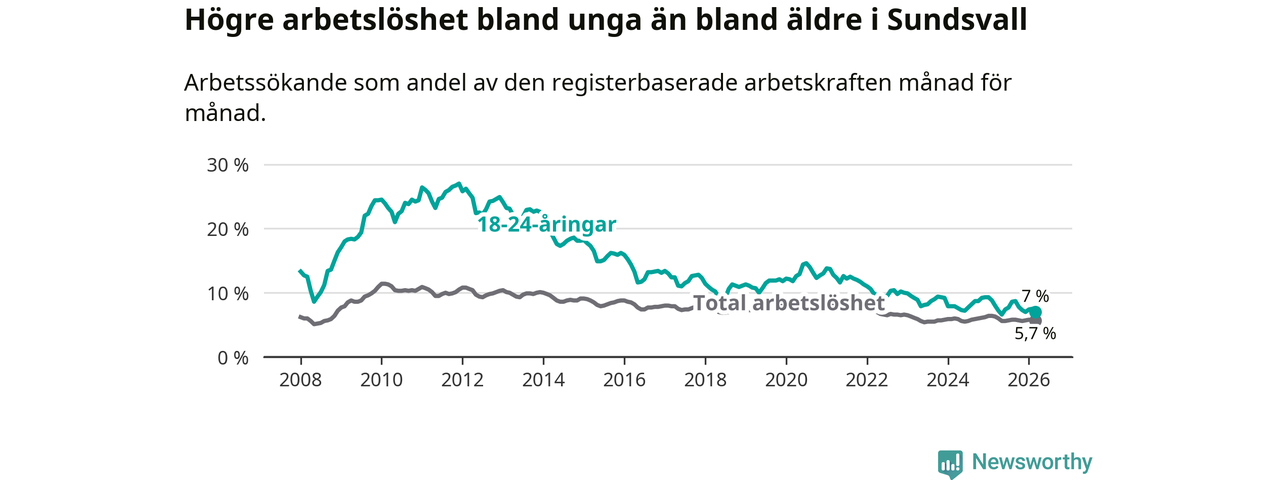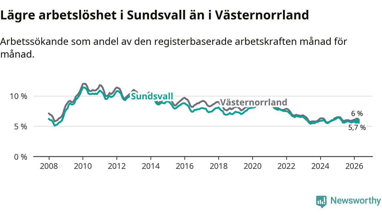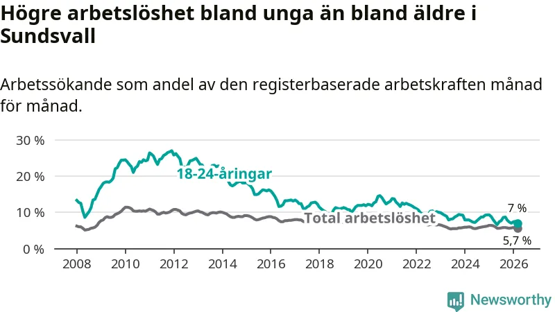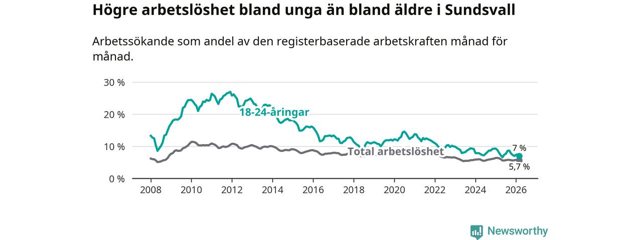 Under mars månad rapporterade Sundsvalls kommun en total arbetslöshet på 5,7 procent. Det är en minskning jämfört med samma tidpunkt i fjol (−0,6 procentenheter). Även i Västernorrlands län sjunker arbetslösheten .