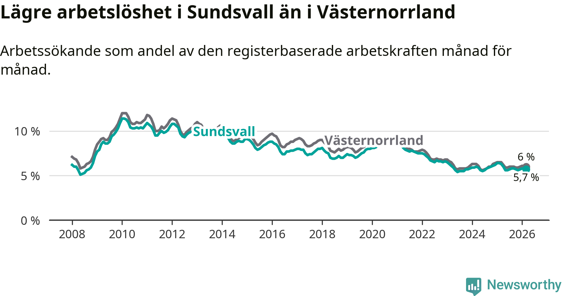 Sundsvall hade redan tidigare lägre arbetslöshet än snittet i hela Västernorrlands län och nu växer klyftan (5,7 procent i kommunen, jämfört med 6,0 procent i hela länet). Örnsköldsvik har den lägsta arbetslösheten i länet (5,2 procent), medan Härnösand har den högsta (8,0 procent). För att Sundsvall skulle komma ner i samma arbetslöshetsnivå som Örnsköldsvik skulle 251 personer behöva sysselsättas.
