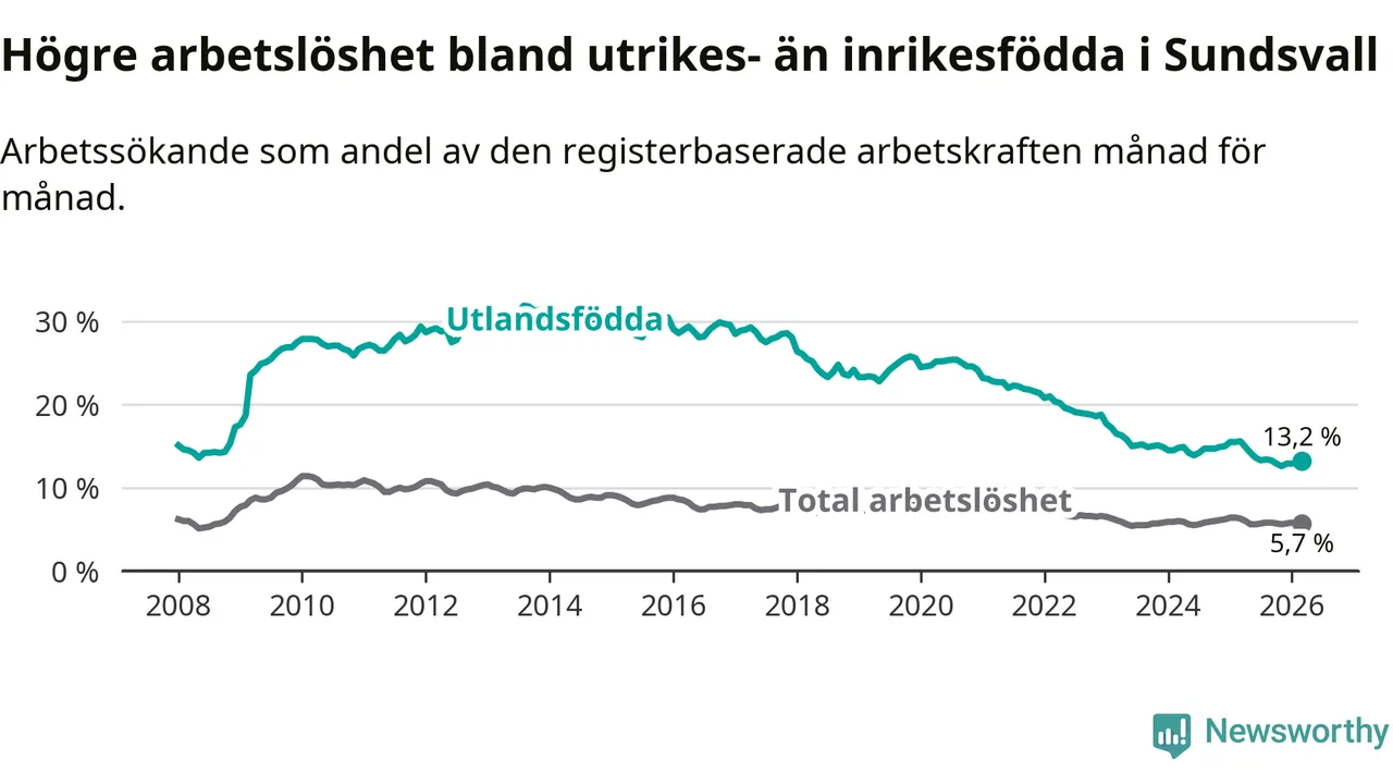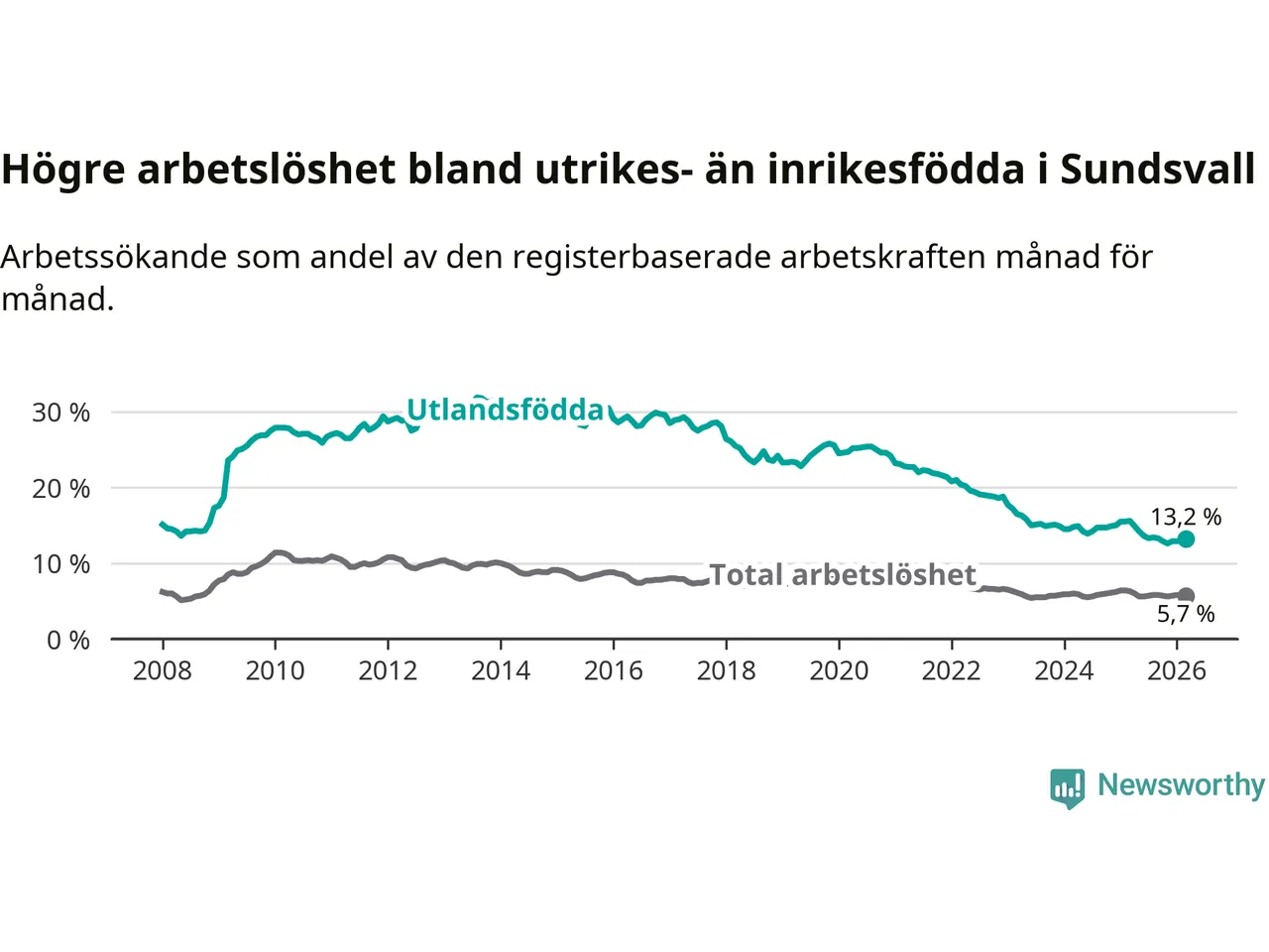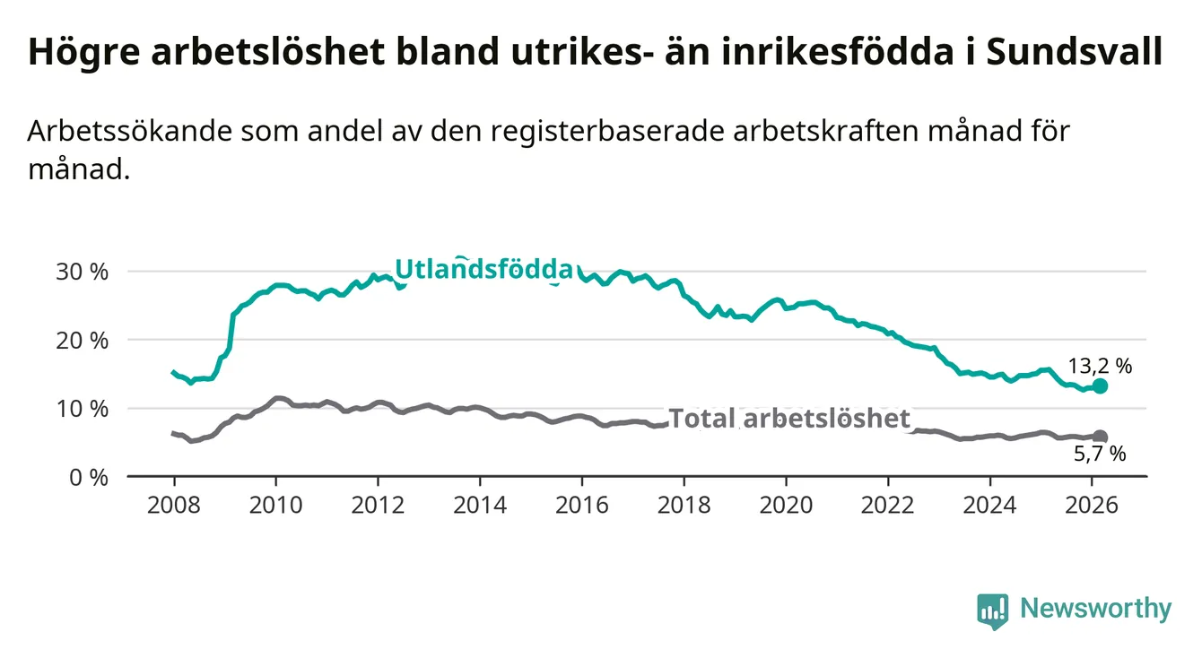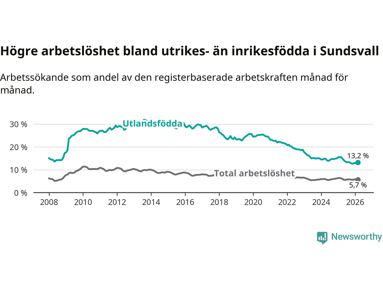 Arbetslösheten bland utlandsfödda var 13,2 procent i Sundsvall under mars månad, motsvarande 997 av 7 553 personer. Det är 2,4 procentenheter färre än vid samma tidpunkt i fjol (−153 om man räknar personer). Därmed är de utlandsföddas arbetslöshet lägre än vid samma tidpunkt i fjol för tionde månaden i följd.