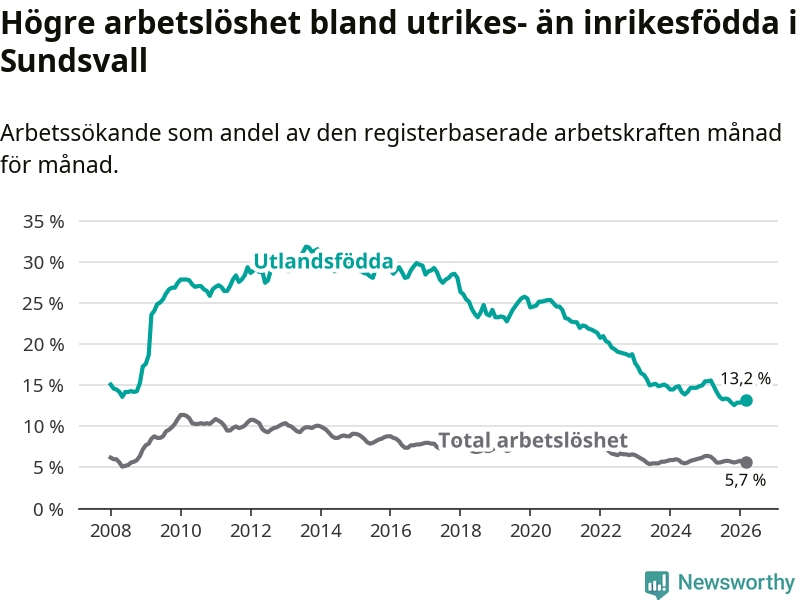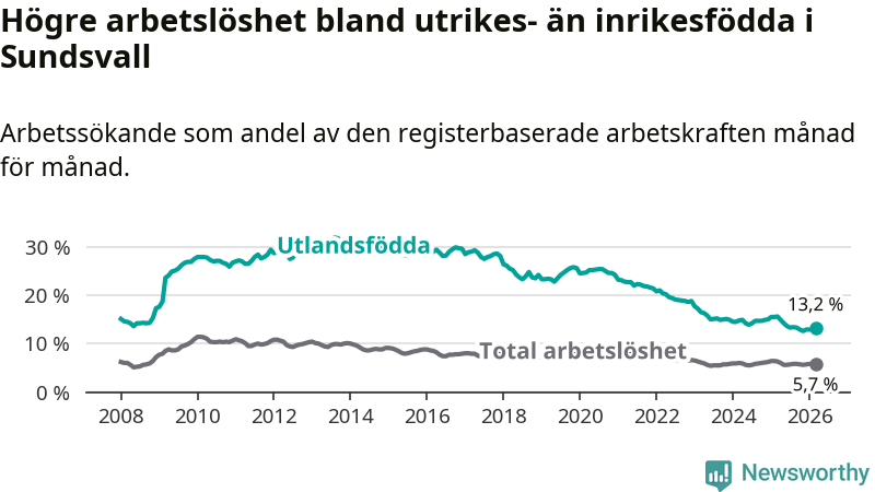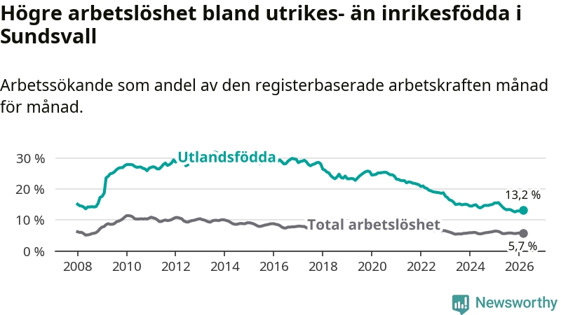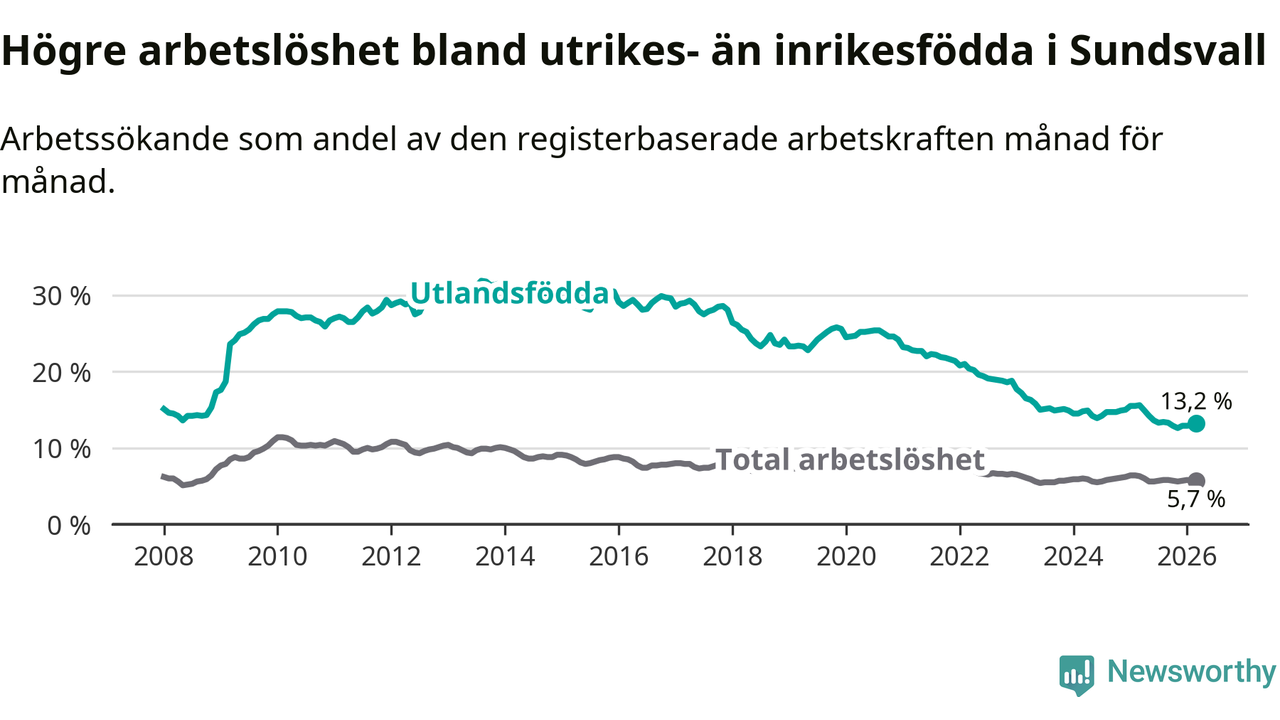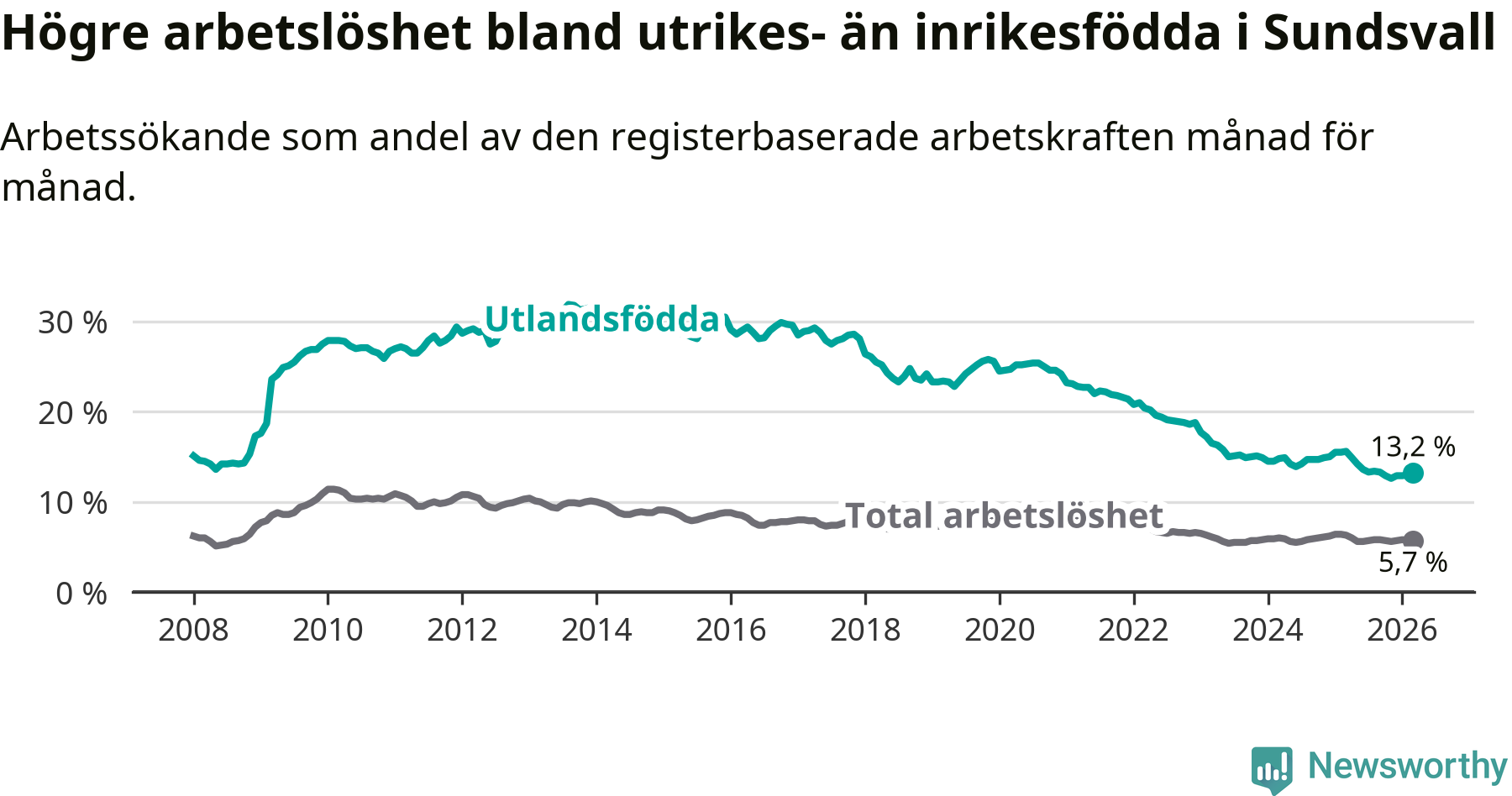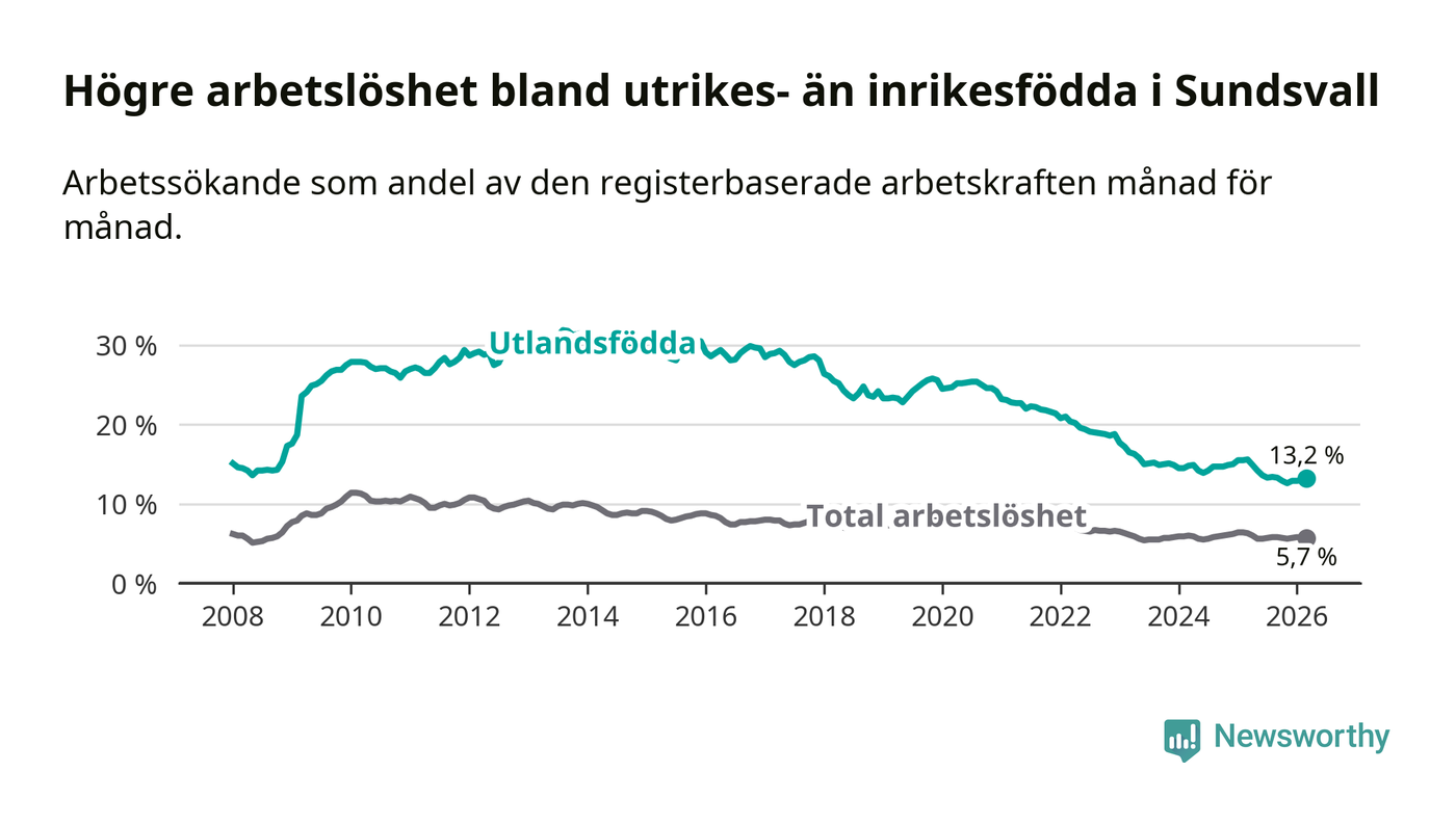 Arbetslösheten bland utlandsfödda var 13,2 procent i Sundsvall under mars månad, motsvarande 997 av 7 553 personer. Det är 2,4 procentenheter färre än vid samma tidpunkt i fjol (−153 om man räknar personer). Därmed är de utlandsföddas arbetslöshet lägre än vid samma tidpunkt i fjol för tionde månaden i följd.