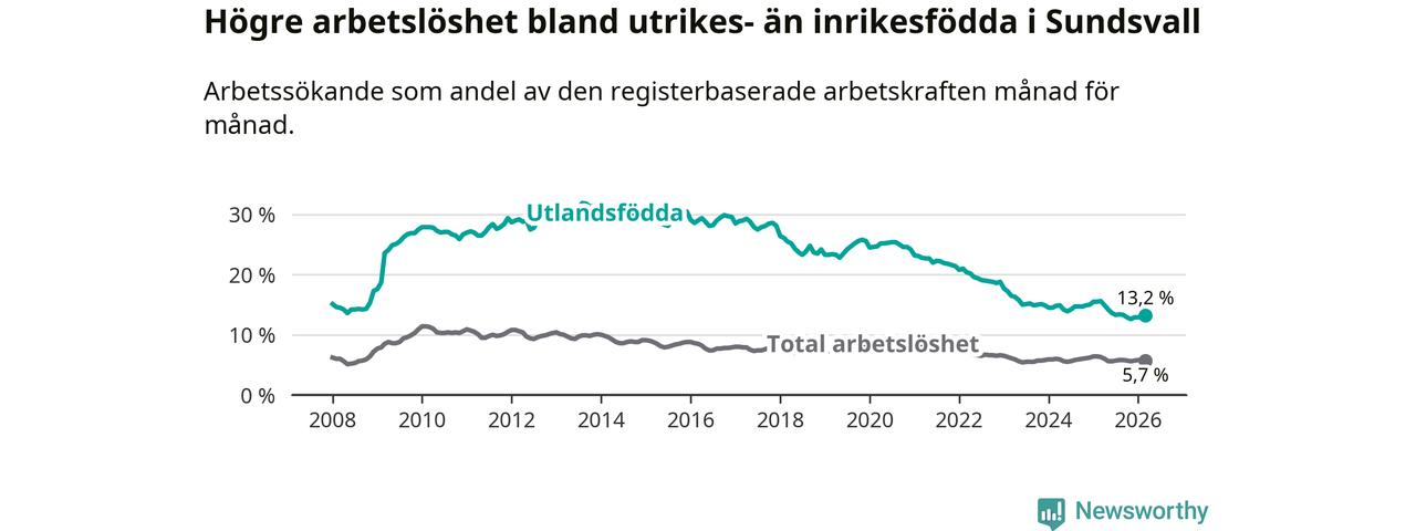 Skillnaden i arbetslöshet mellan utrikesfödda och hela befolkningen är 7,5 procentenheter i Sundsvall. Det är en betydligt mindre skillnad än för ett år sedan (−1,8 procentenheter).