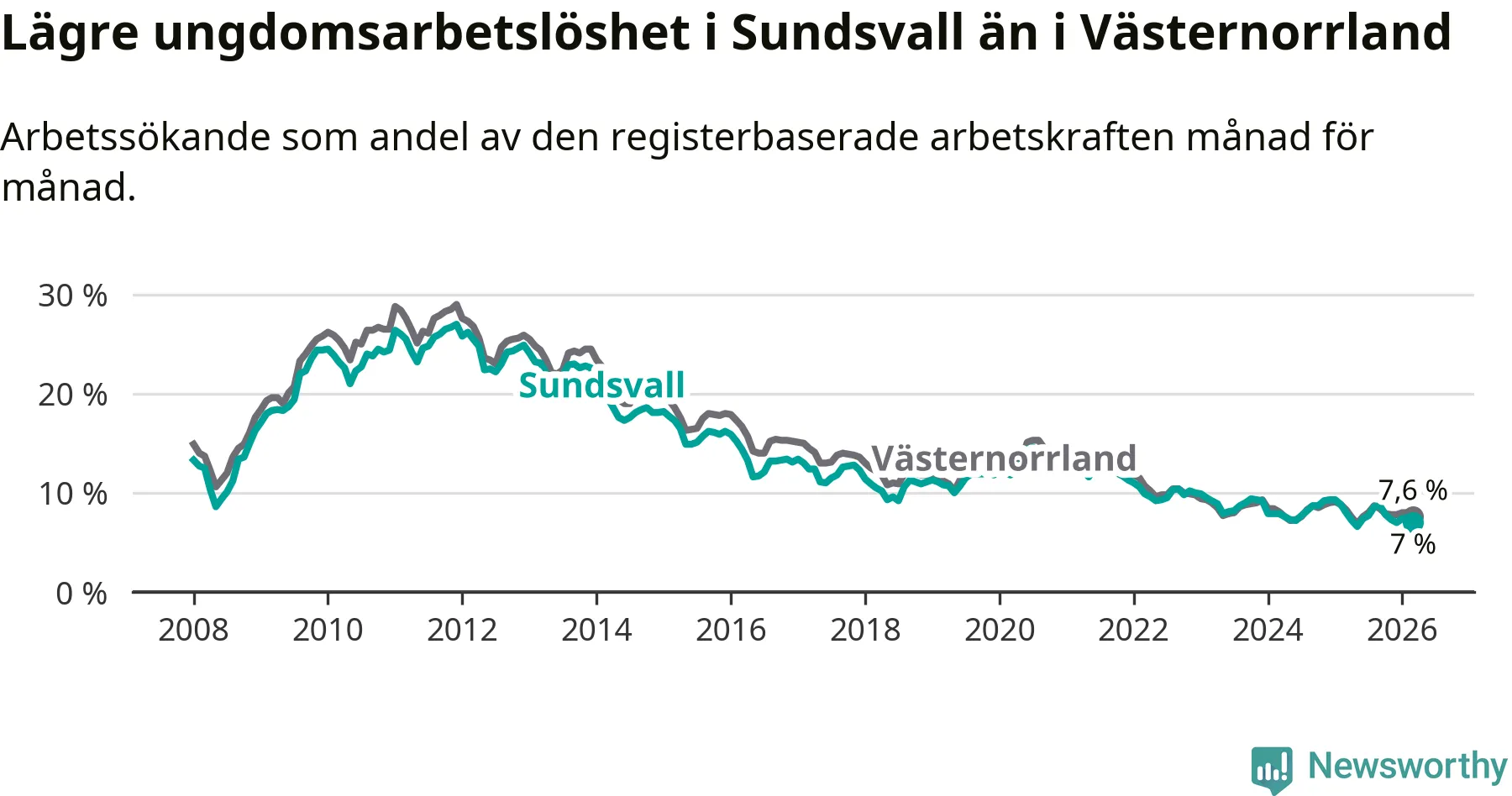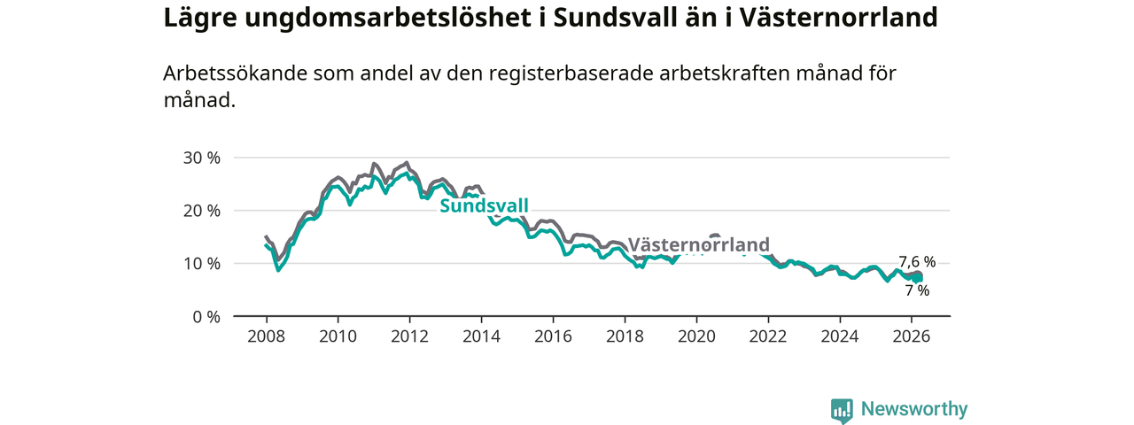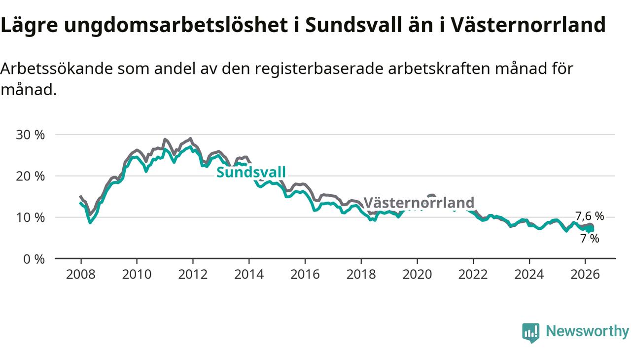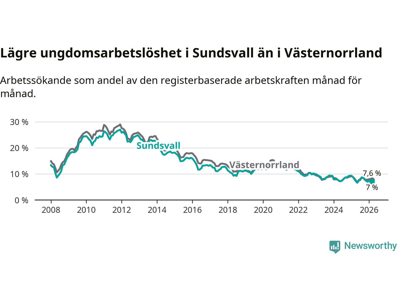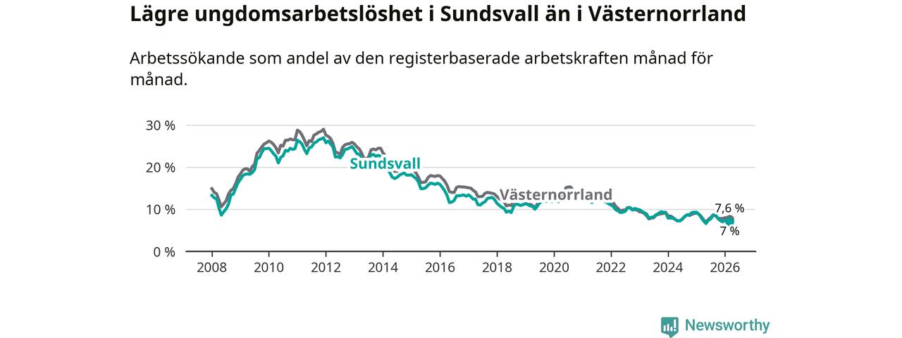 Precis som den totala arbetslösheten ligger ungdomsarbetslösheten i Sundsvall lägre än i Västernorrland som helhet. Skillnaden mellan kommunen och länet är 0,6 procentenheter.