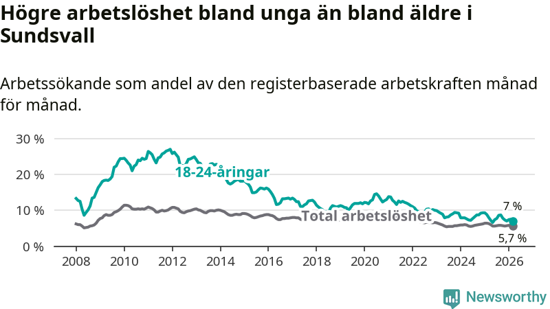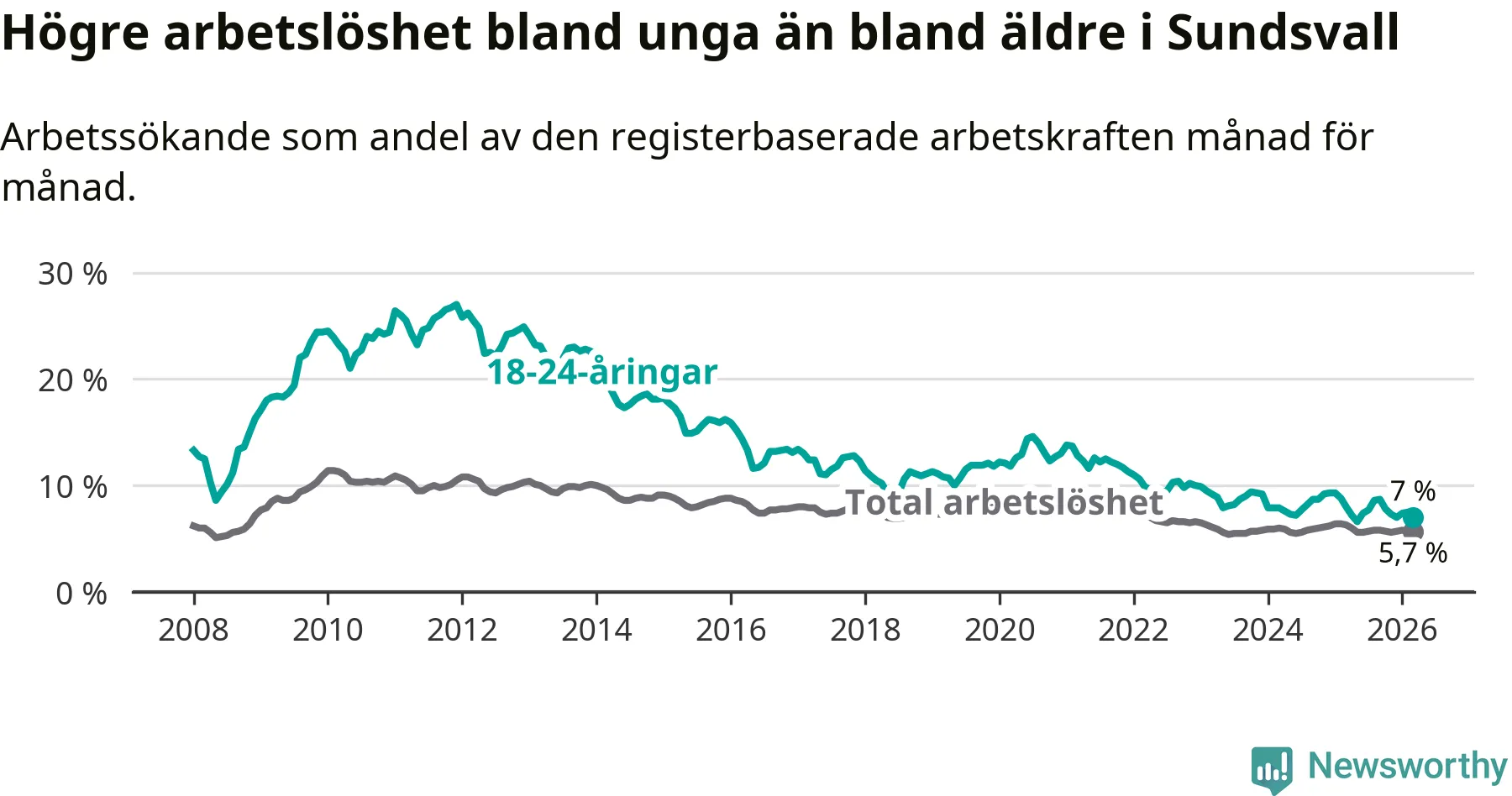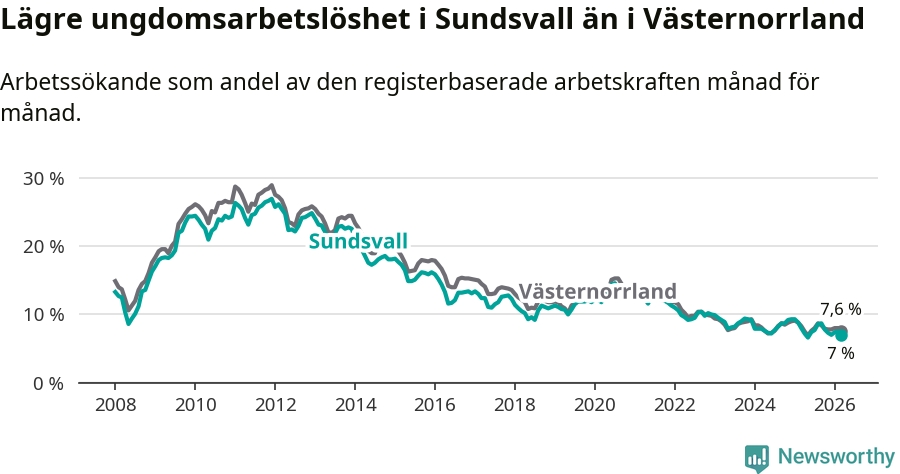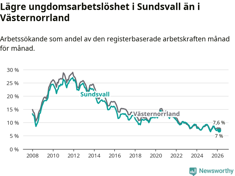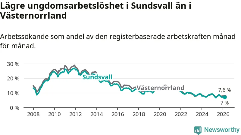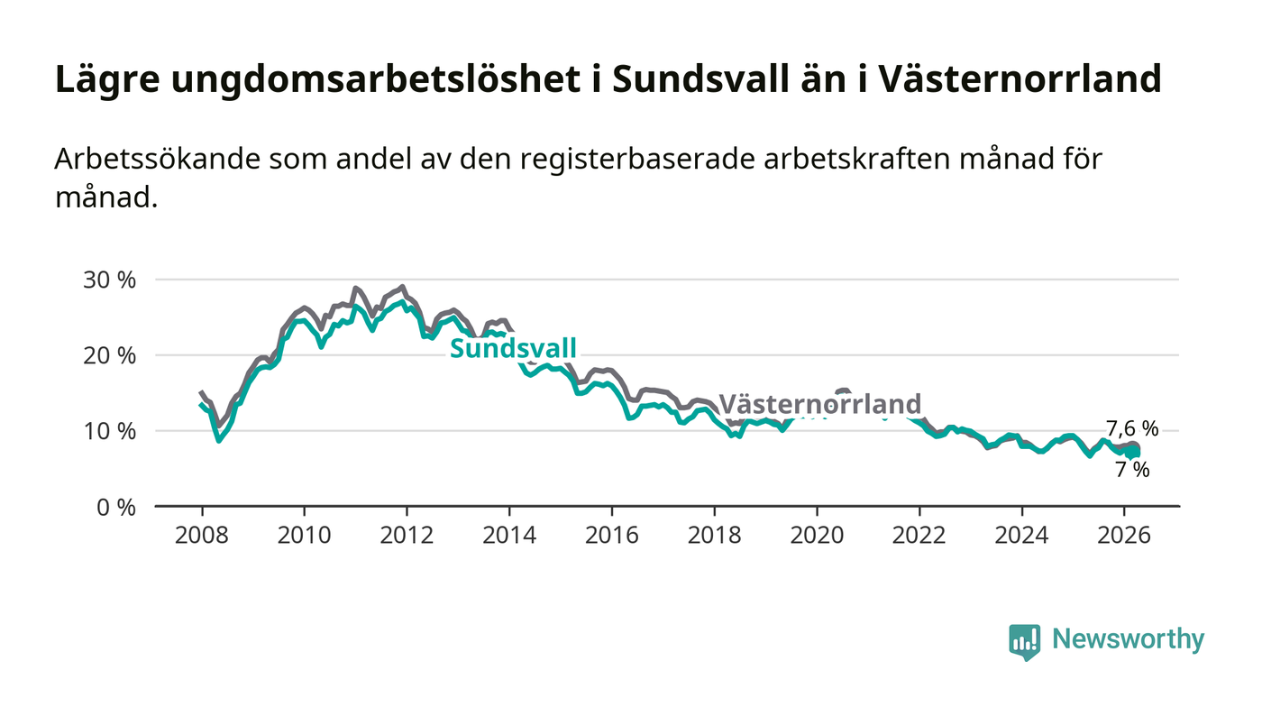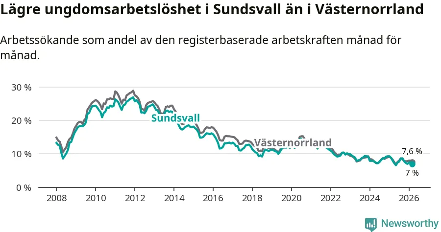Precis som den totala arbetslösheten ligger ungdomsarbetslösheten i Sundsvall lägre än i Västernorrland som helhet. Skillnaden mellan kommunen och länet är 0,6 procentenheter.