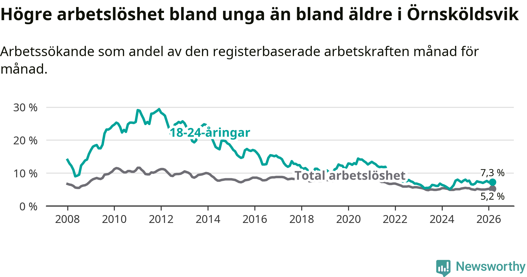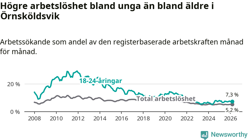 I mars var 7,3 procent av 18–24-åringarna inskrivna som arbetssökande (motsvarande 192 personer). Mäter vi antalet inskrivna ser vi en minskning med nio personer på ett års sikt.