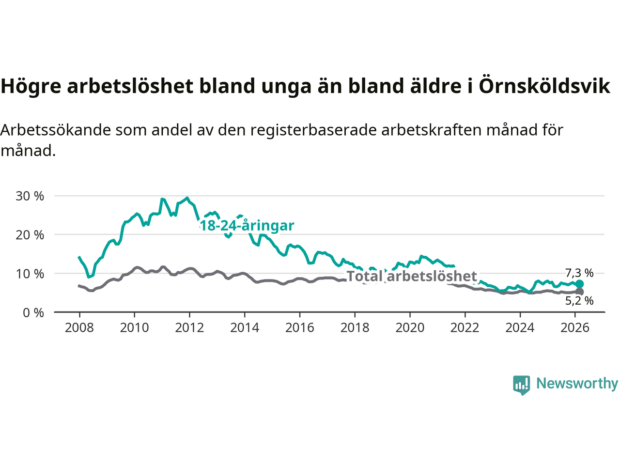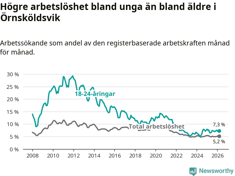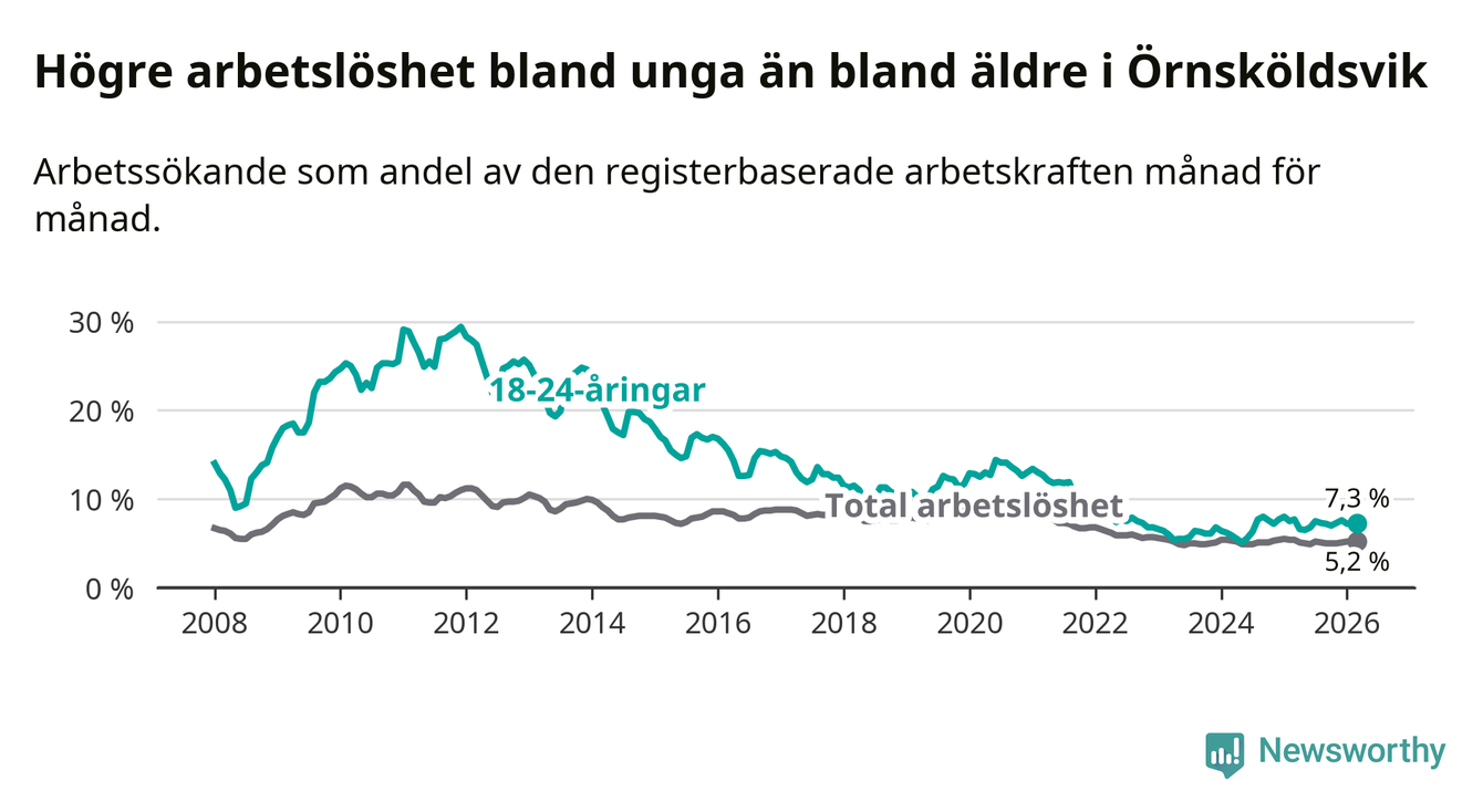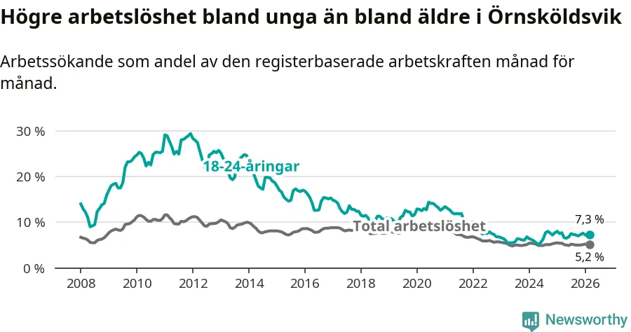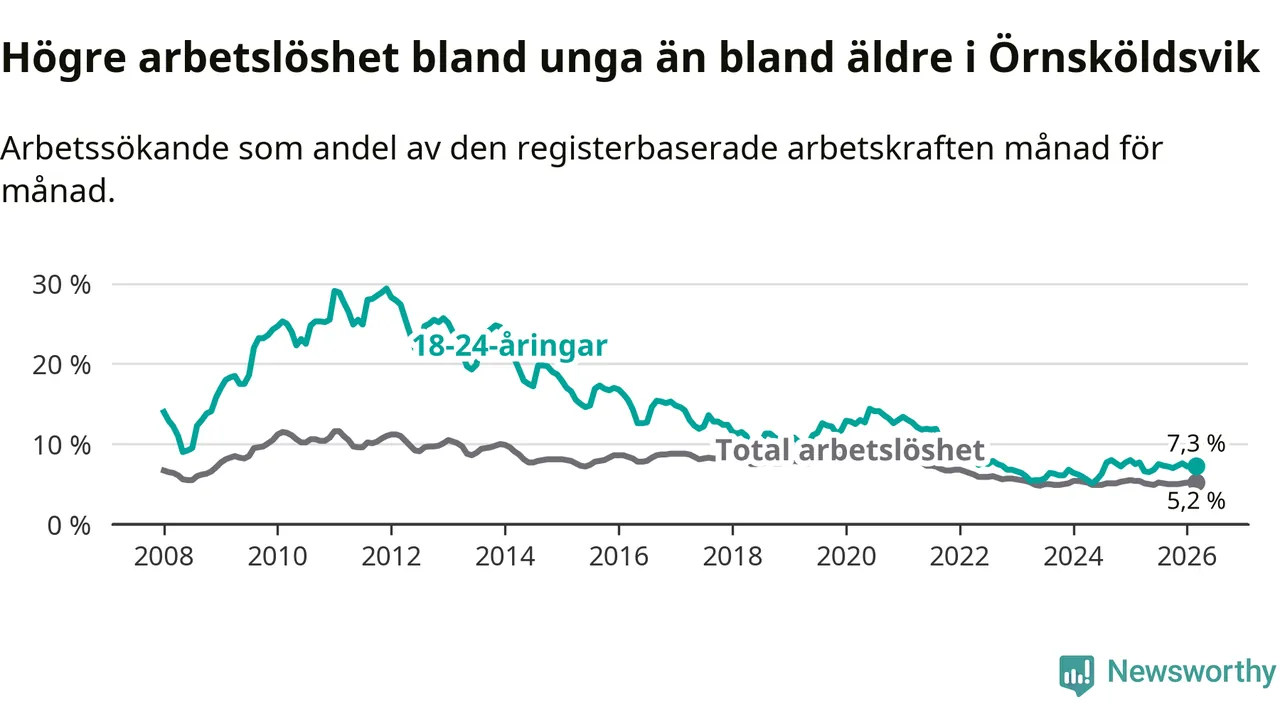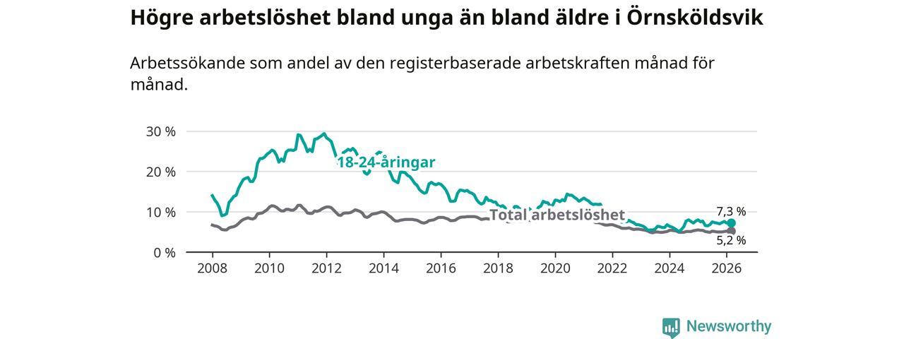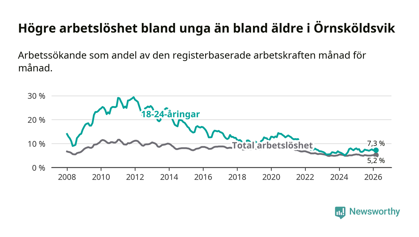 Under mars månad rapporterade Örnsköldsviks kommun en total arbetslöshet på 5,2 procent. Det är en minskning jämfört med samma tidpunkt i fjol (−0,2 procentenheter). Även i Västernorrlands län sjunker arbetslösheten .