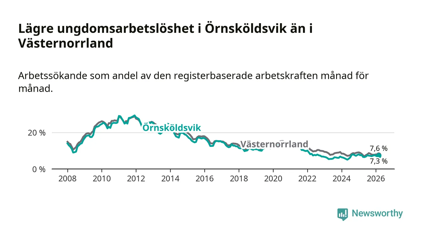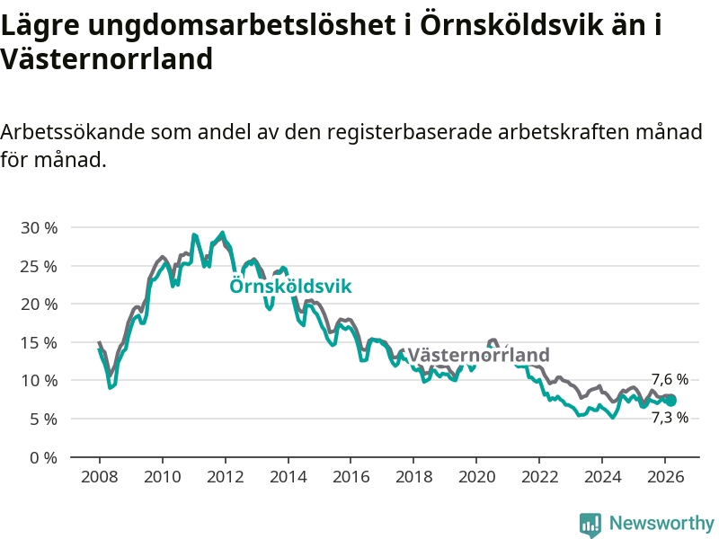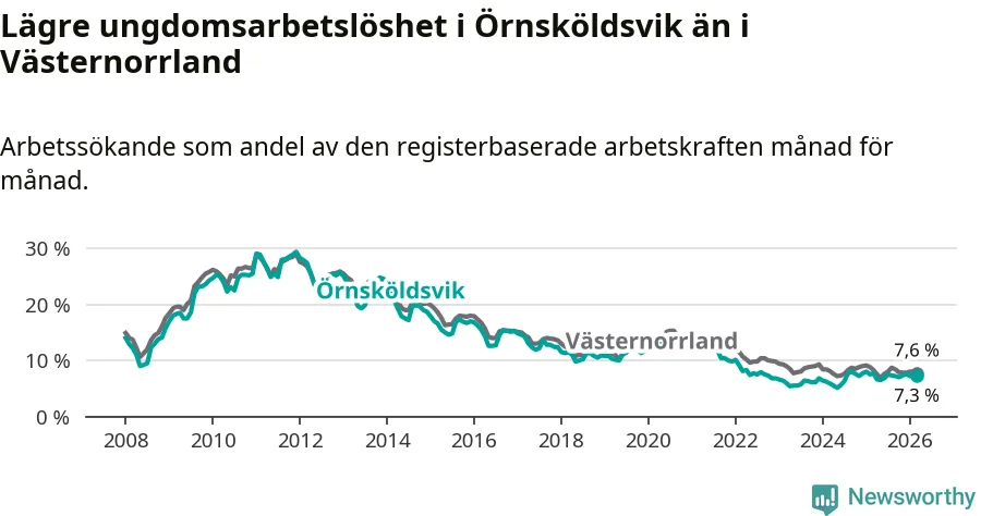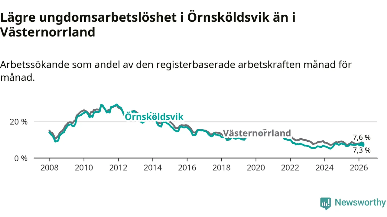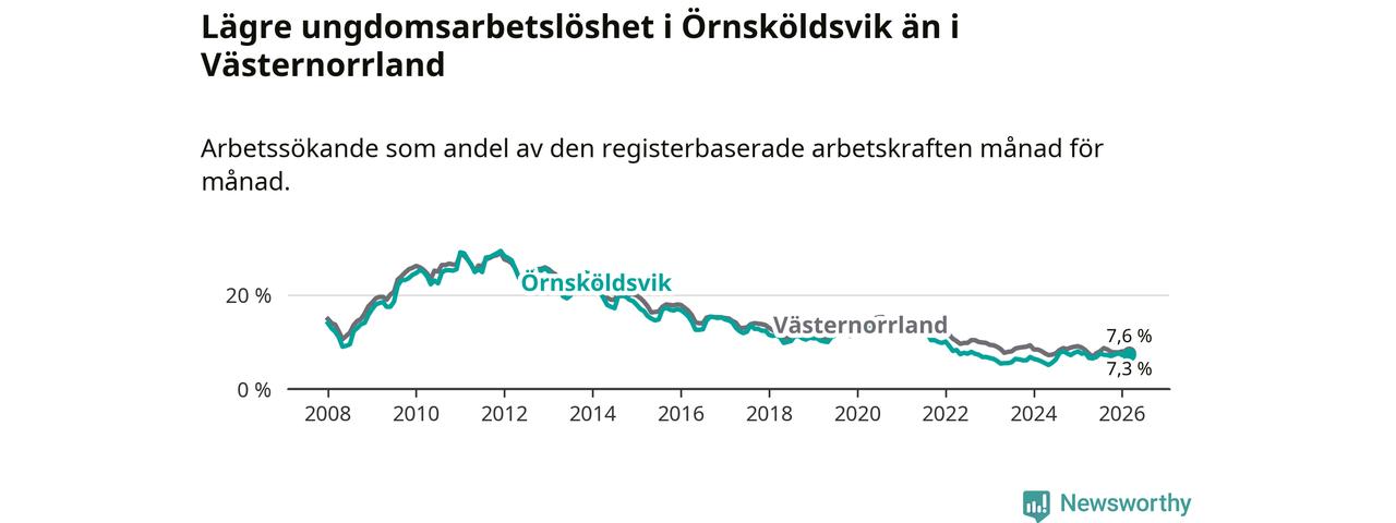 Precis som den totala arbetslösheten ligger ungdomsarbetslösheten i Örnsköldsvik lägre än i Västernorrland som helhet. Skillnaden mellan kommunen och länet är 0,3 procentenheter.