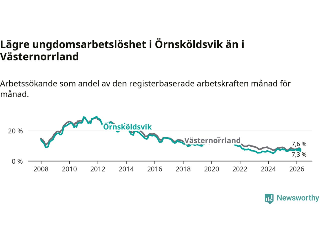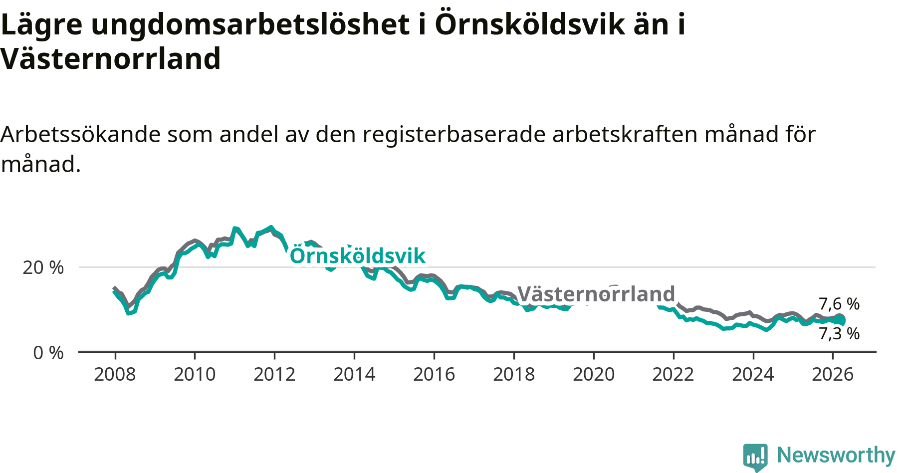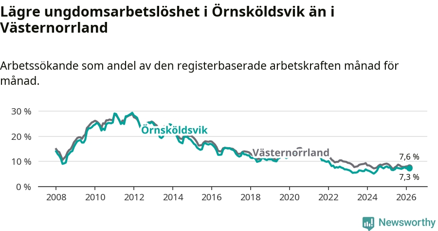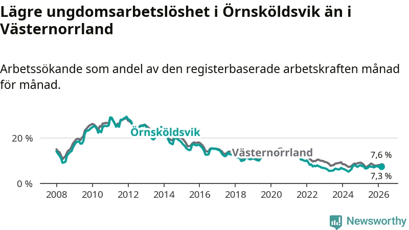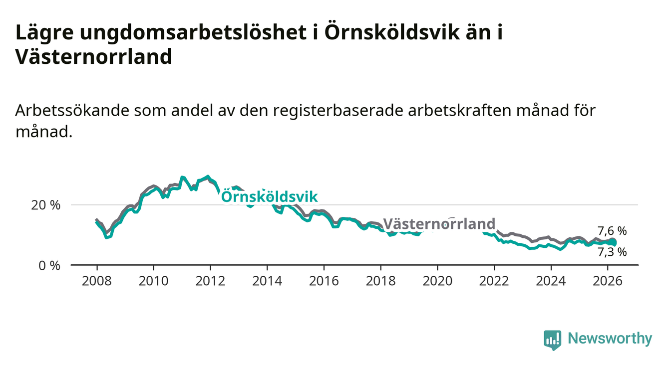Precis som den totala arbetslösheten ligger ungdomsarbetslösheten i Örnsköldsvik lägre än i Västernorrland som helhet. Skillnaden mellan kommunen och länet är 0,3 procentenheter.